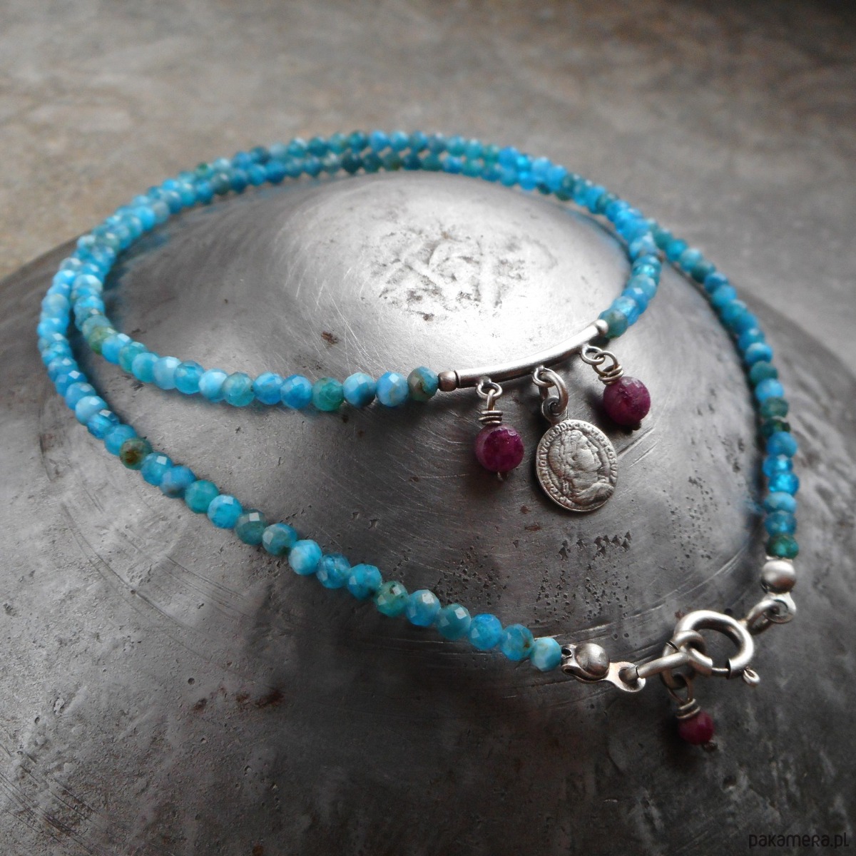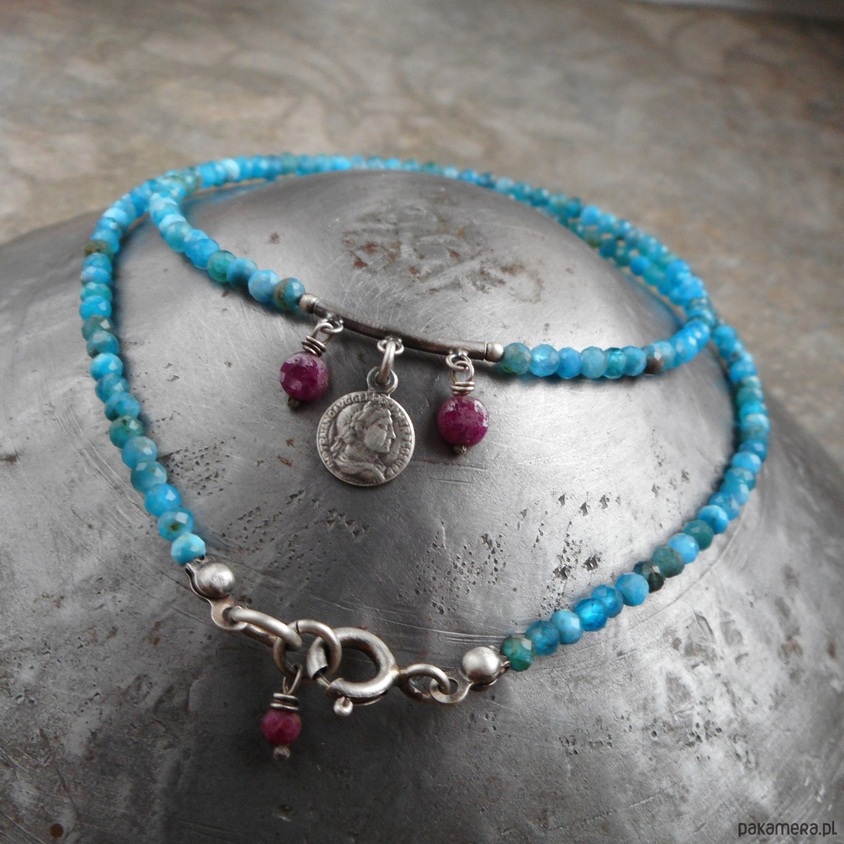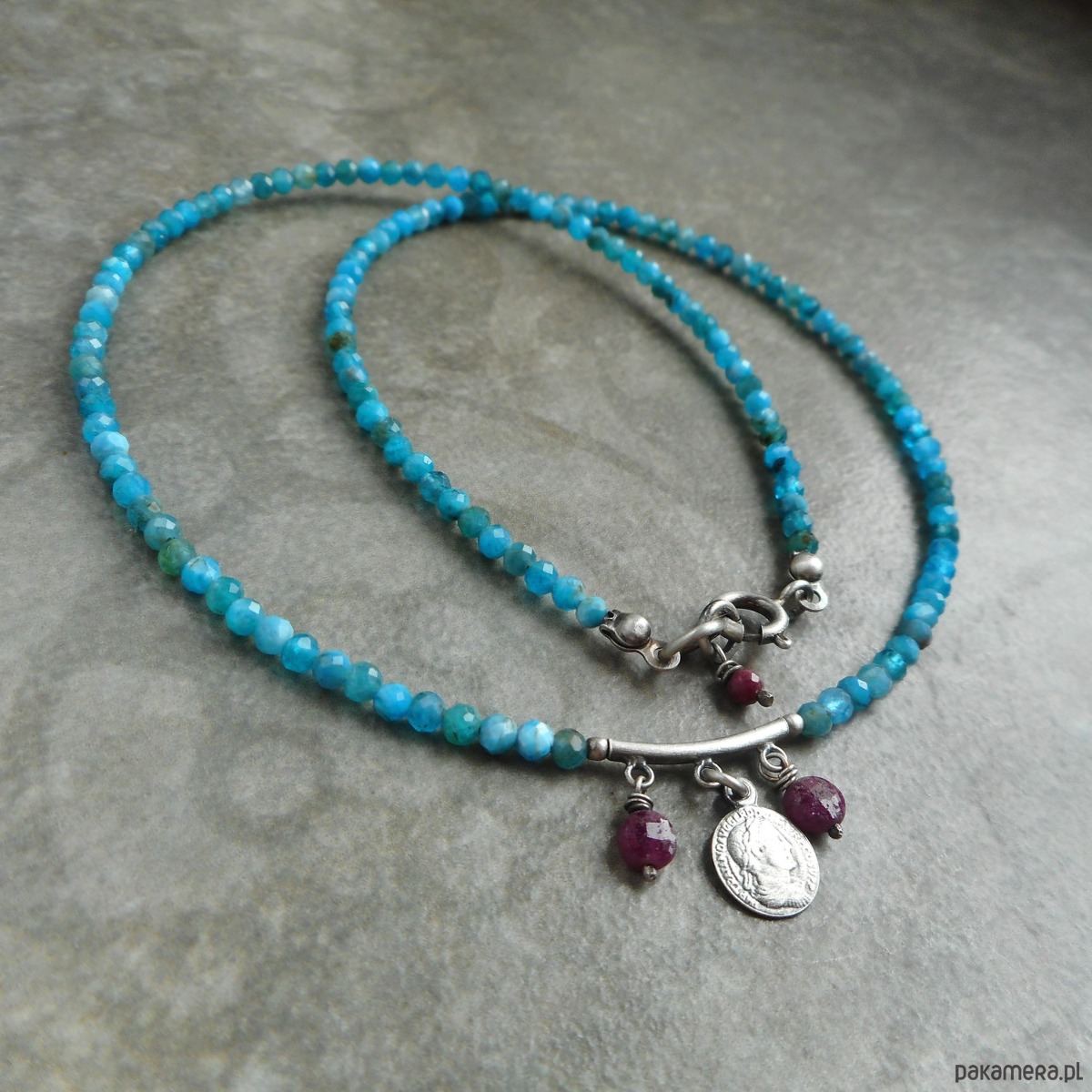 Piękny, krótki naszyjnik wykonany ze szlachetnego srebra i kamieni naturalnych; delikatny ale wyrazisty, dzięki intensywnej barwie apatytów, ozdobiony zawieszkami z rubinów i srebrnej monety.