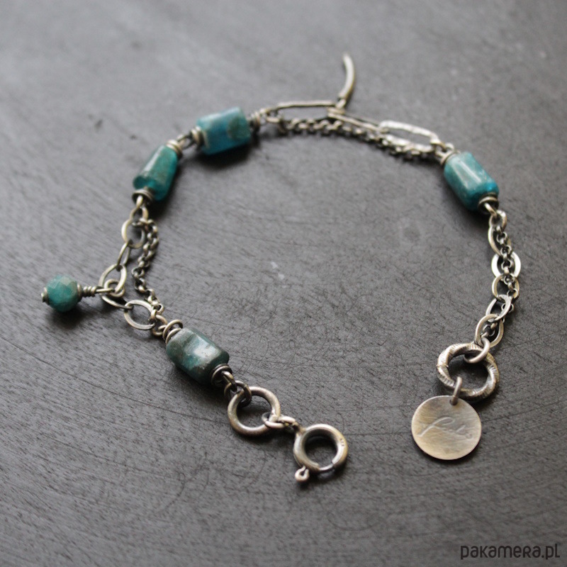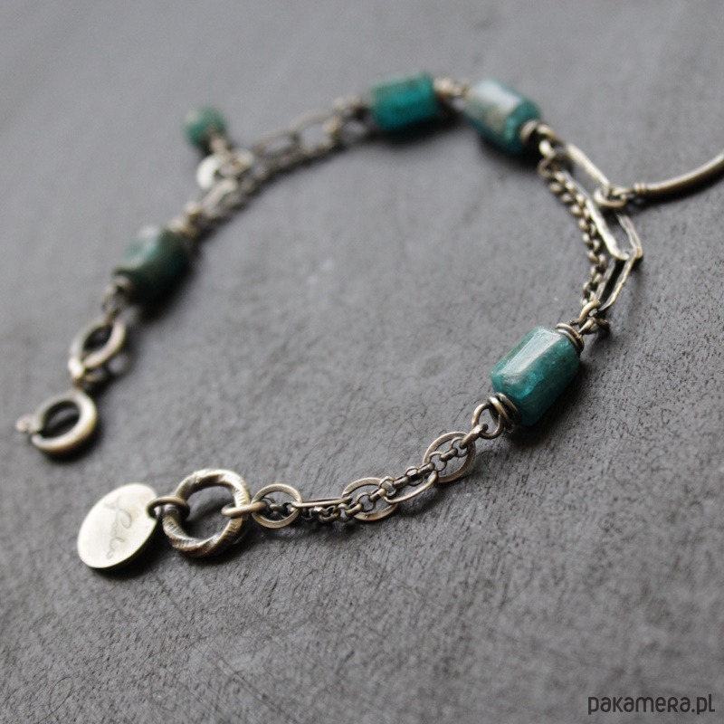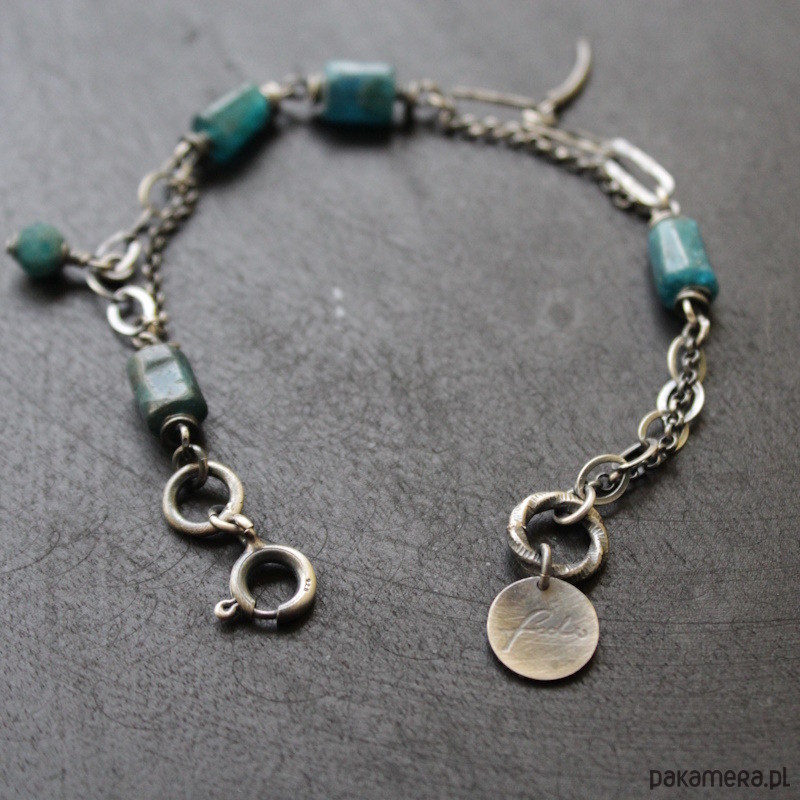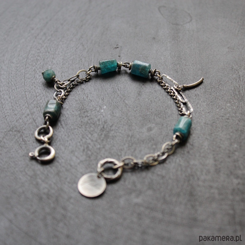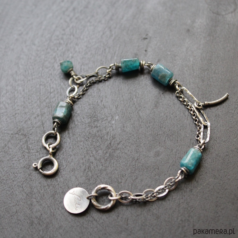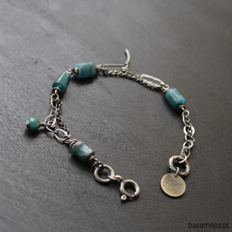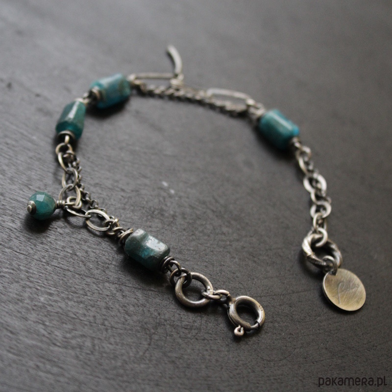 Bransoletka została wykonana z oksydowanego srebra próby 925 oraz niebieskich bryłek apatytów wielkości 0,6-0,8 cm.