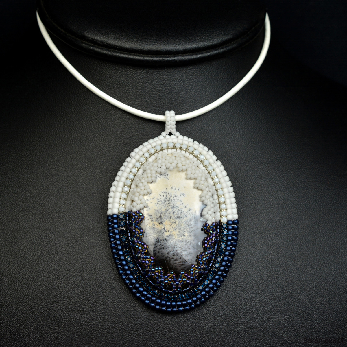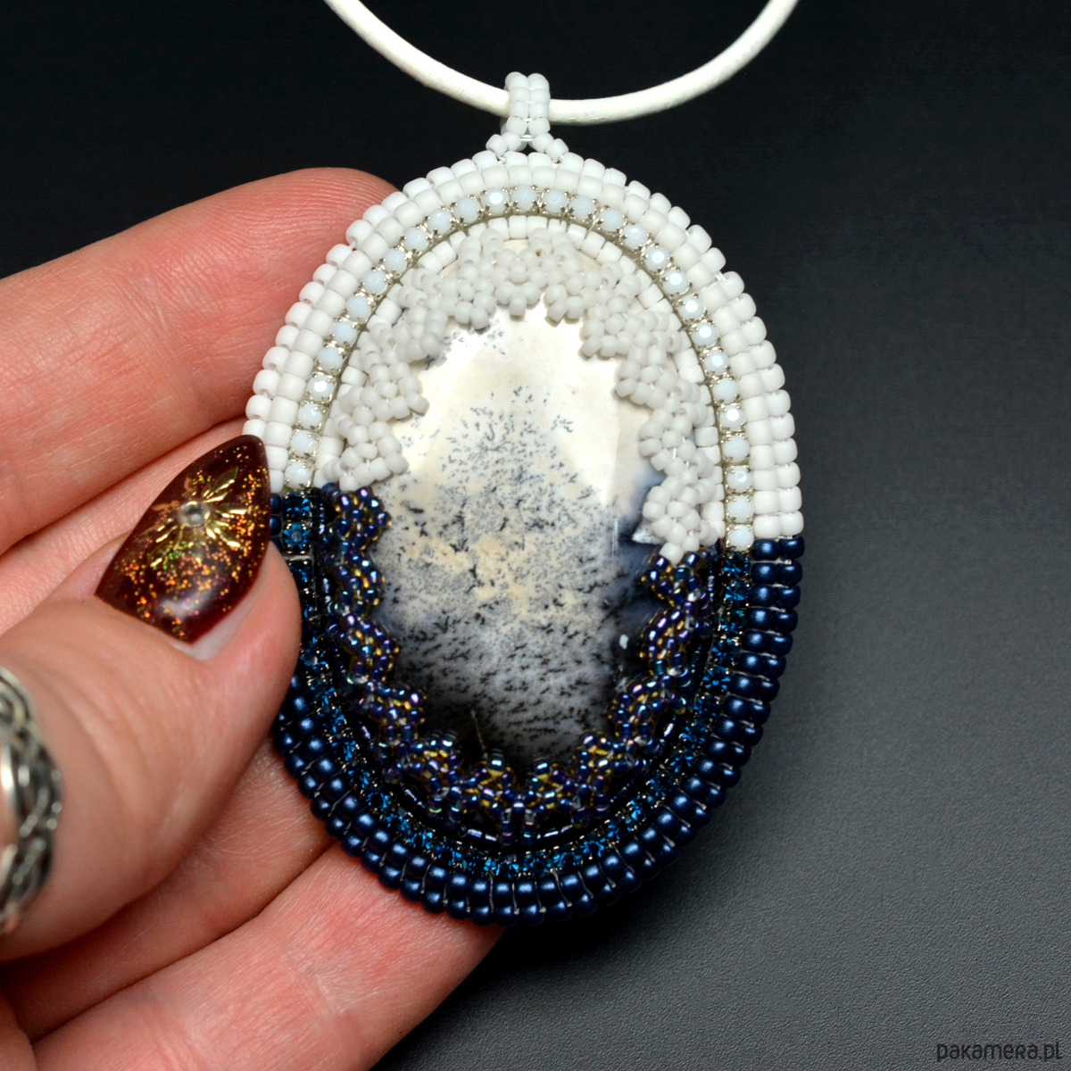 Jego serce stanowi piękny kaboszon agatu dendrytowego, który oplotłam najwyższej jakości japońskimi koralikami Toho i Miyuki w kolorze matowej bieli i granatowym.