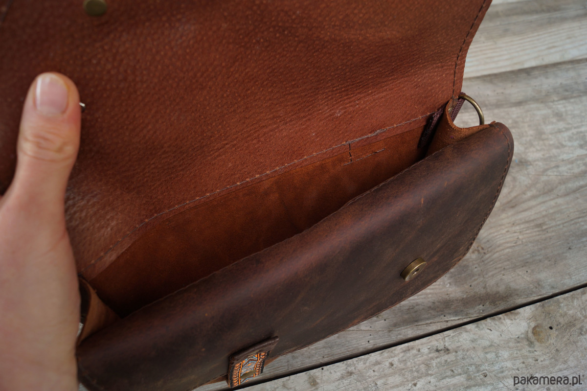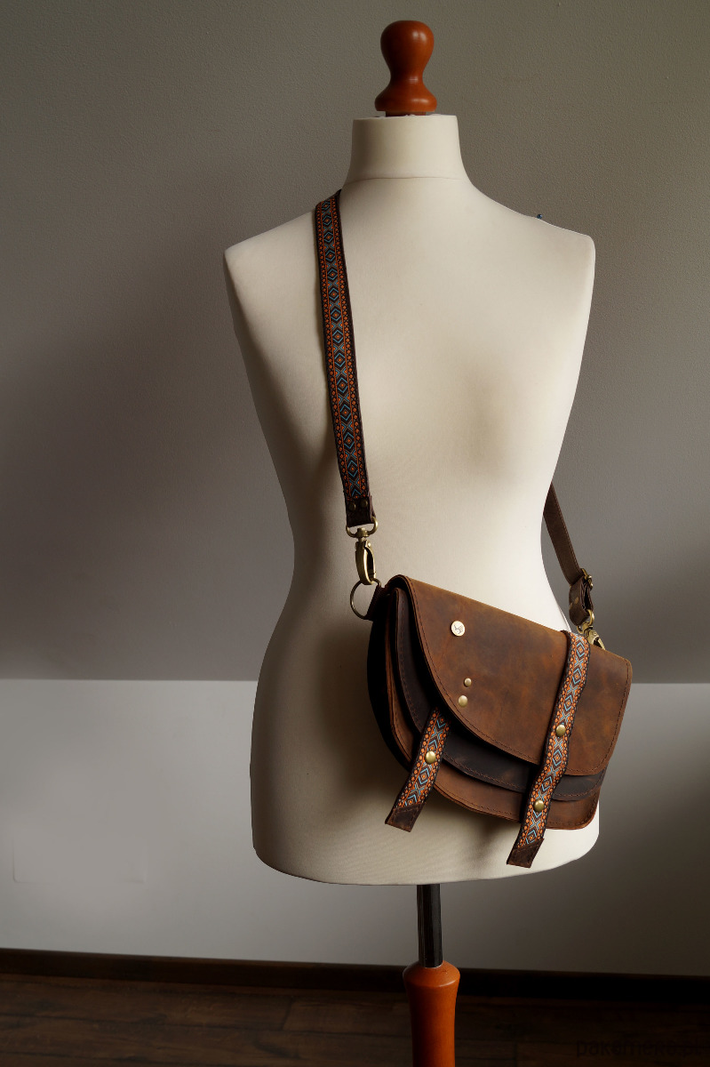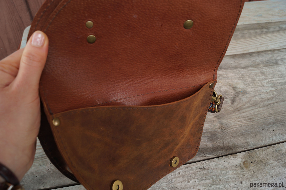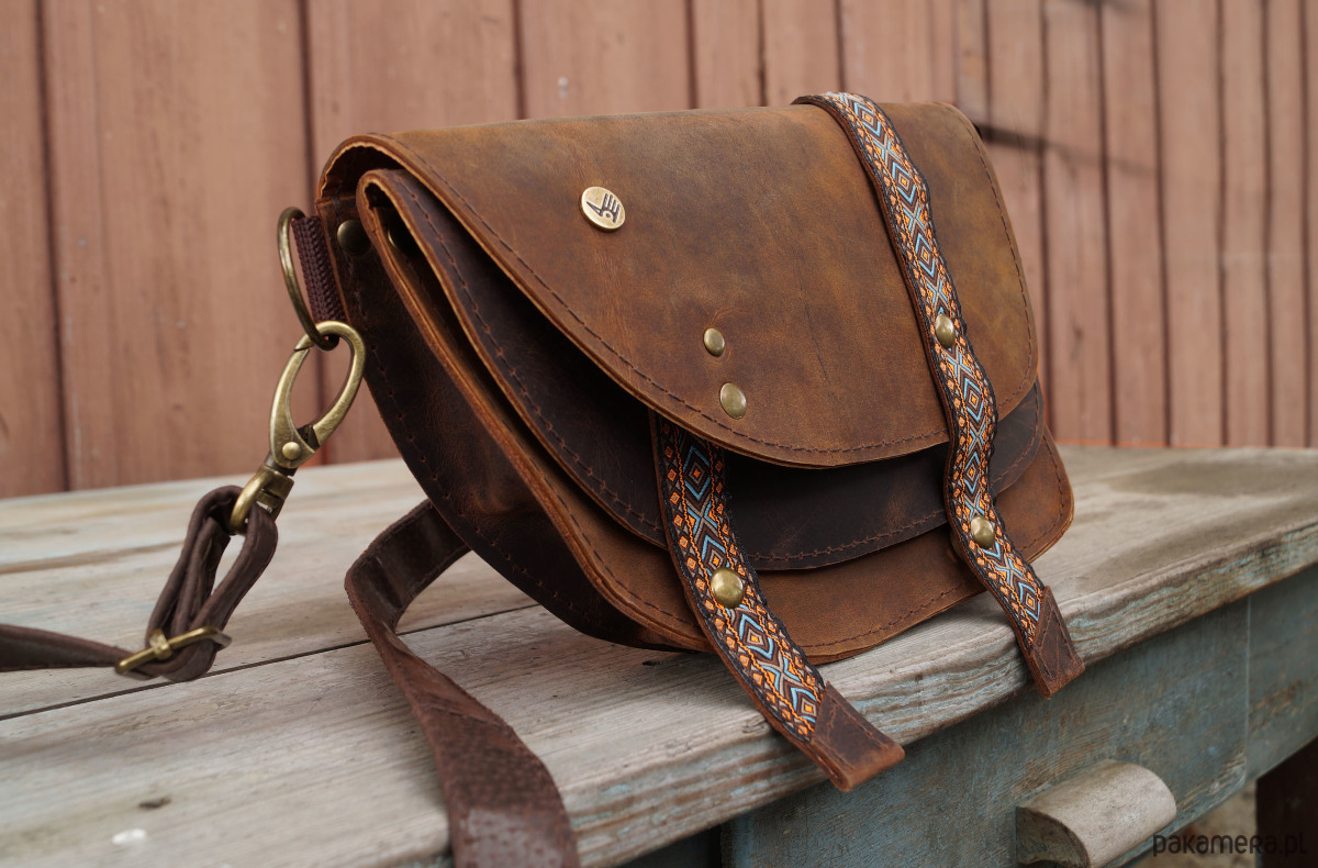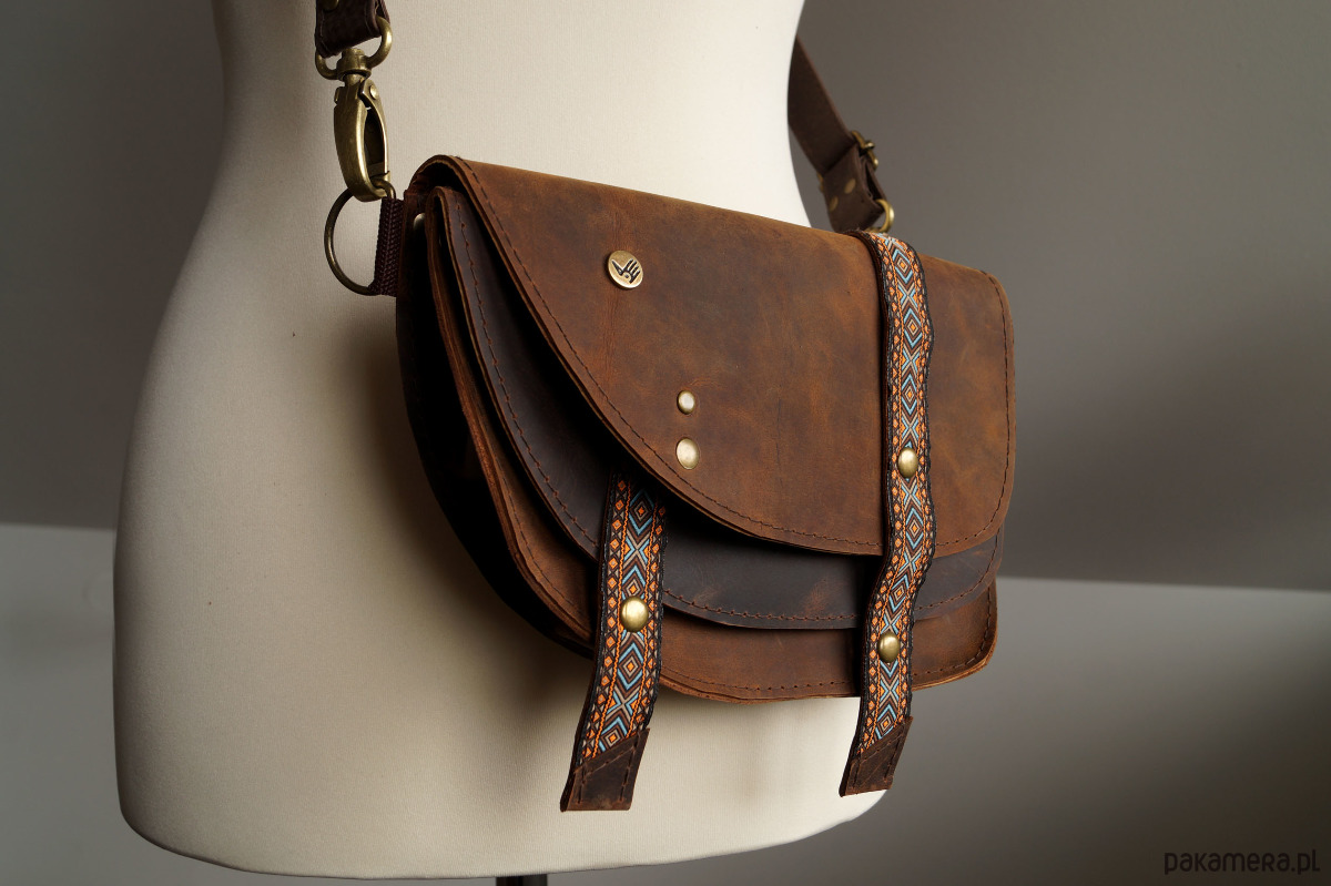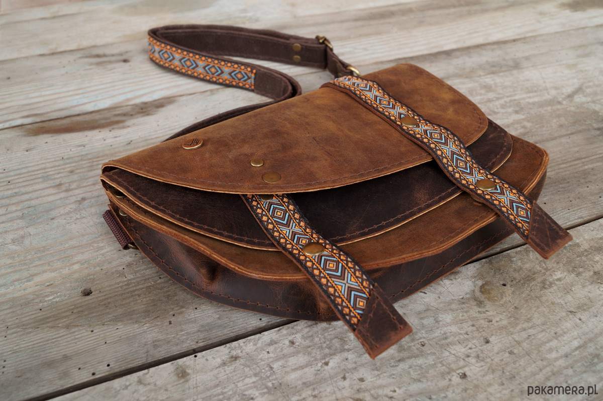 Torebka/nerka o przykuwającym uwagę, oryginalnym kroju, uszyta ze świetnej jakości skór naturalnych, bydlęcych, typu crazy w odcieniach brązu. Ozdobiona paskami w etno/azteckie wzory (skóra + ozdobna taśma). Składa się z dwóch przegród, z których każda przykryta jest osobną, asymetryczną klapą. Każda klapa zapinana jest na magnesy ukryte pod paseczkami. Uszyta z dużą dbałością o każdy szczegół. Wysokość – 16, szerokość – 23, głębokość – 5, dł. regulowanego paska – 60-110cm.