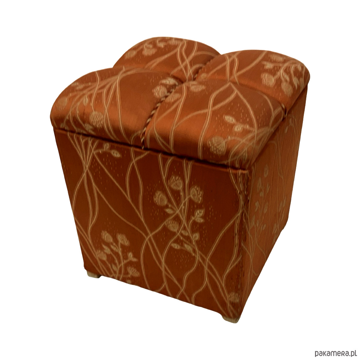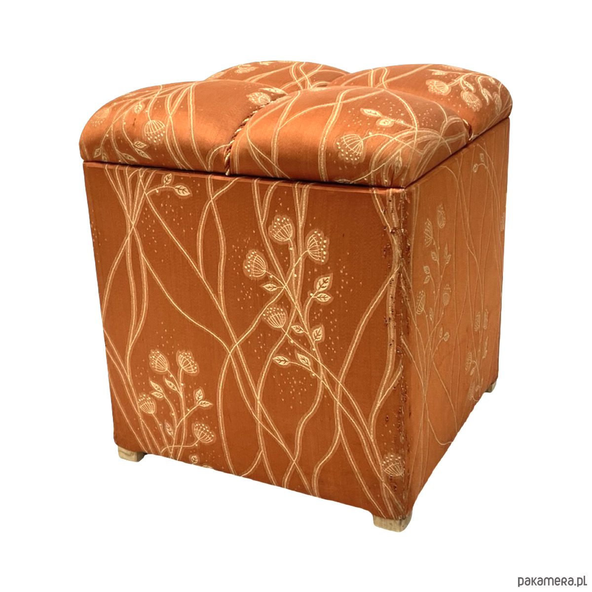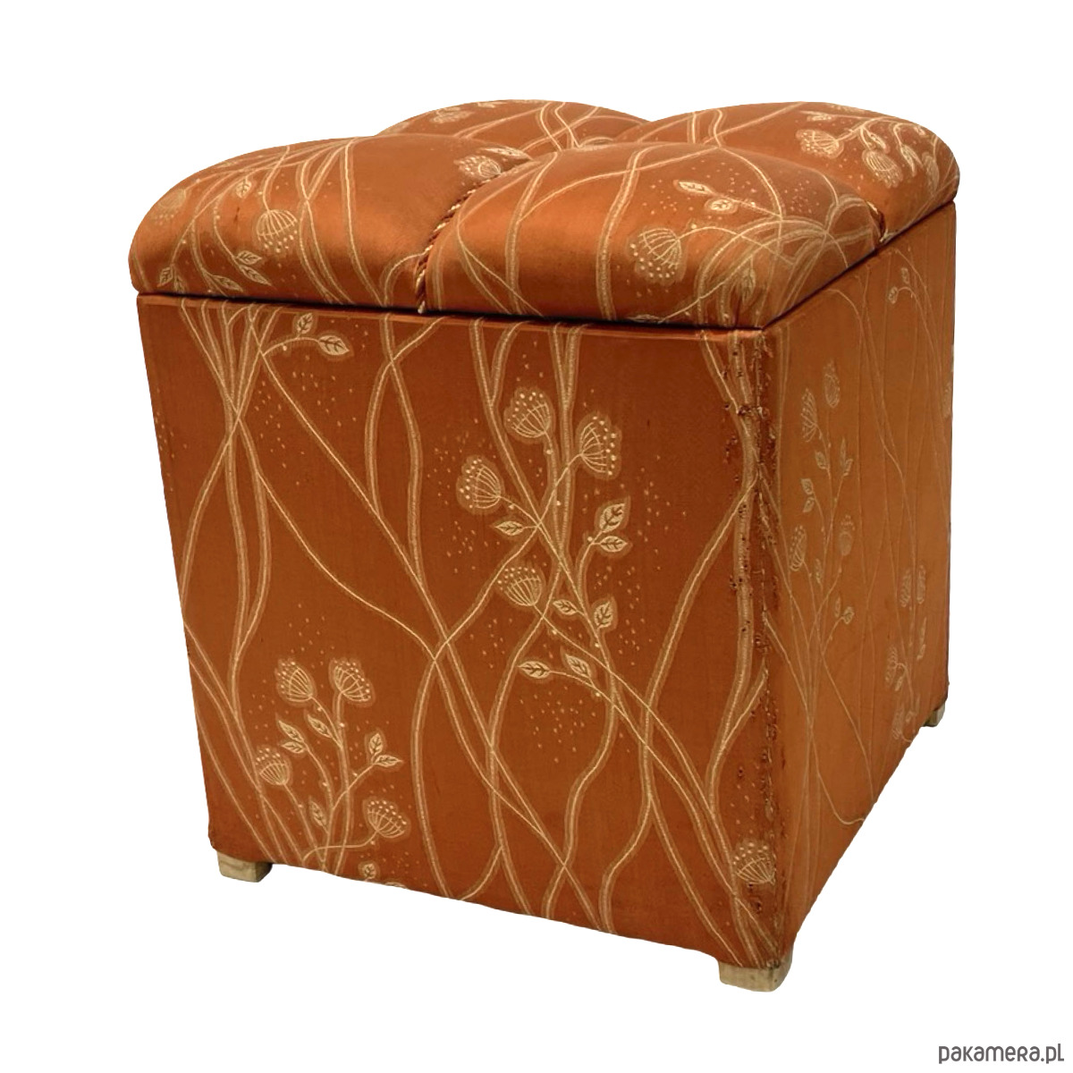 Stylowa pufa ze schowkiem w stylistyce Art Deco, pochodzenie europejskie, datowana na lata 30.–40. XX wieku. Klasyczna, geometryczna bryła połączona z dekoracyjną, roślinną tapicerką w ciepłym, miedziano-rudym odcieniu.