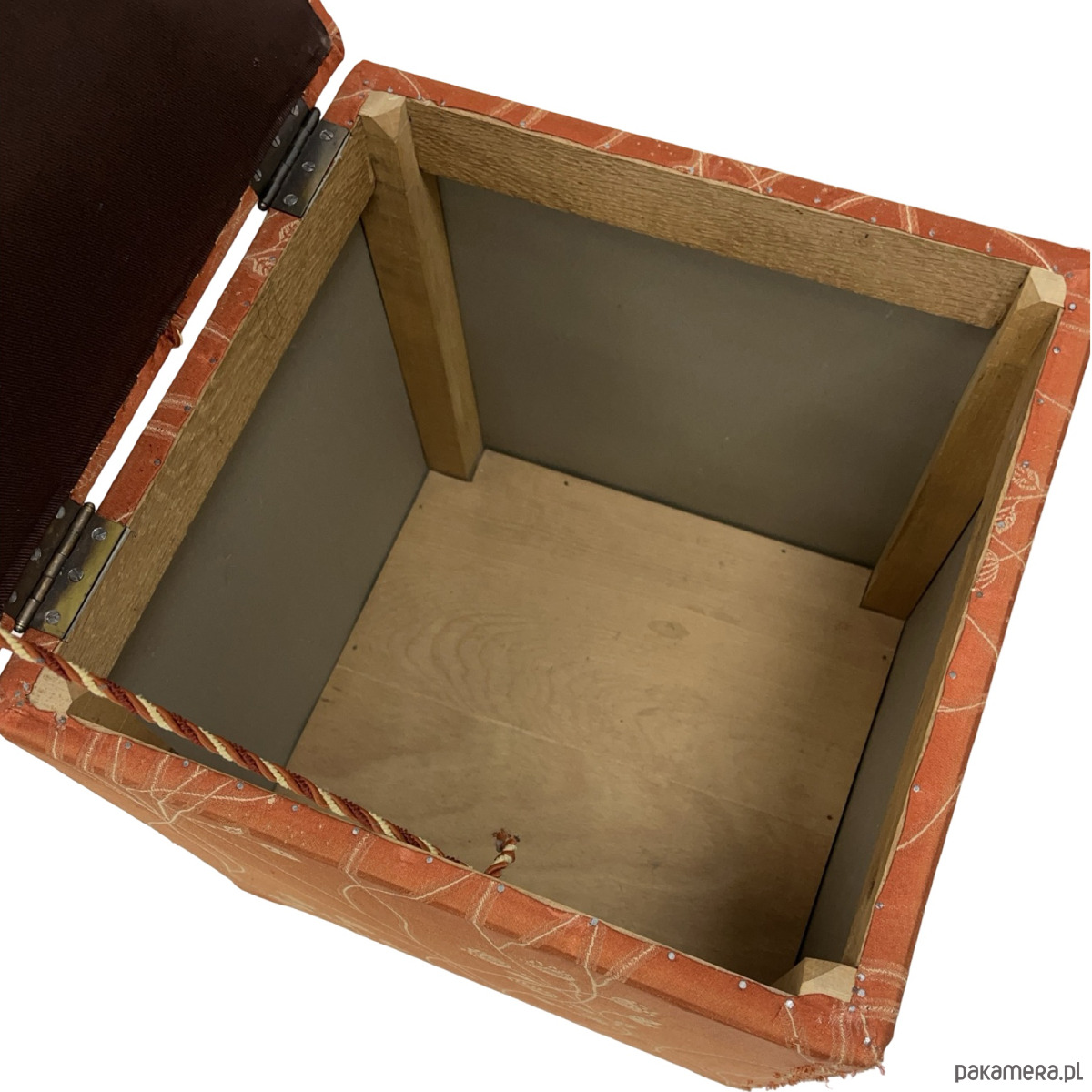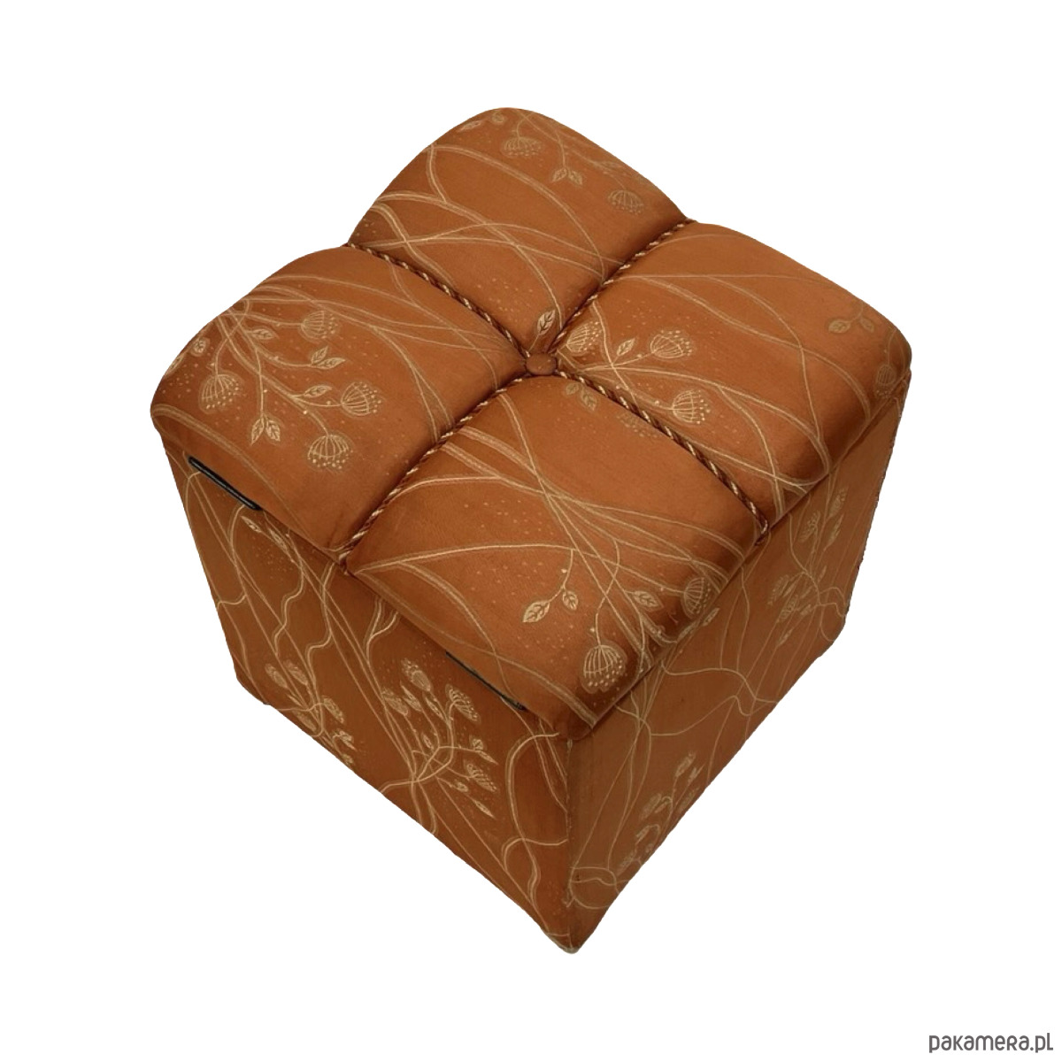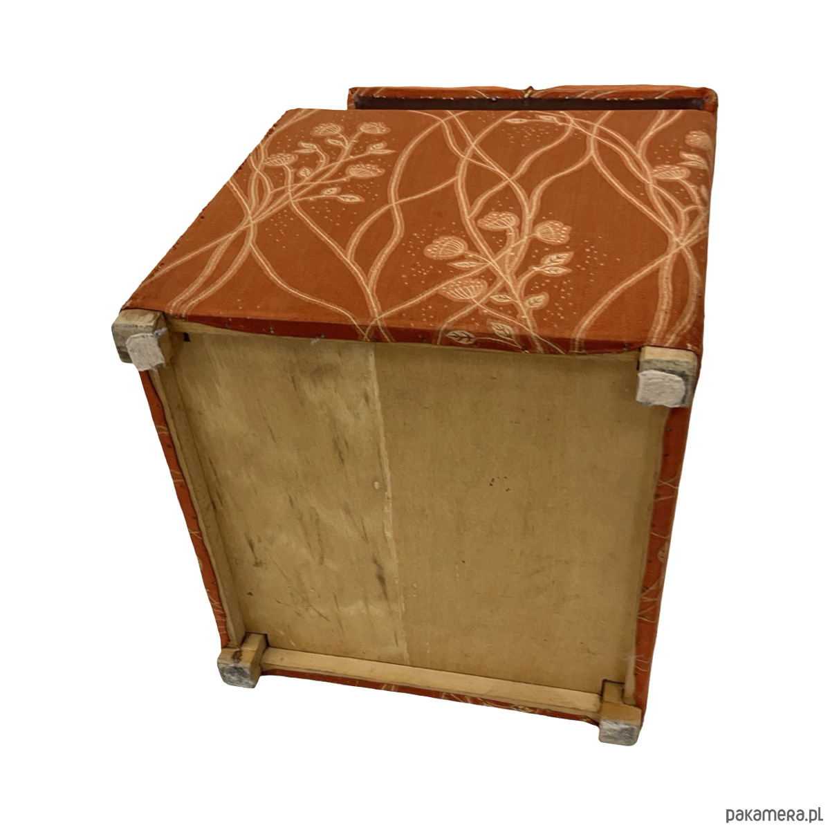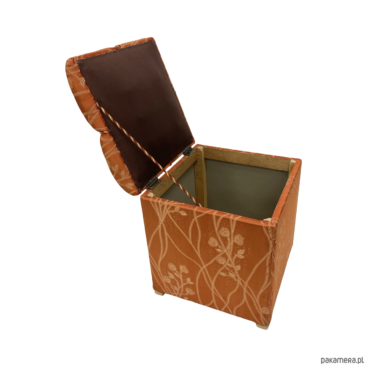 Stylowa pufa ze schowkiem w stylistyce Art Deco, pochodzenie europejskie, datowana na lata 30.–40. XX wieku. Klasyczna, geometryczna bryła połączona z dekoracyjną, roślinną tapicerką w ciepłym, miedziano-rudym odcieniu.