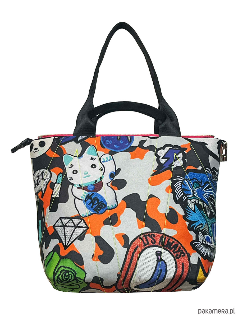 torba z printem pracy Szymona Kurpiewskiego, można prać w 30*C, można prasować, wykonana w jednym egzemplarzu, dwie możliwości zapinania, zamek / zatrzask, trzy kieszenie wewnątrz, wymiar 46x44 cm, zawieszka do podpisu. ZDJĘCIE Z ANIĄ POWIERZĄ POKAZUJE TORB£ WIĘKSZĄ UNI.