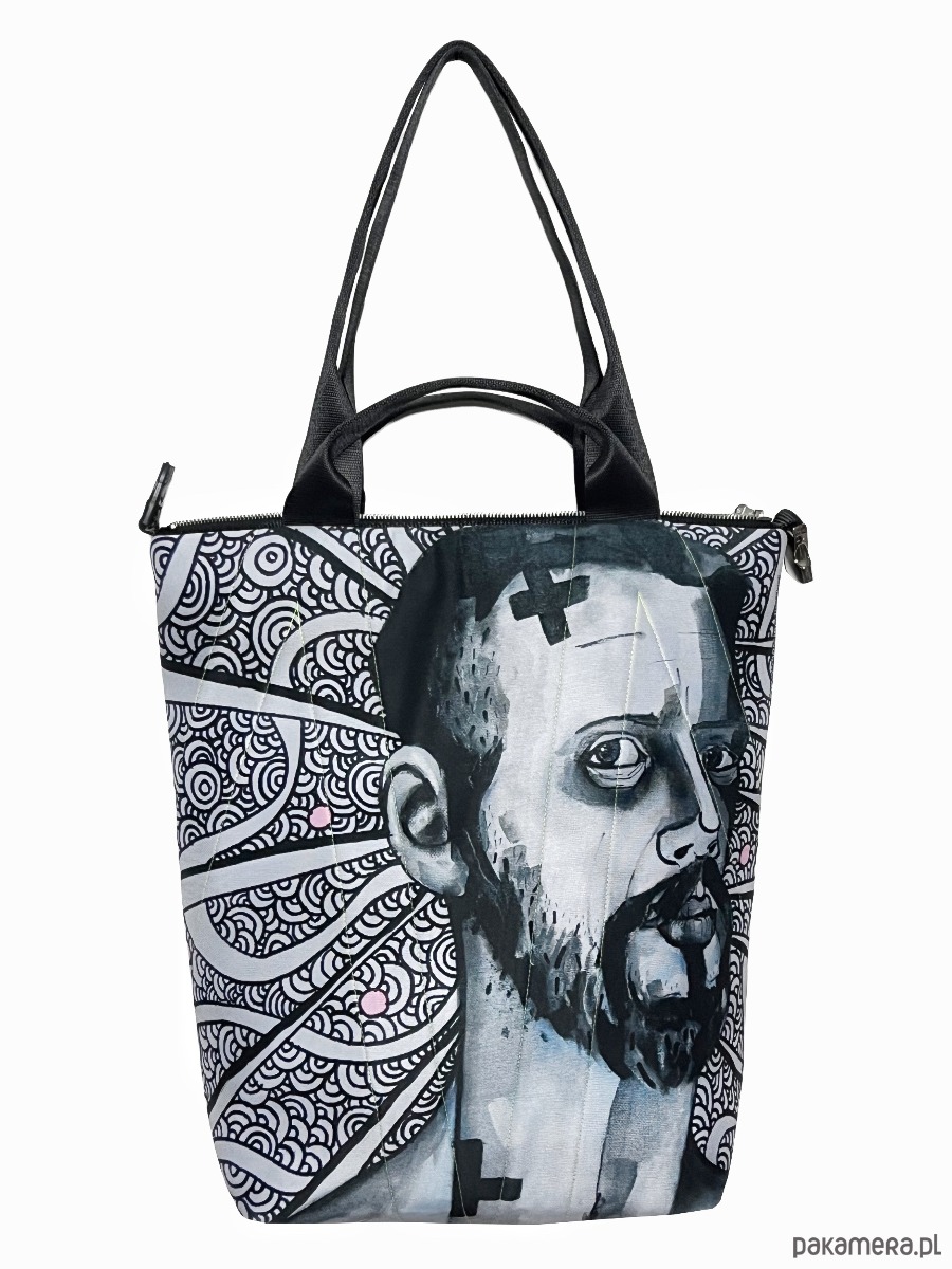 torba z printem pracy Marcina Painty, można prać w 30*C, można prasować, wykonana w jednym niepowtarzalnym zestawieniu zamków i taśm fluo, dwie możliwości zapinania, zamek / zatrzask, trzy kieszenie wewnątrz, wymiar 46x54 cm, uszy wykonane z pasów samochodowych...