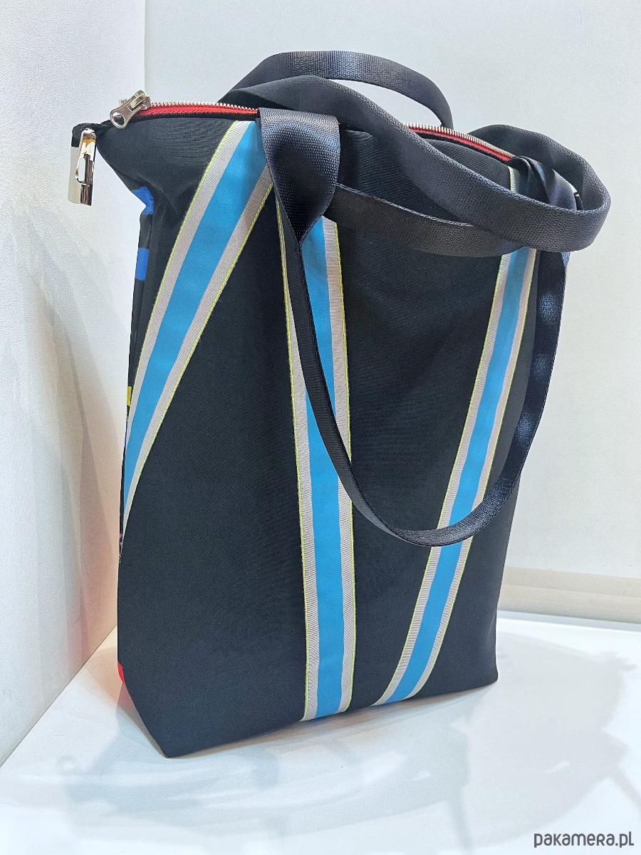 torba z printem pracy Marcina Painty, można prać w 30*C, można prasować, wykonana w jednym niepowtarzalnym zestawieniu zamków i taśm fluo, dwie możliwości zapinania, zamek / zatrzask, trzy kieszenie wewnątrz, wymiar 46x54 cm, uszy wykonane z pasów samochodowych...