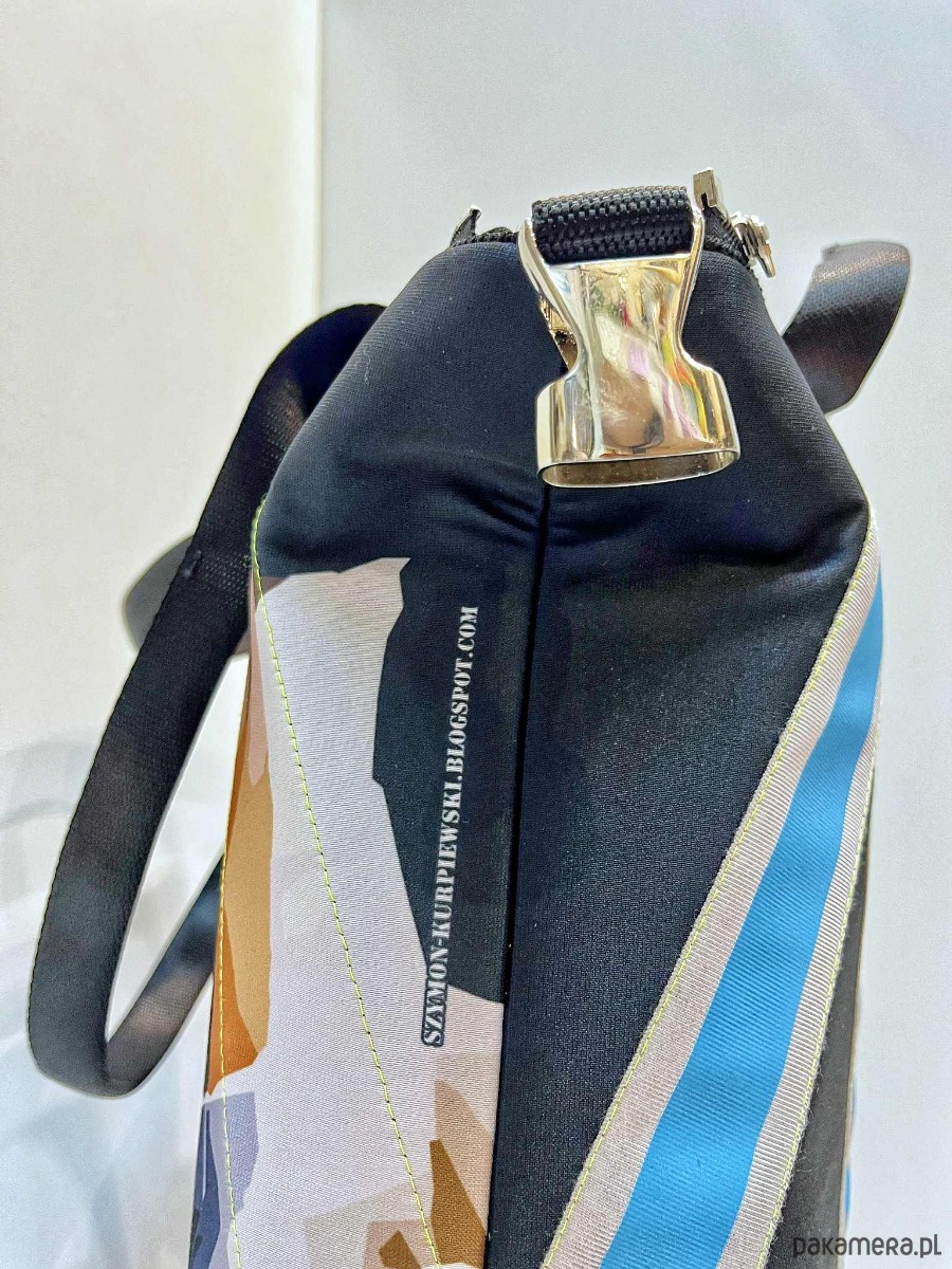 torba z printem pracy Szymona Kurpiewkiego, można prać w 30*C, można prasować, wykonana w jednym niepowtarzalnym zestawieniu zamków i taś fluo, dwie możliwości zapinania, zamek / zatrzask, trzy kieszenie wewnątrz, wymiar 46x56 cm, uszy wykonane z pasów samochodowych...