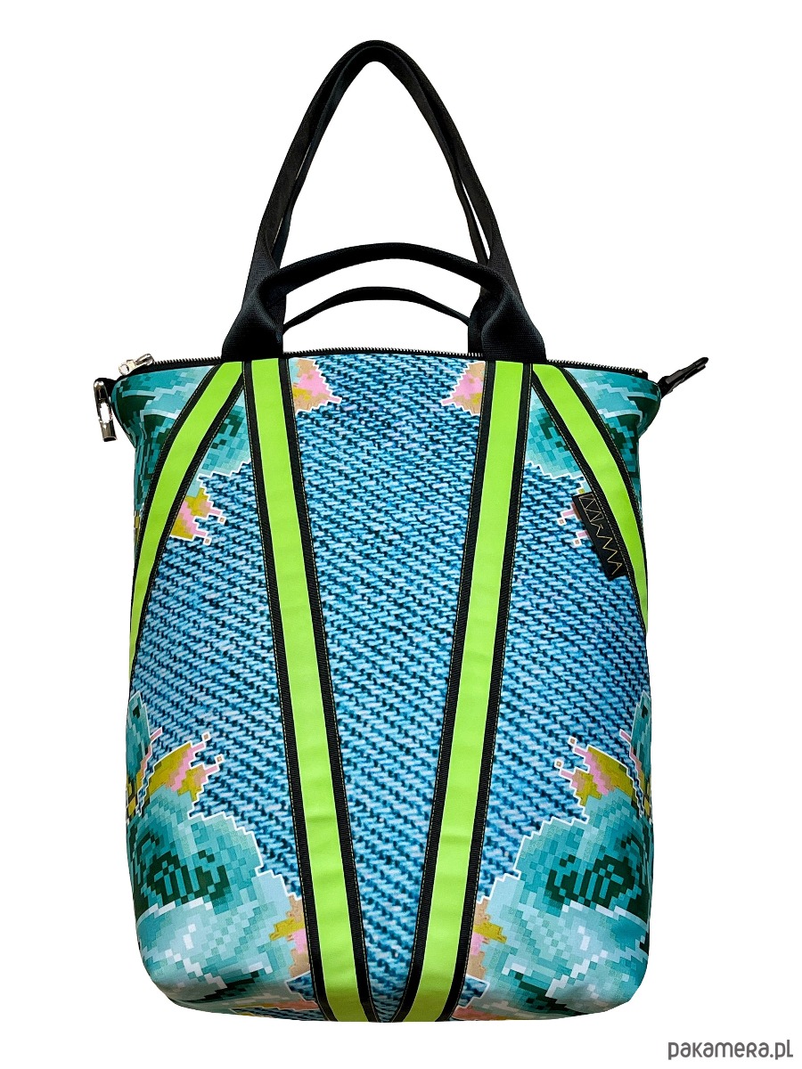 torba z printem pracy Szymona Kurpiewkiego, można prać w 30*C, można prasować, wykonana w jednym niepowtarzalnym zestawieniu zamków i taś fluo, dwie możliwości zapinania, zamek / zatrzask, trzy kieszenie wewnątrz, wymiar 46x56 cm, uszy wykonane z pasów samochodowych...