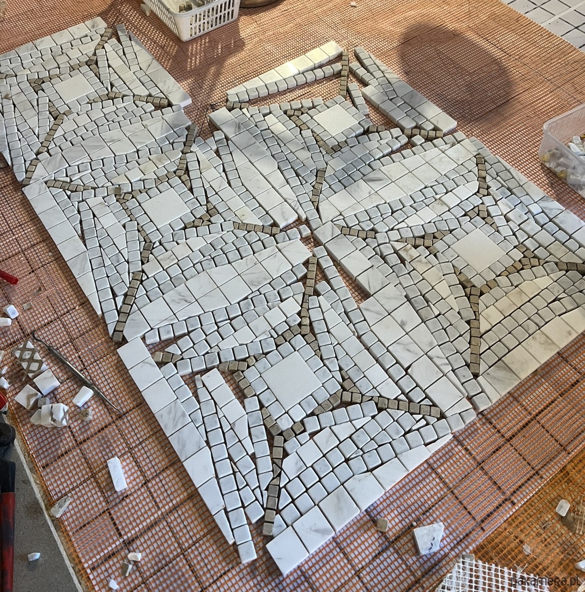 Praca wykonana w 100% ręcznie, z wykorzystaniem dawnych technik układnia i łamania kamienia. Mozaika gotowa do montażu na ścianie, podłodze, lub choćby jako blat stołu. Materiał pozwala zarówno na montaż w pomieszczeniach, jak i na zewnątrz (najlepiej pod zadaszeniem).