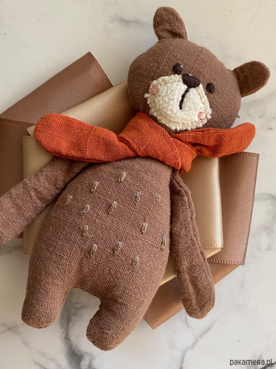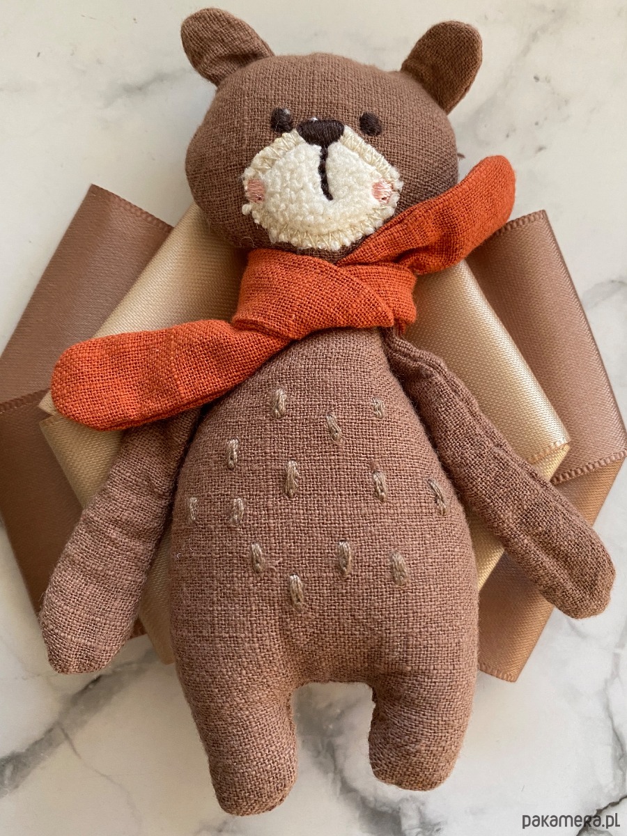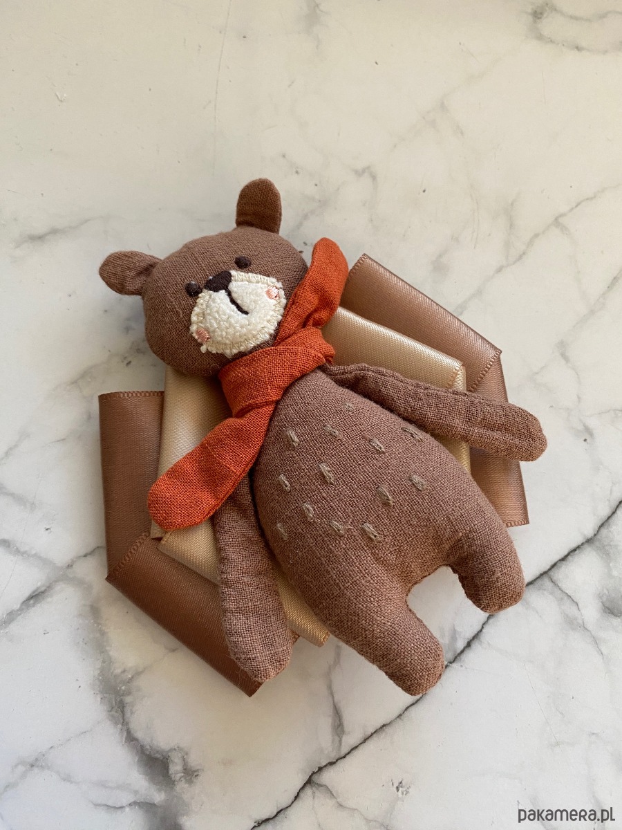 Miś 3d z czadowym szalikiem, wszystko w kolorach brązu.