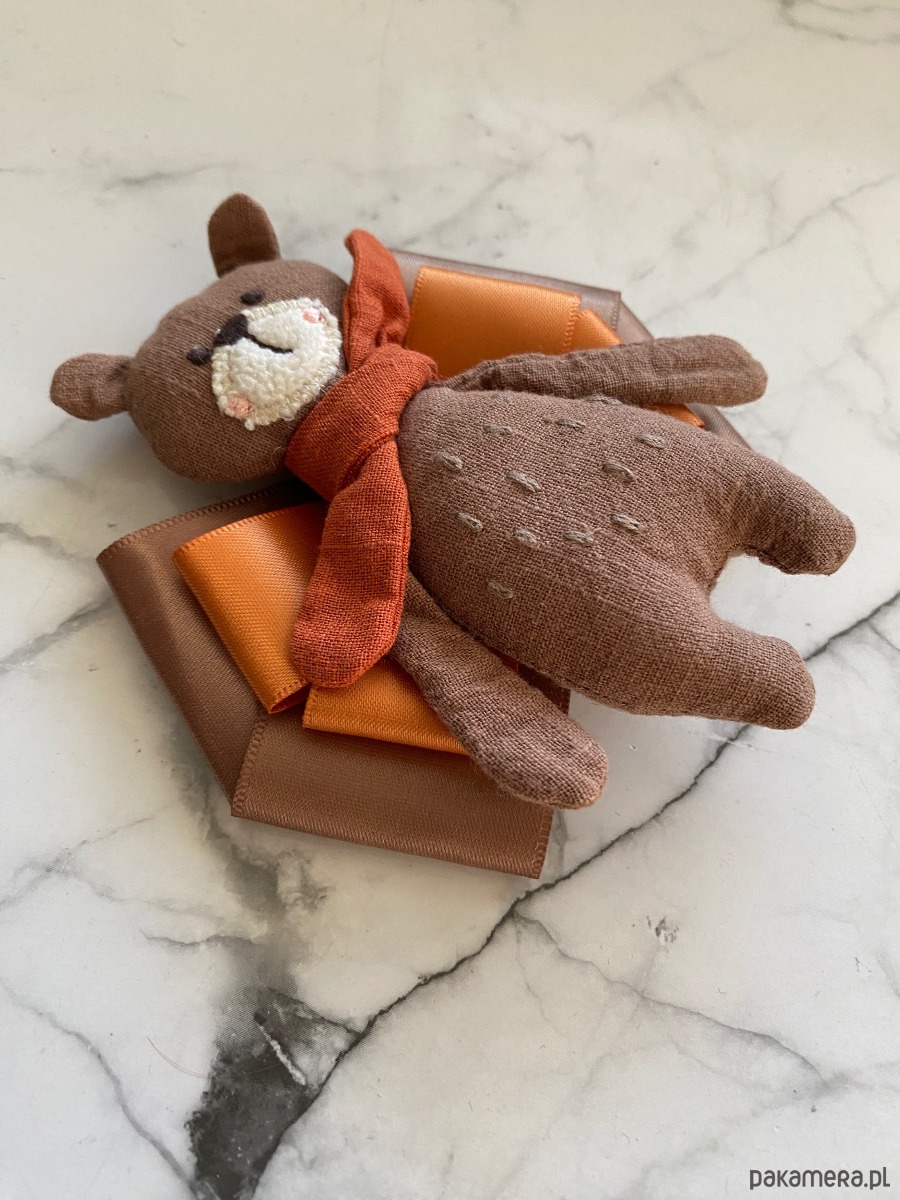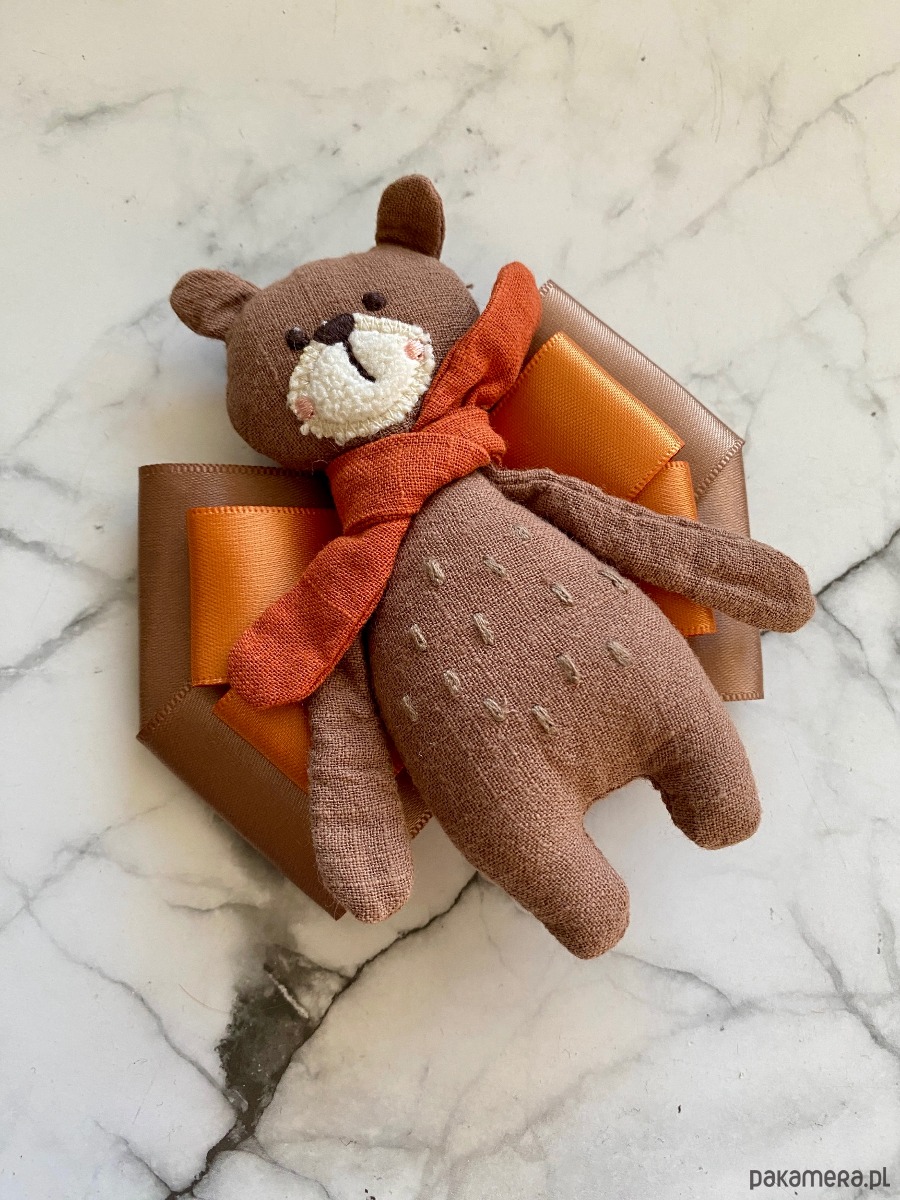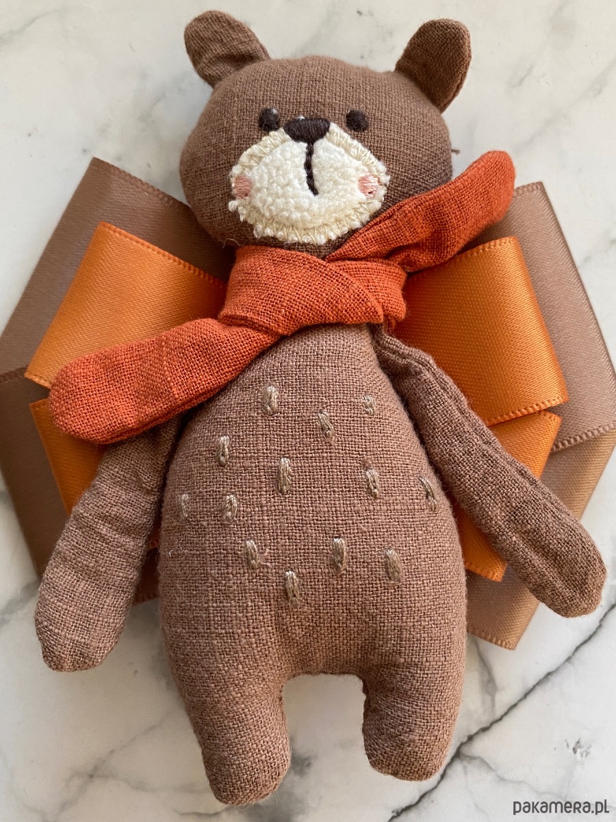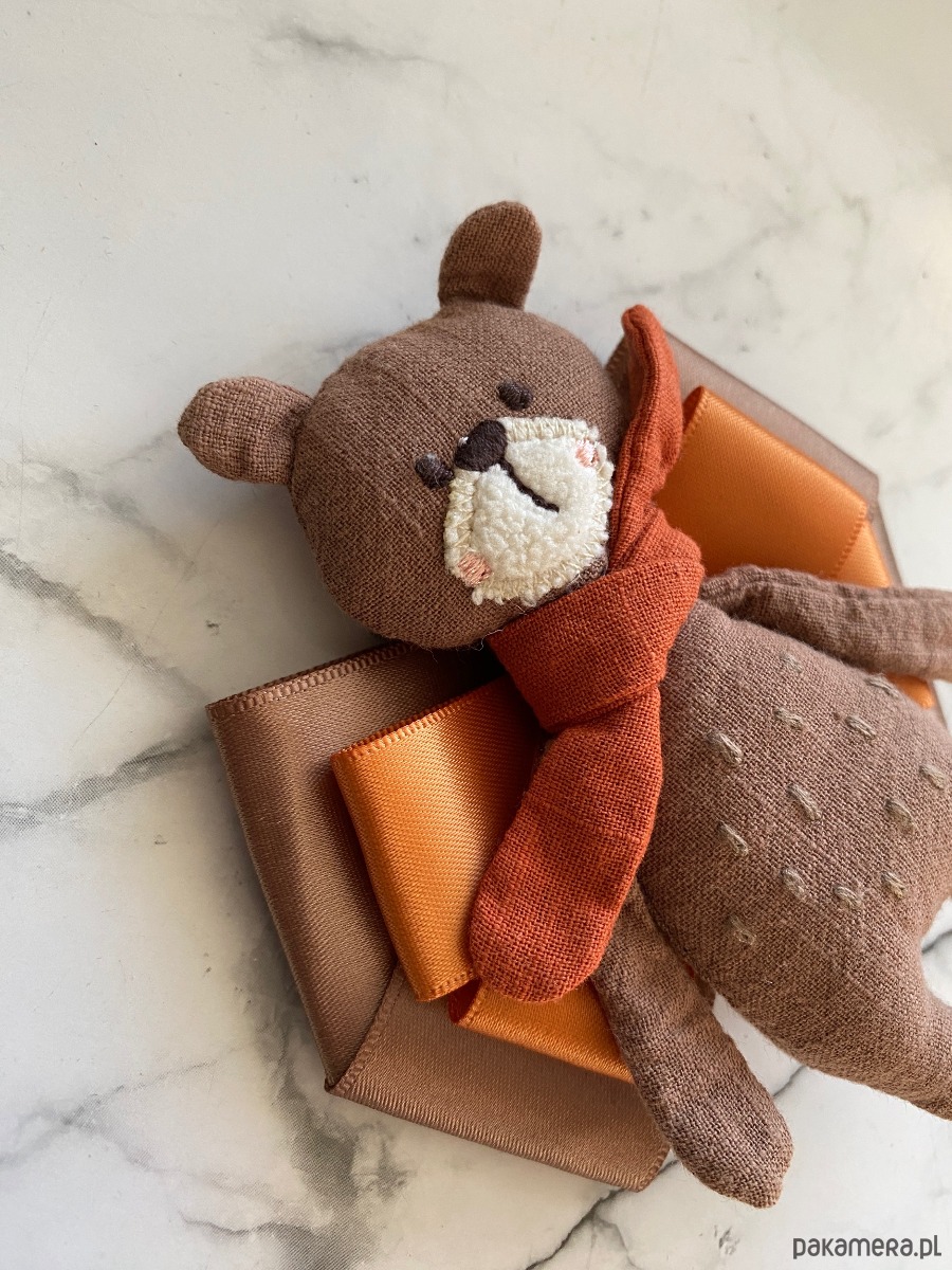 Miś 3d z czadowym szalikiem, wszystko w kolorach brązu.