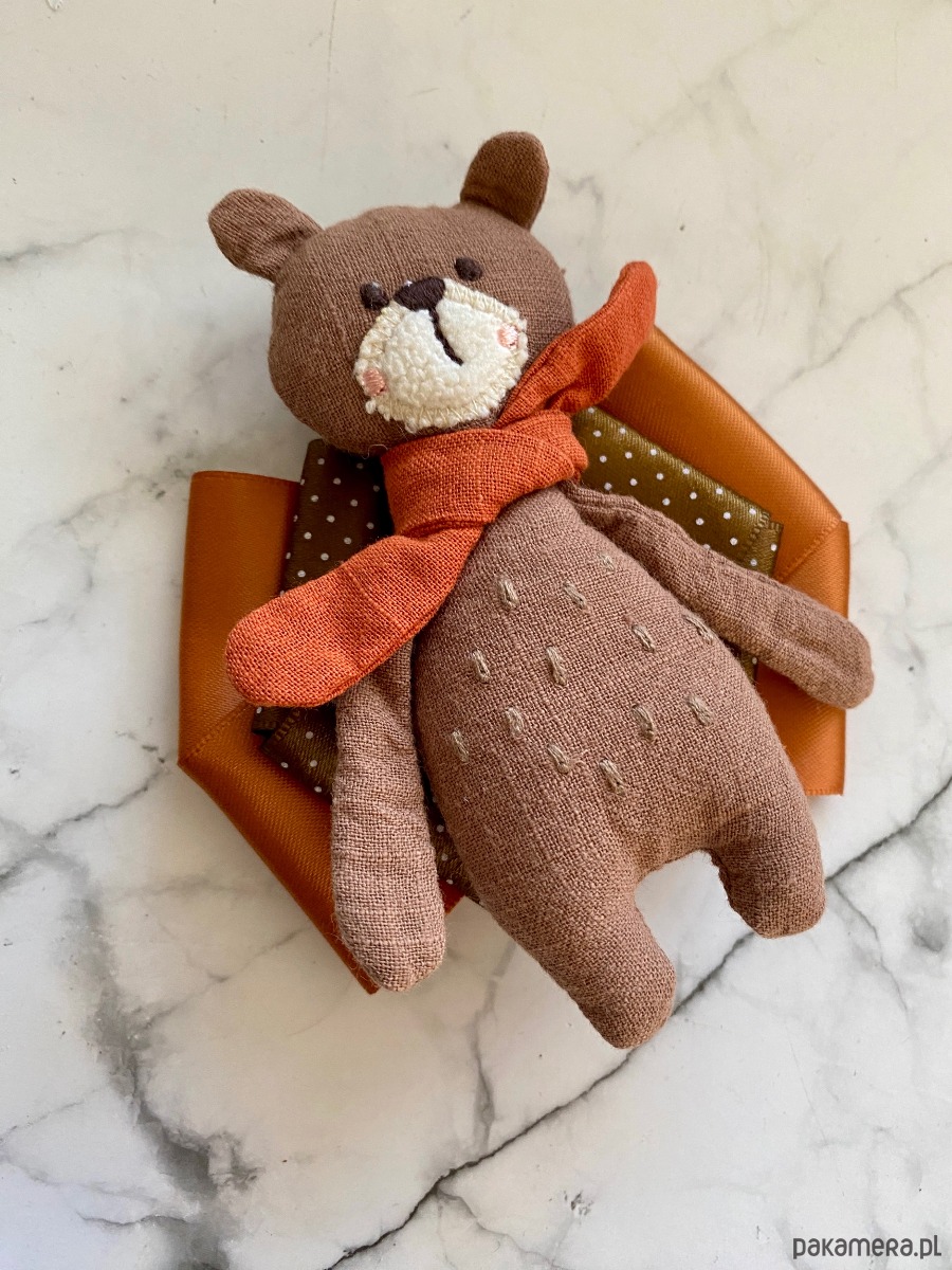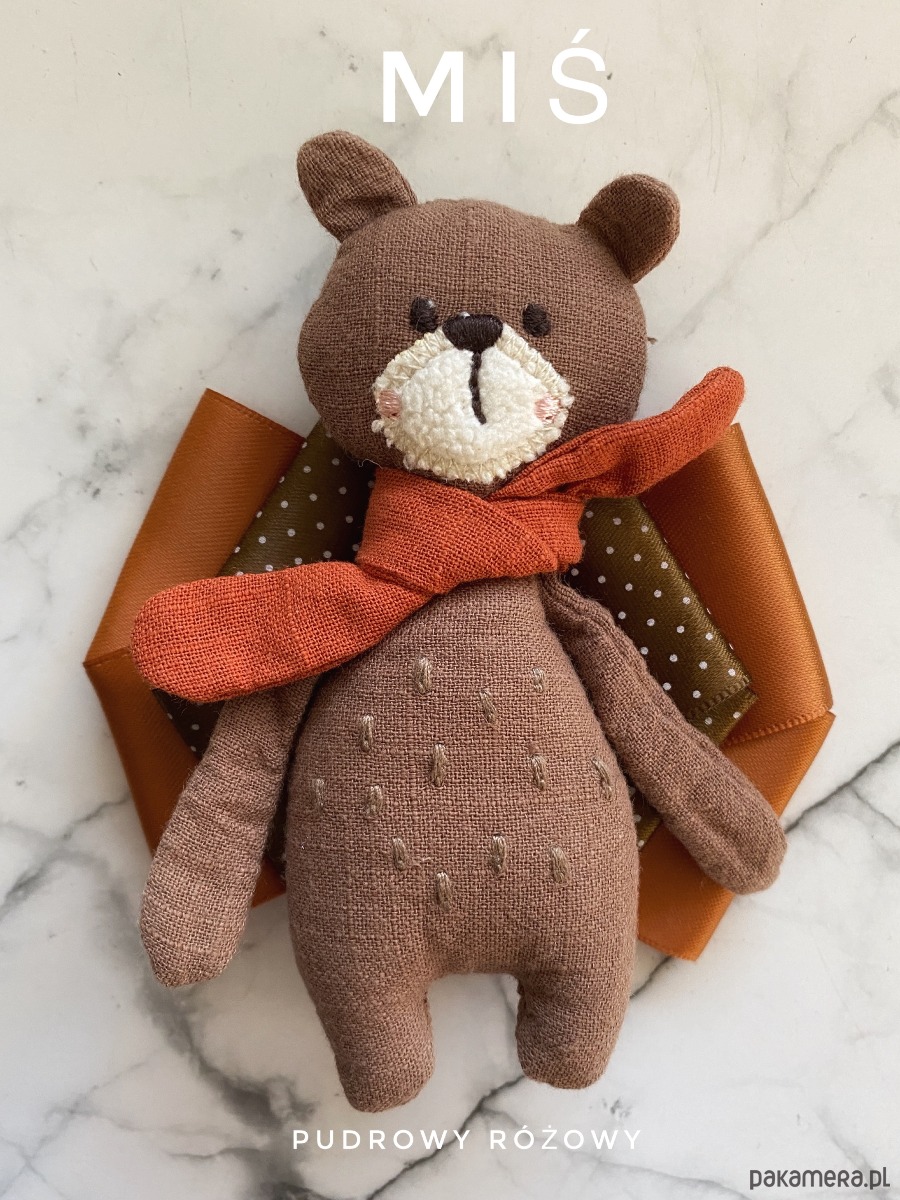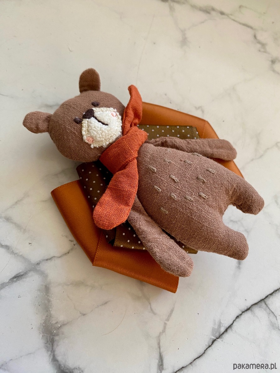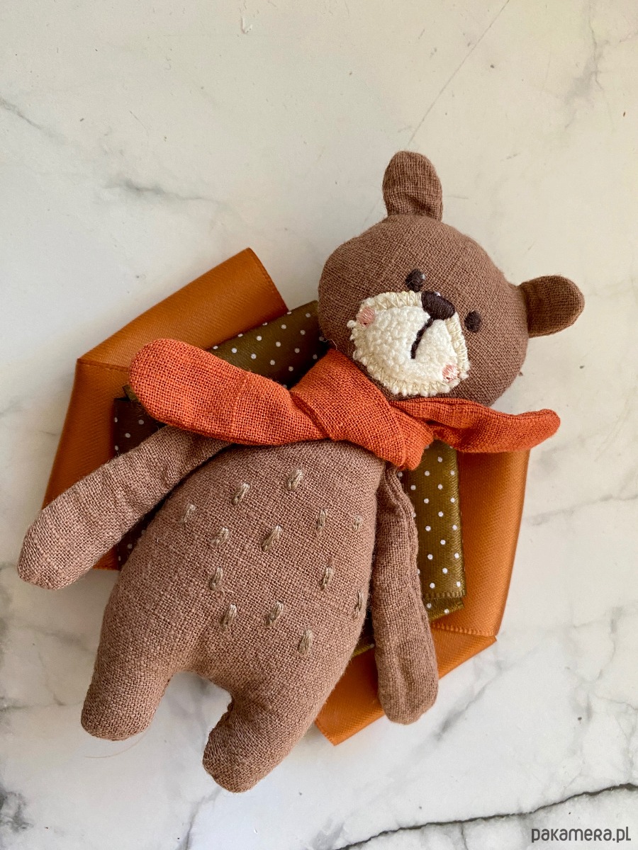 Miś 3d z czadowym szalikiem, wszystko w kolorach brązu.