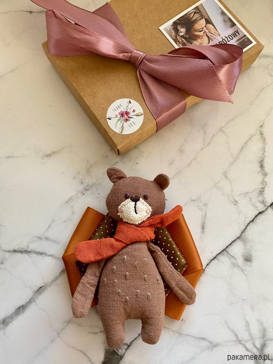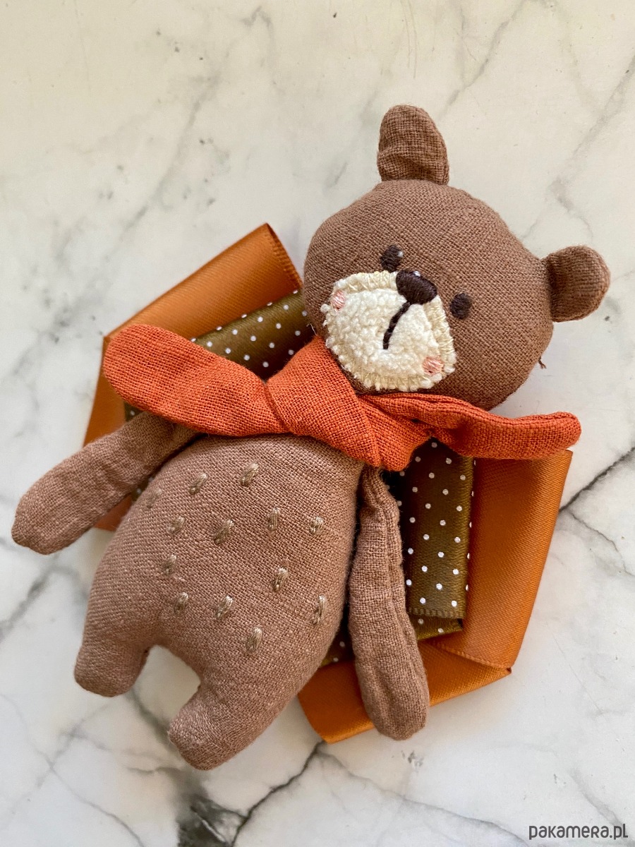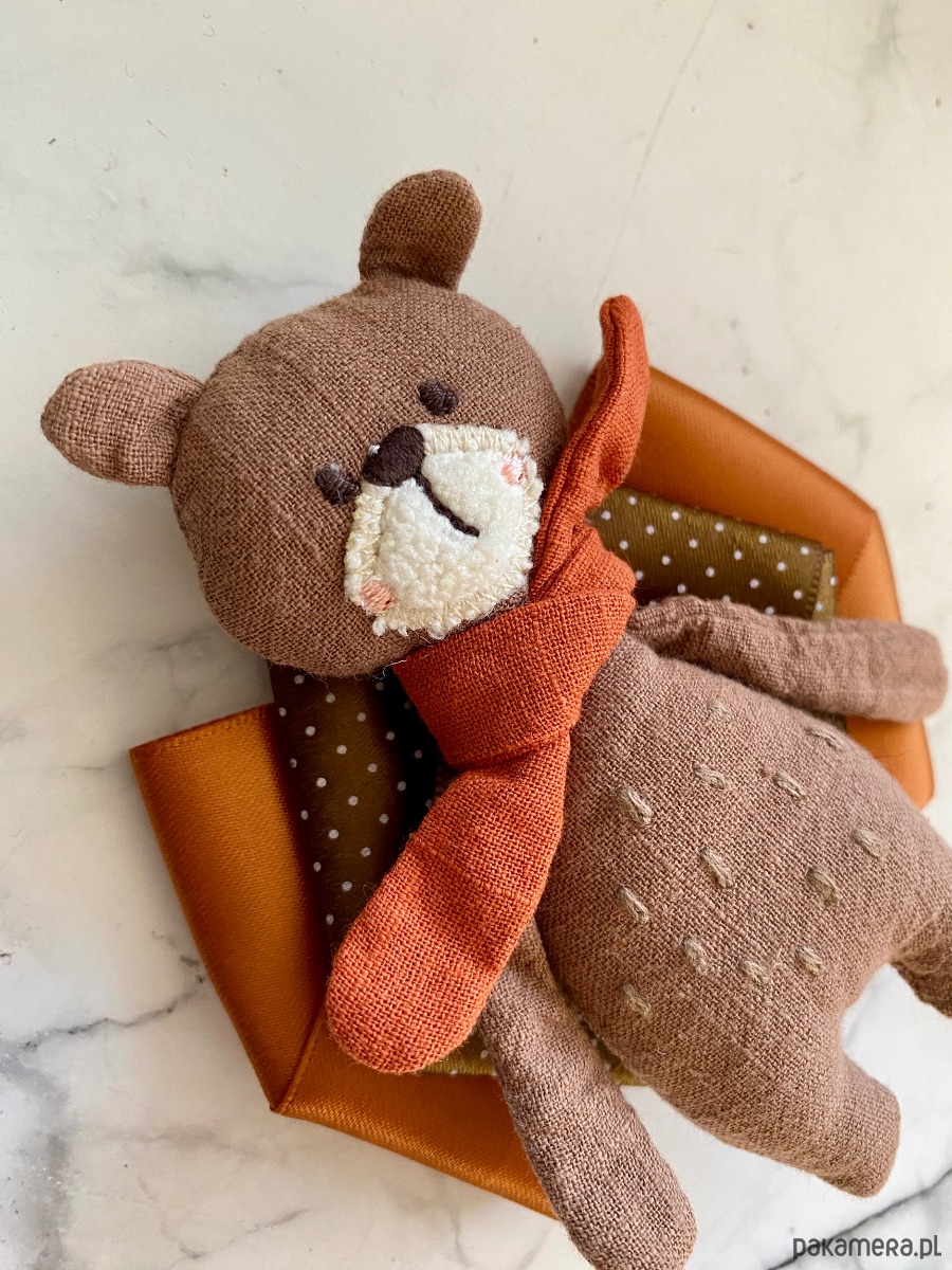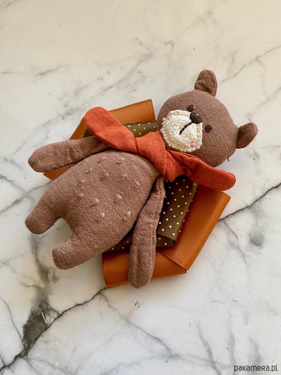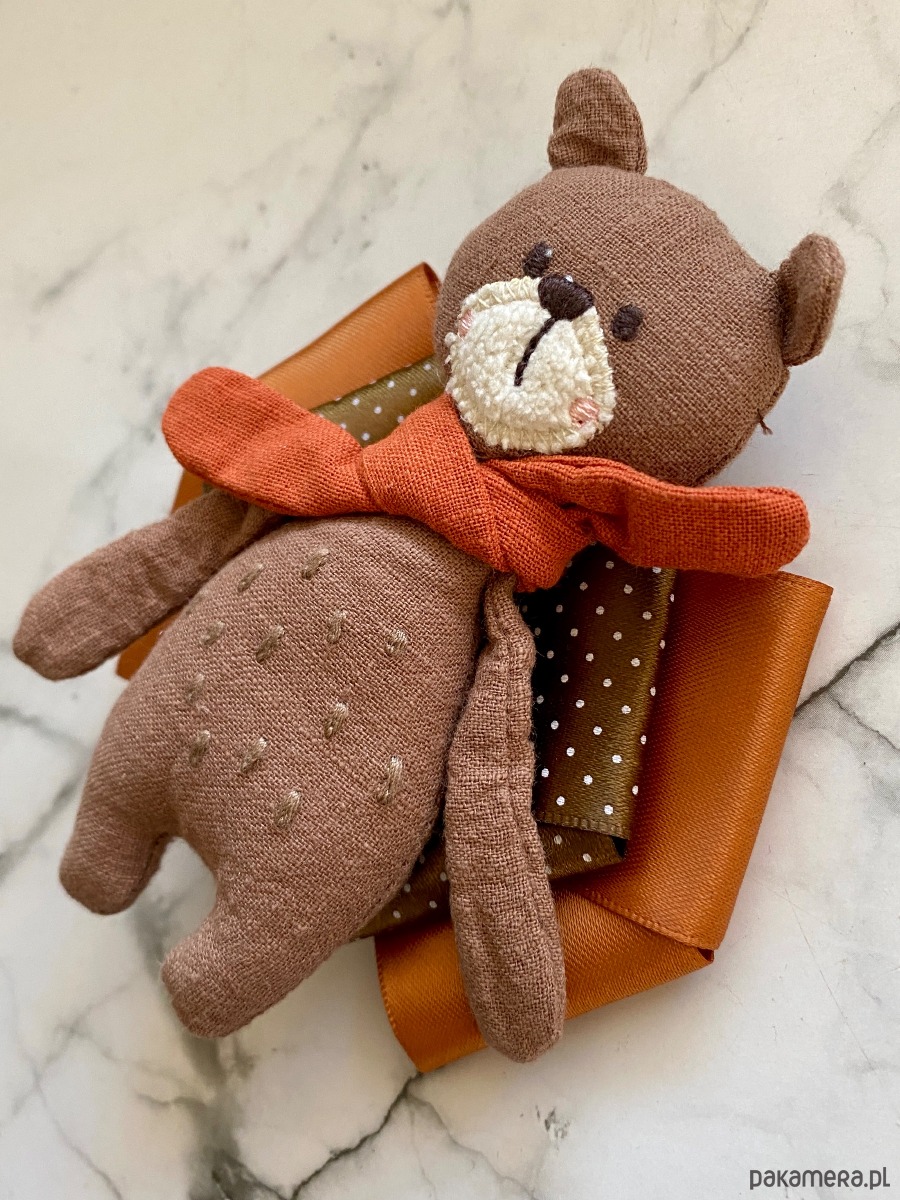Miś 3d z czadowym szalikiem, wszystko w kolorach brązu.
