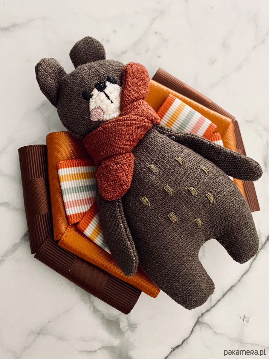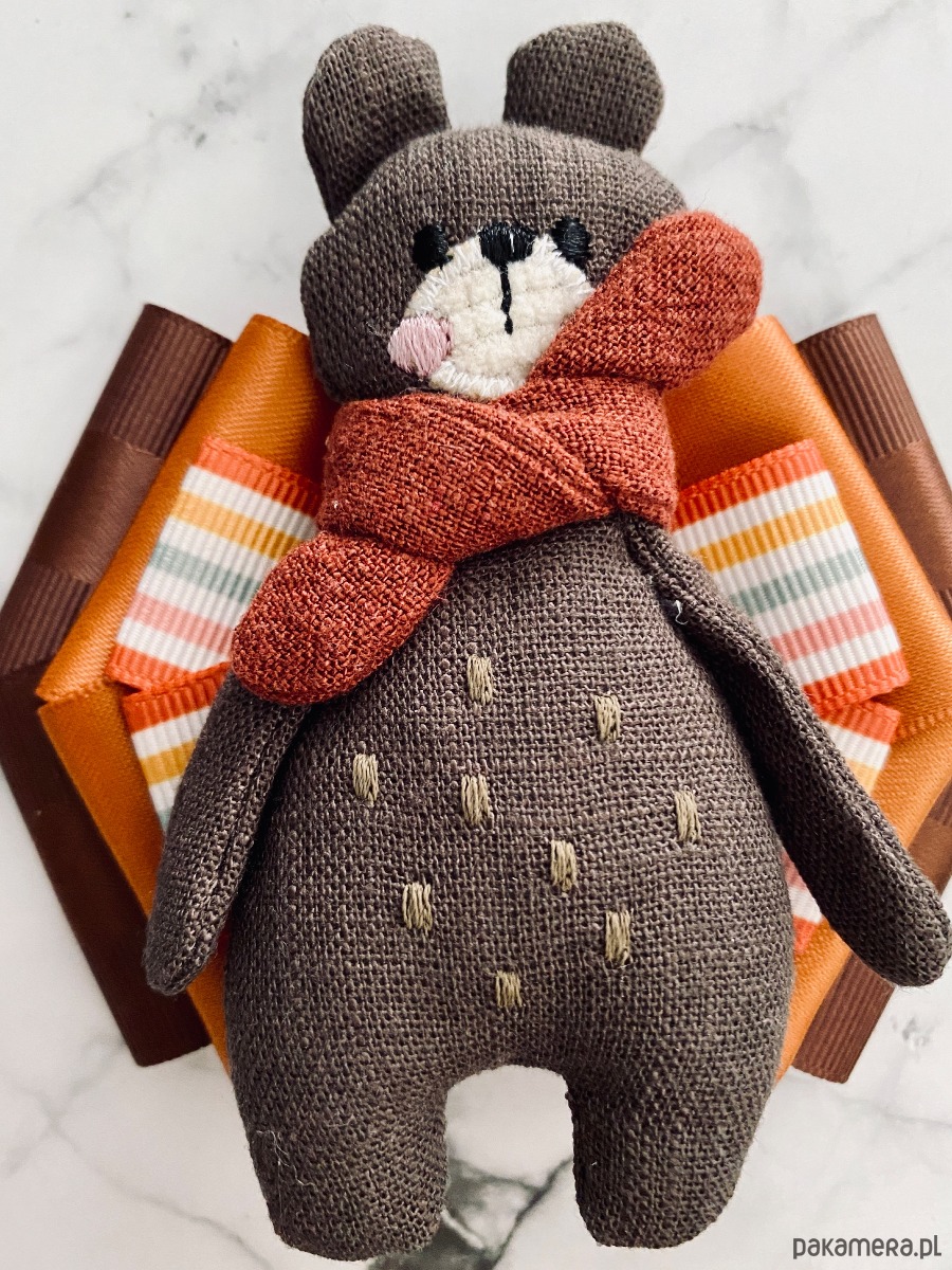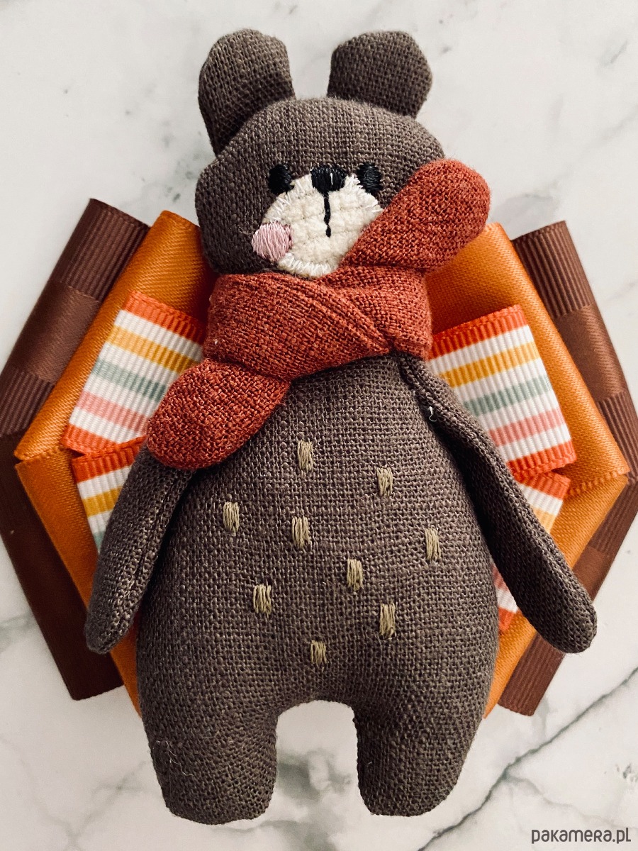 Miś 3d z czadowym szalikiem, wszystko w kolorach brązu.