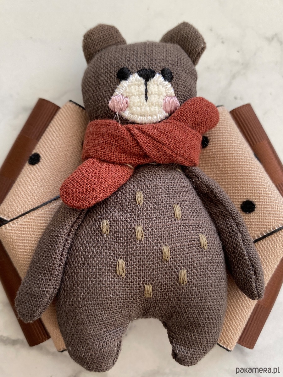 Miś 3d z czadowym szalikiem, wszystko w kolorach brązu.