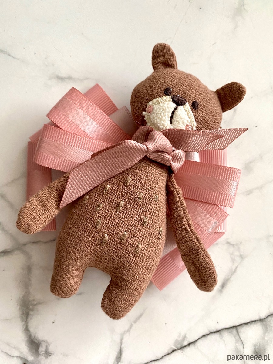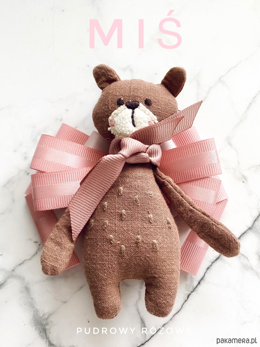 Jesienny Miś to już kultowa Brosza mojego pomysłu, tym razem Miś jest w jaśniejszym wydaniu i zamiast szalika ma podwójną różową kokardkę.