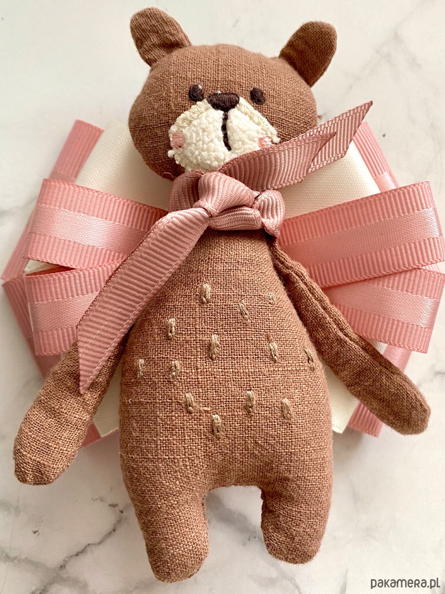 Jesienny Miś to już kultowa Brosza mojego pomysłu, tym razem Miś jest w jaśniejszym wydaniu i zamiast szalika ma podwójną różową kokardkę.