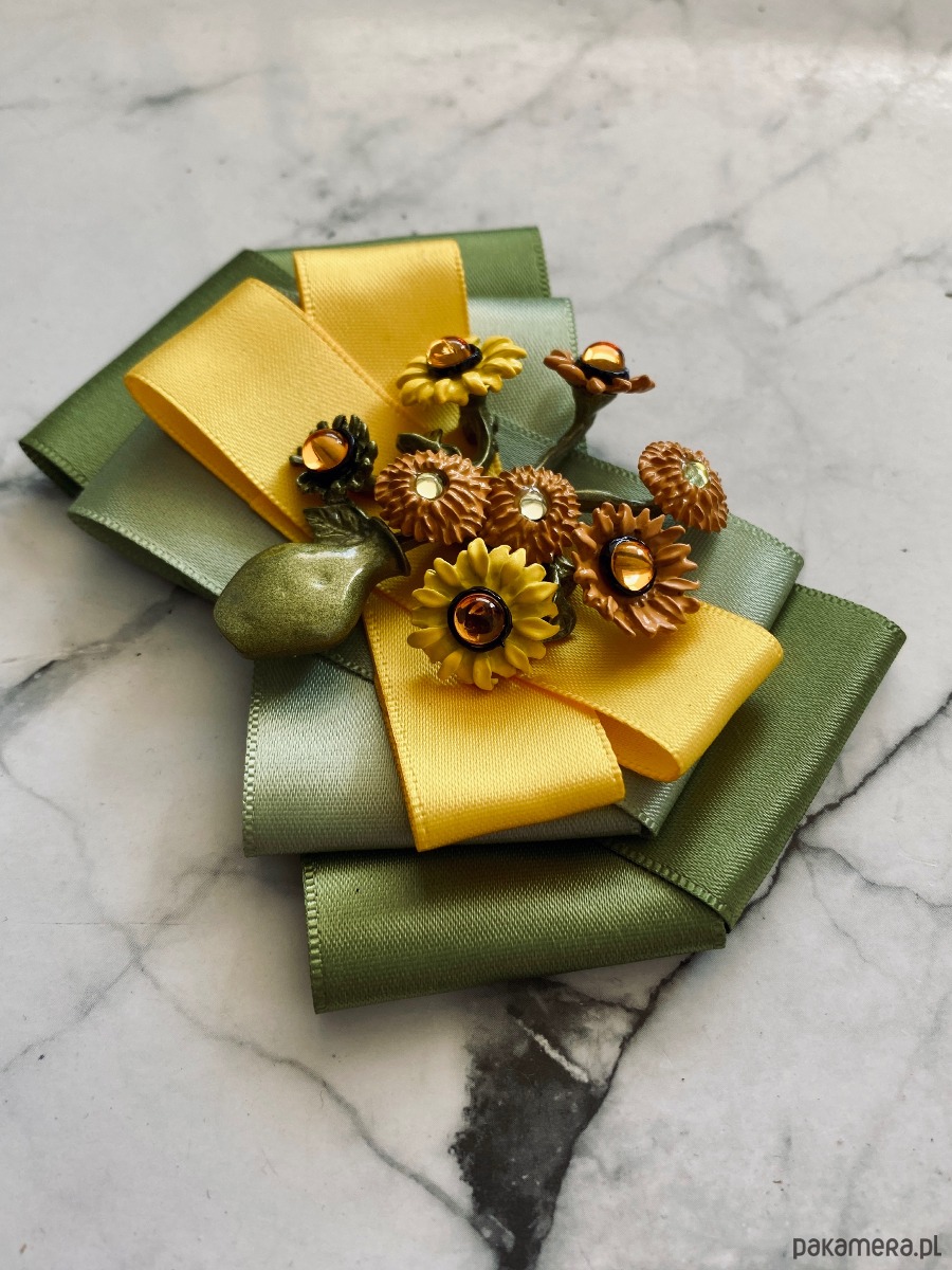 Broszka wykonana z wysokiej jakości taśm i dodatków.
