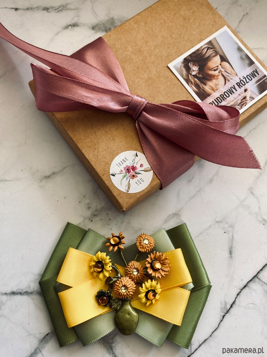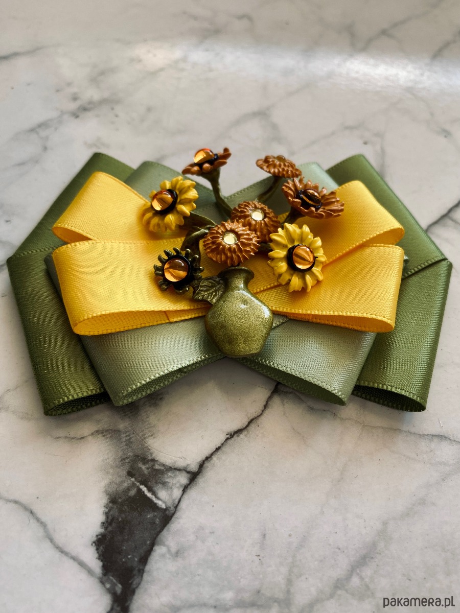Broszka wykonana z wysokiej jakości taśm i dodatków.