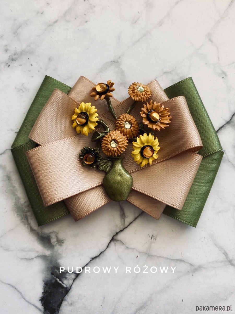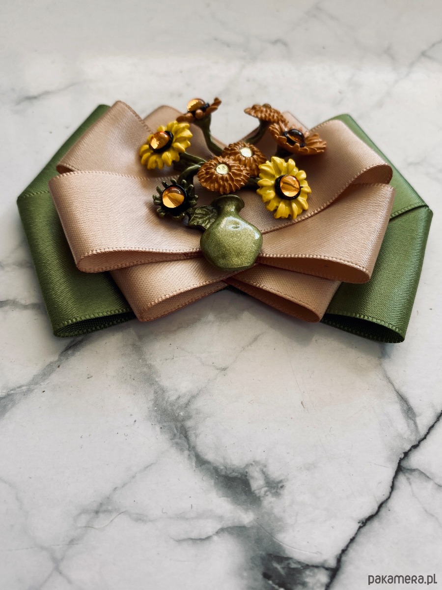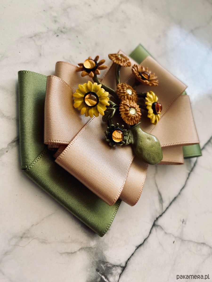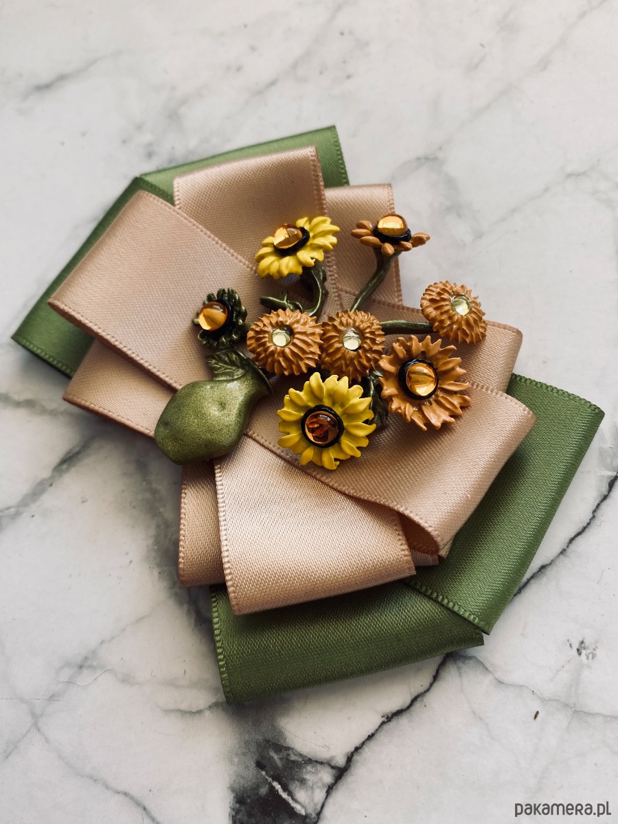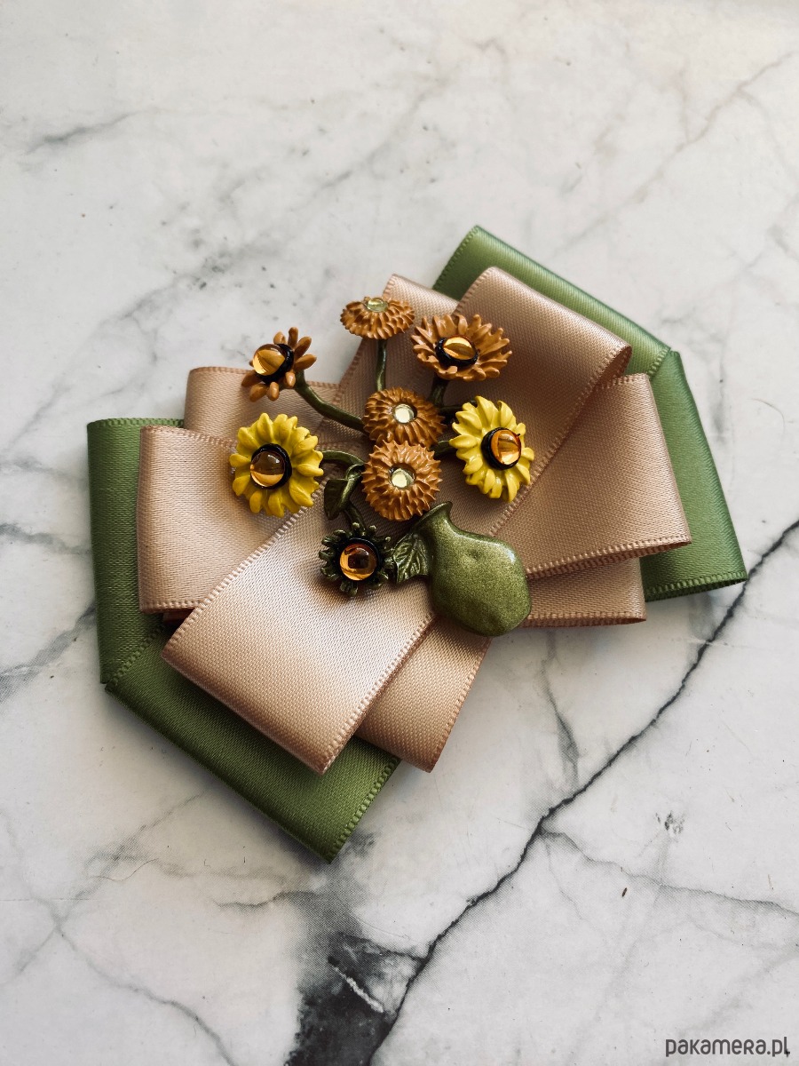 Broszka wykonana z wysokiej jakości taśm i dodatków.