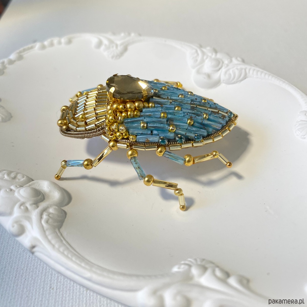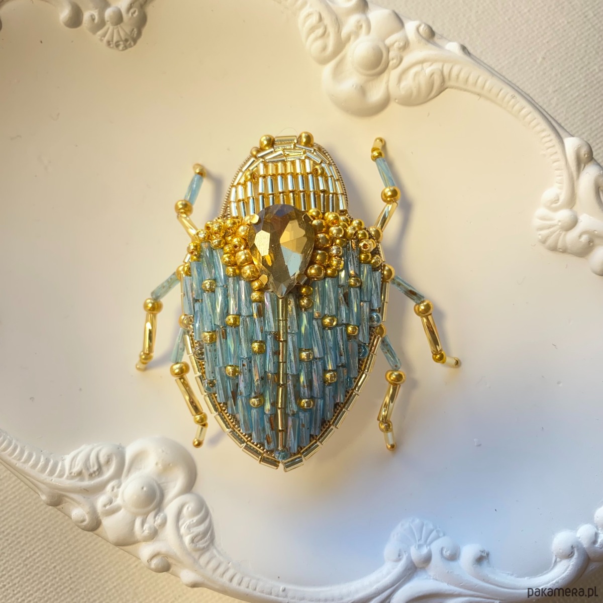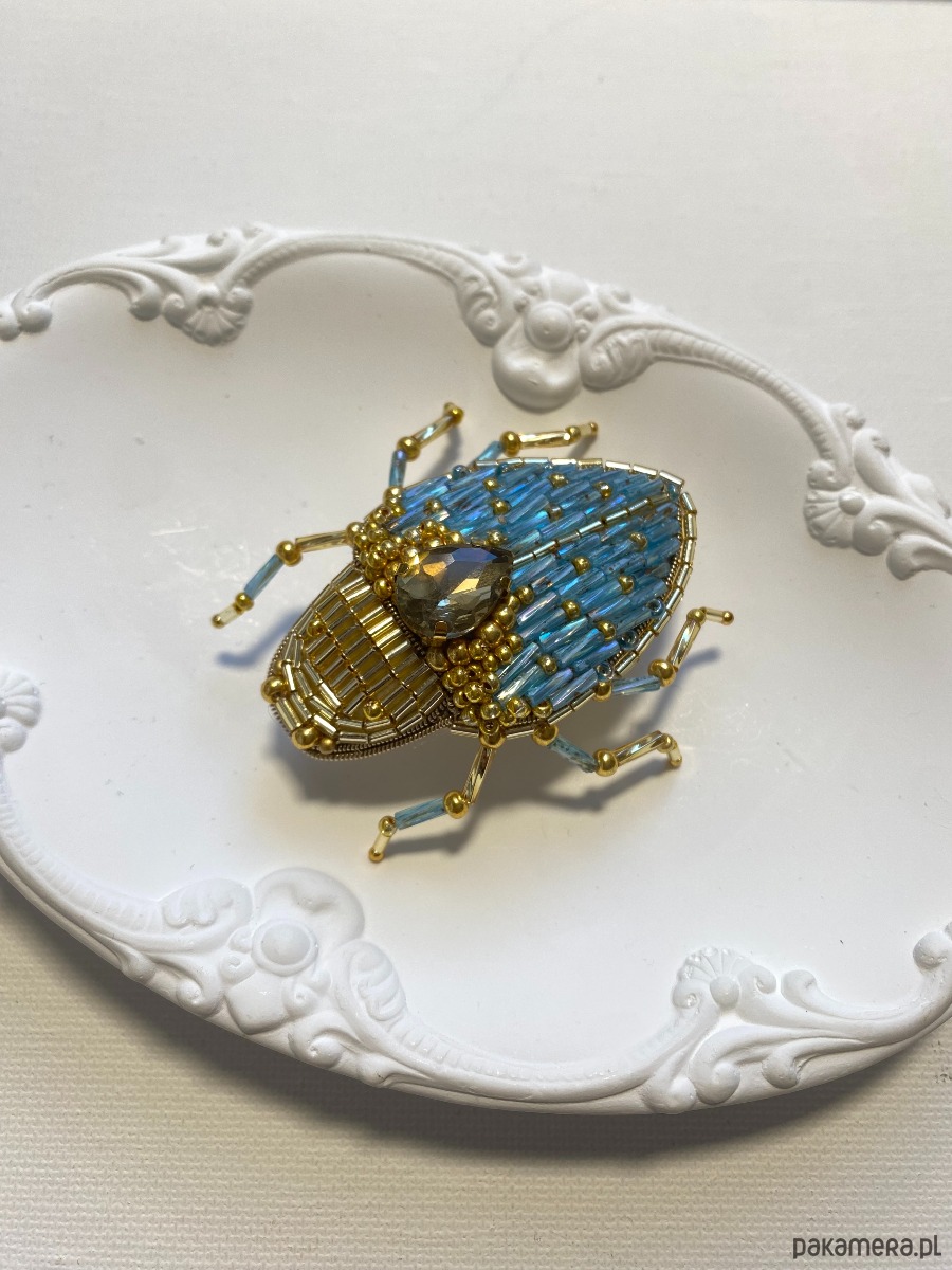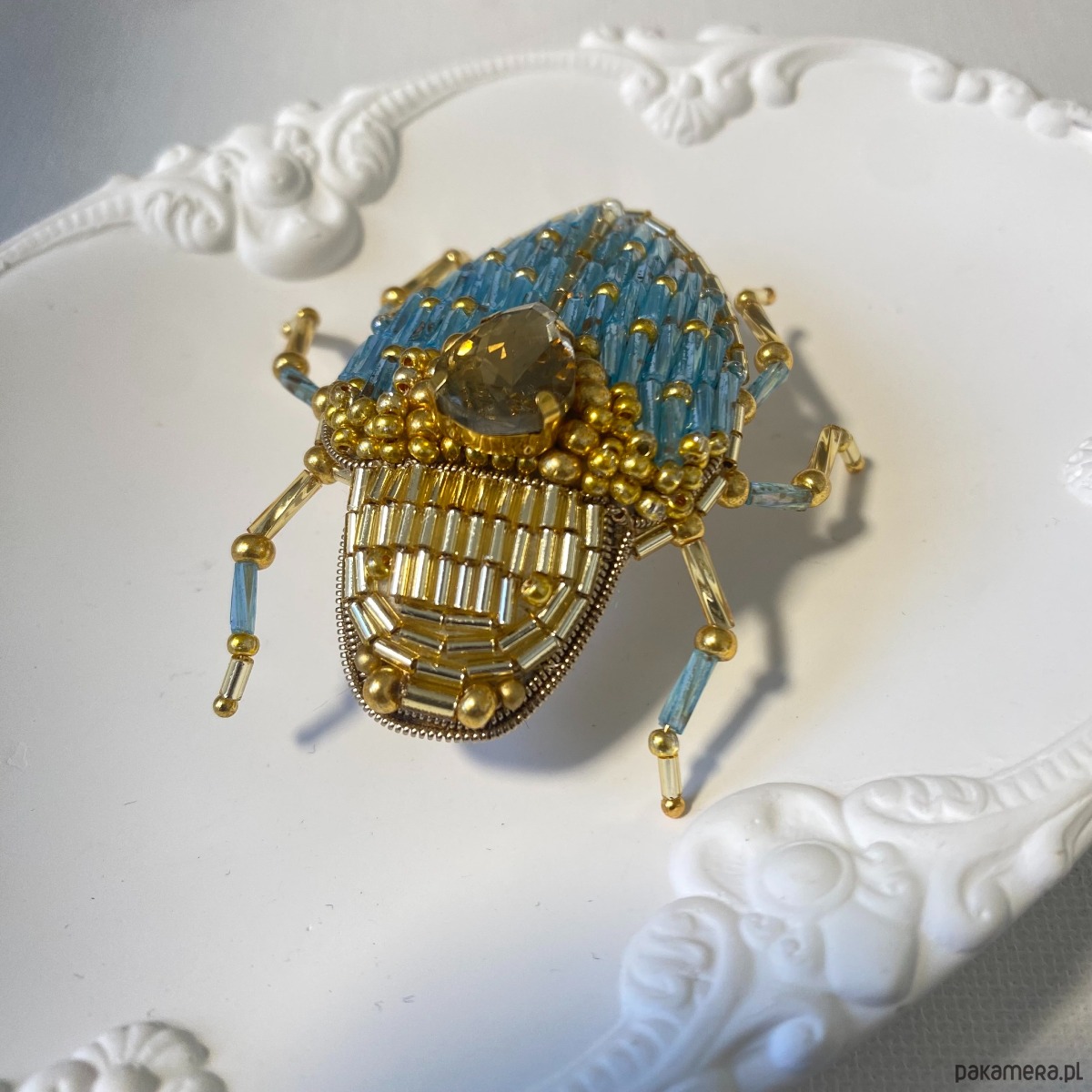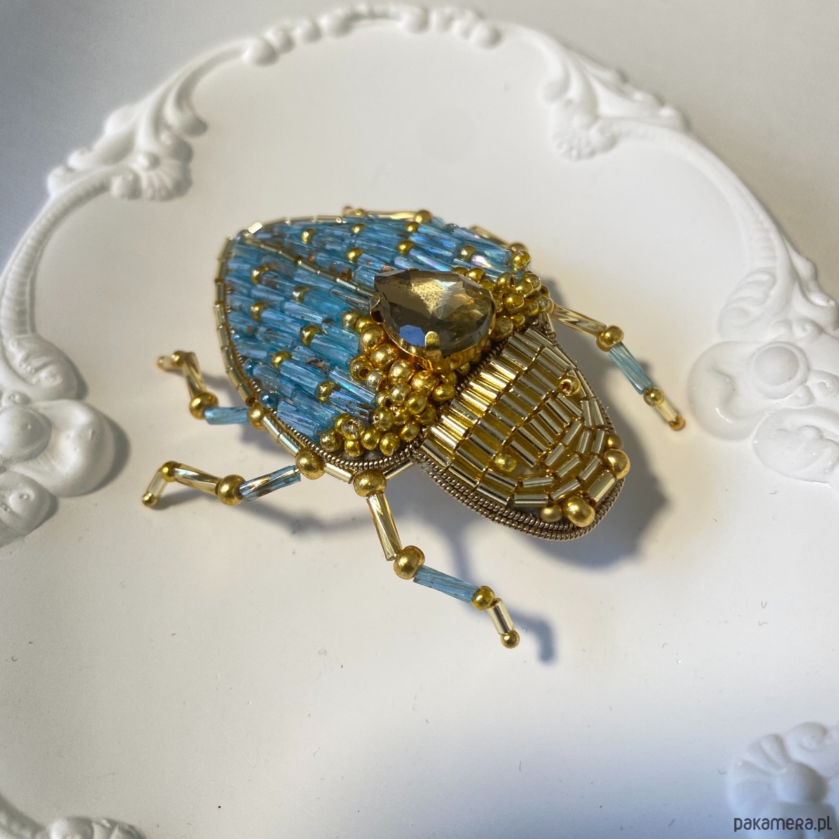 Przedstawiam unikatową, autorską broszkę w kształcie żuka, wykonaną z najwyższą precyzją techniką haftu koralikowego. Wyrazista kolorystyka głębokiego błękitu połączona ze złotymi detalami oraz lśniącym kryształem w centrum tworzy elegancką, biżuteryjną kompozycję.