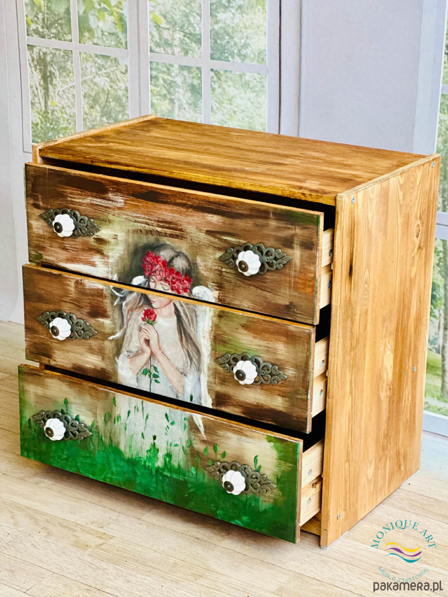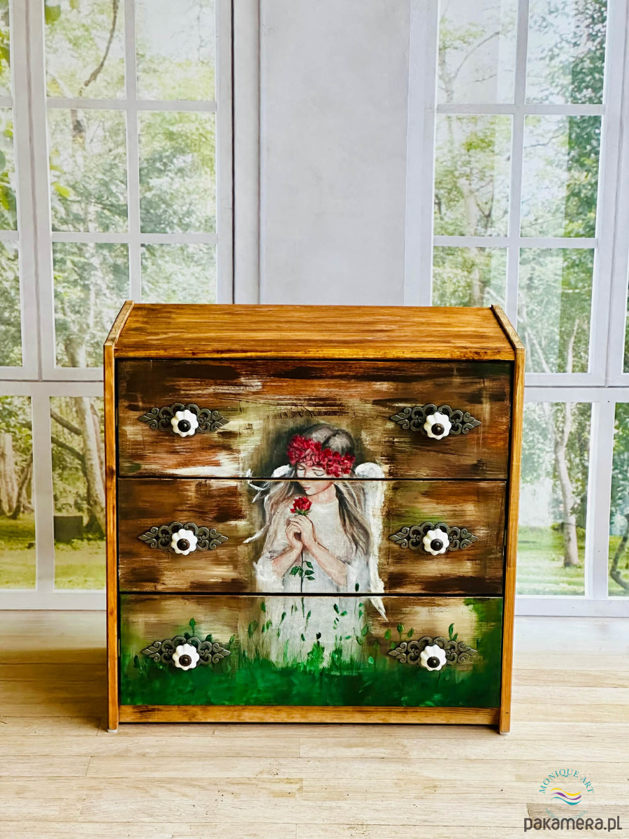 Artystyczna komoda z motywem anioła, rustykalny klimat, do salonu lub sypialni
