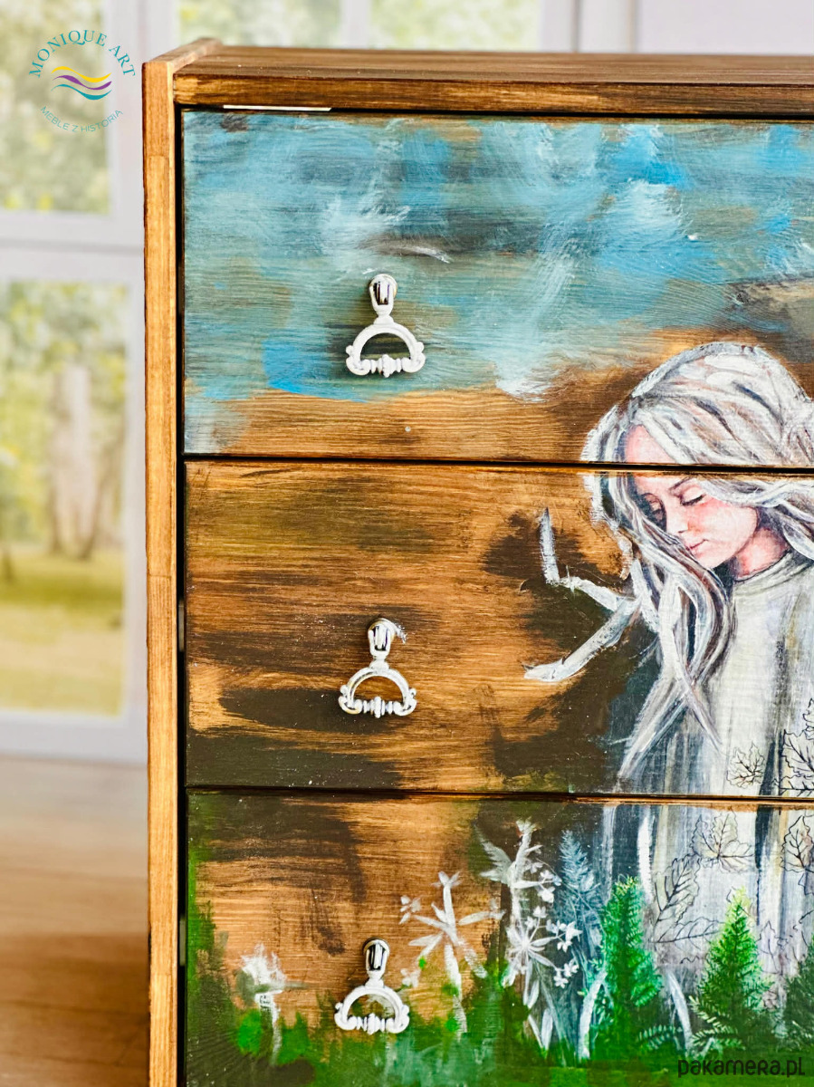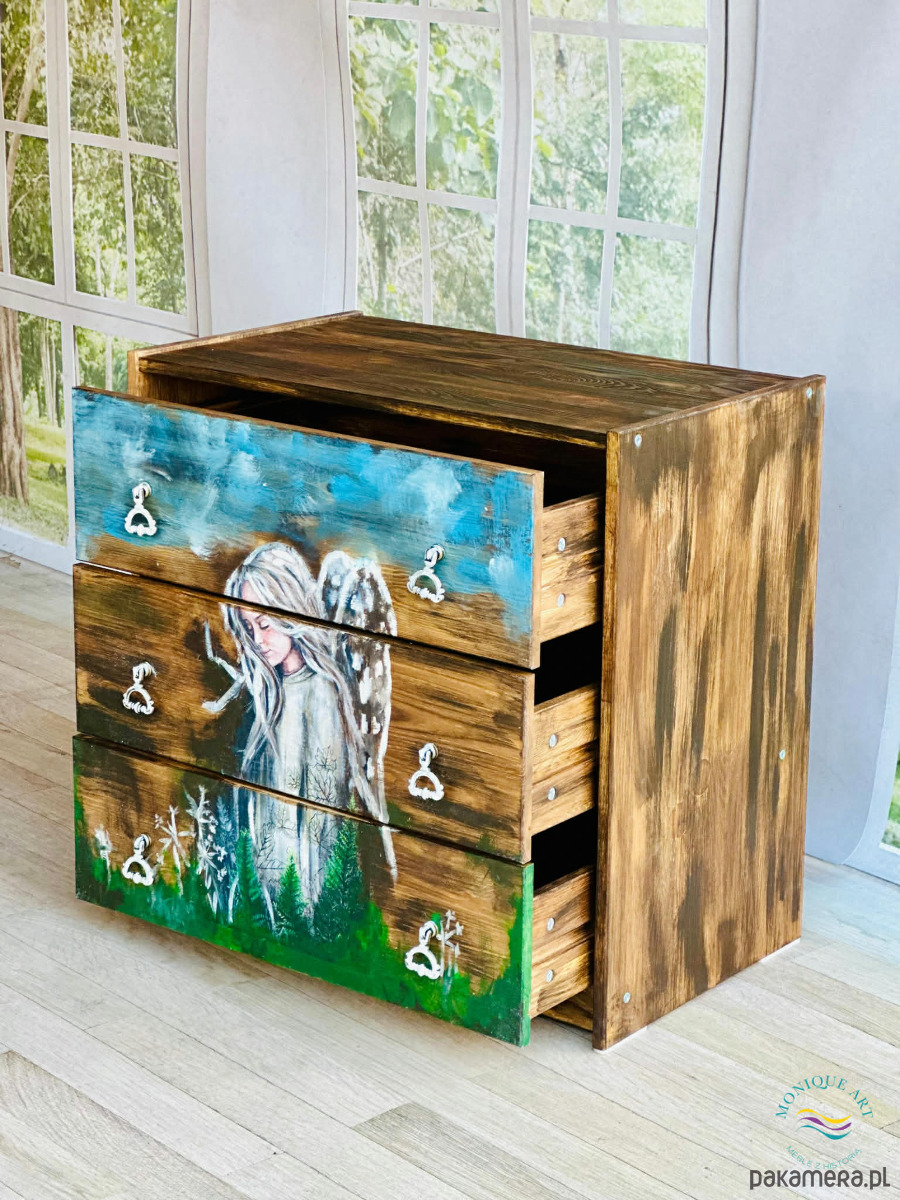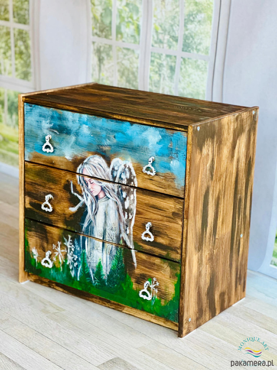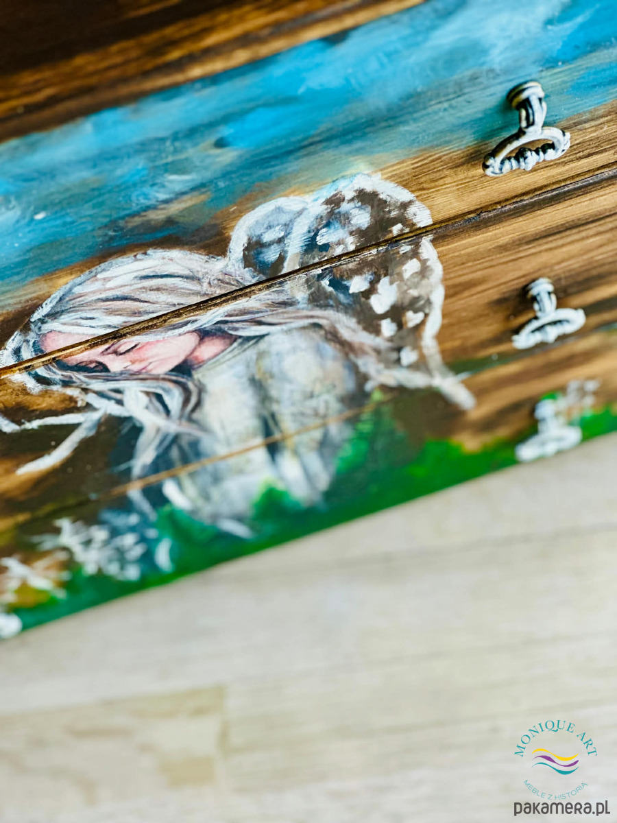 Artystyczna komoda z motywem anioła, rustykalny klimat, do salonu lub sypialni