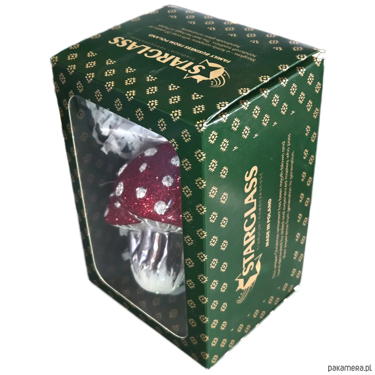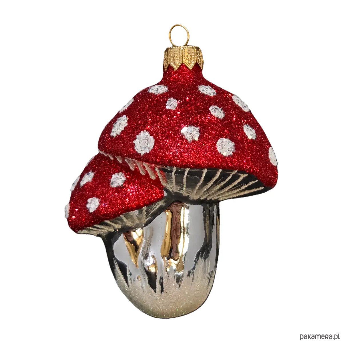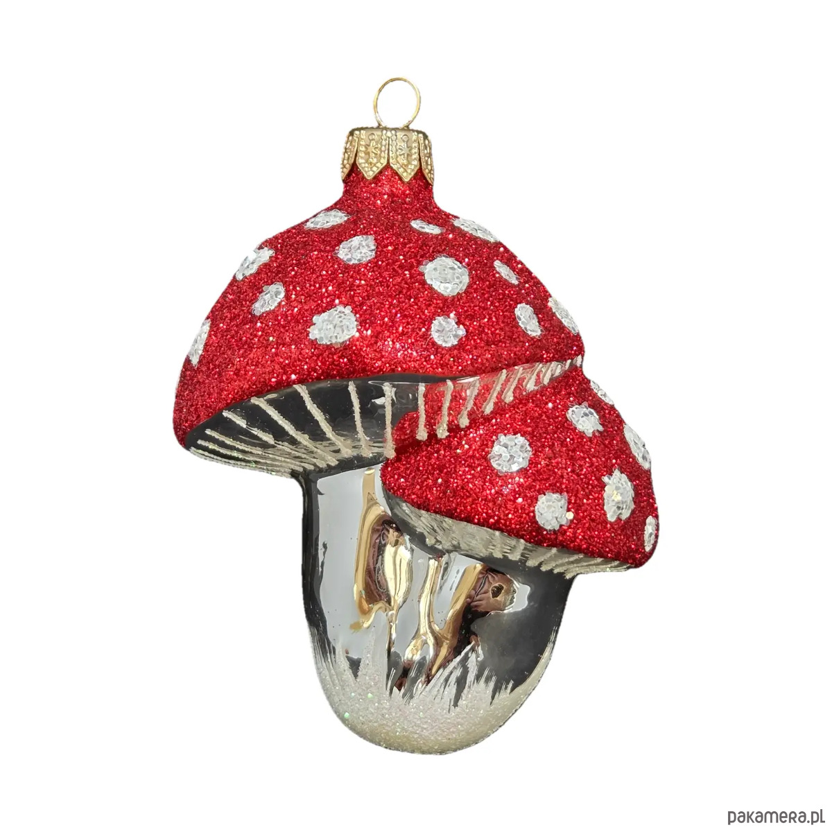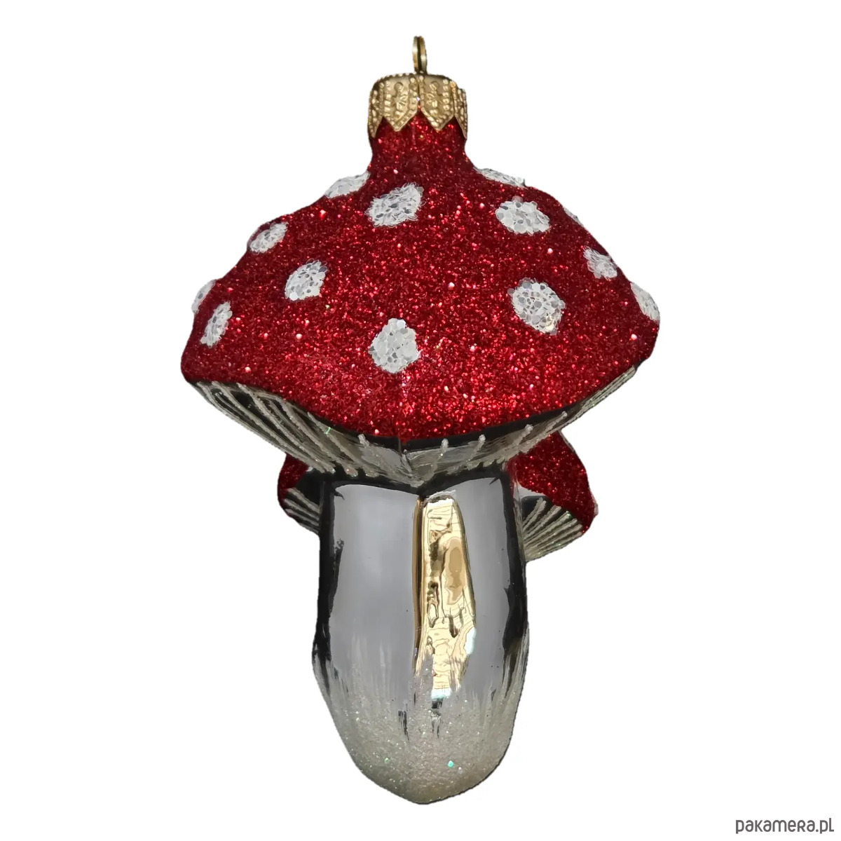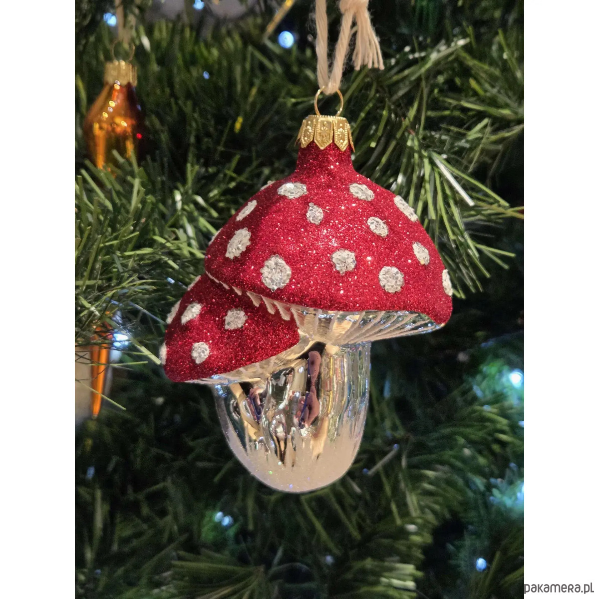 Ręcznie malowana bombka szklana brokatowe czerwone muchomory