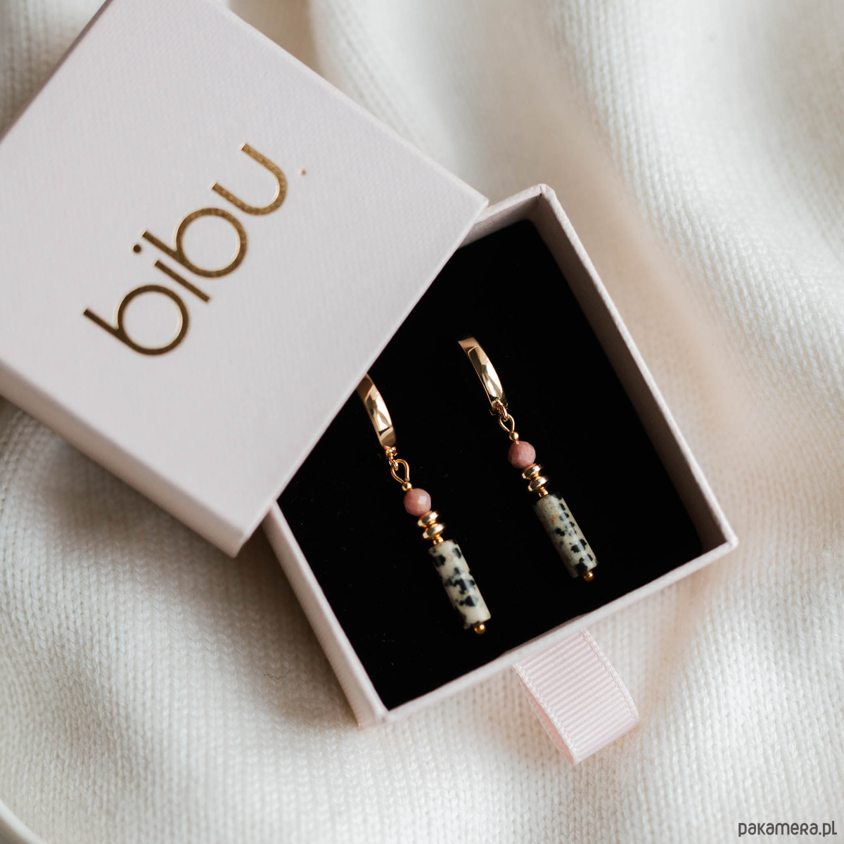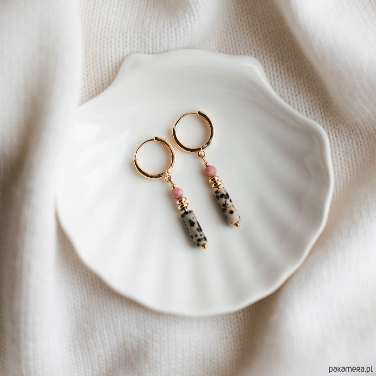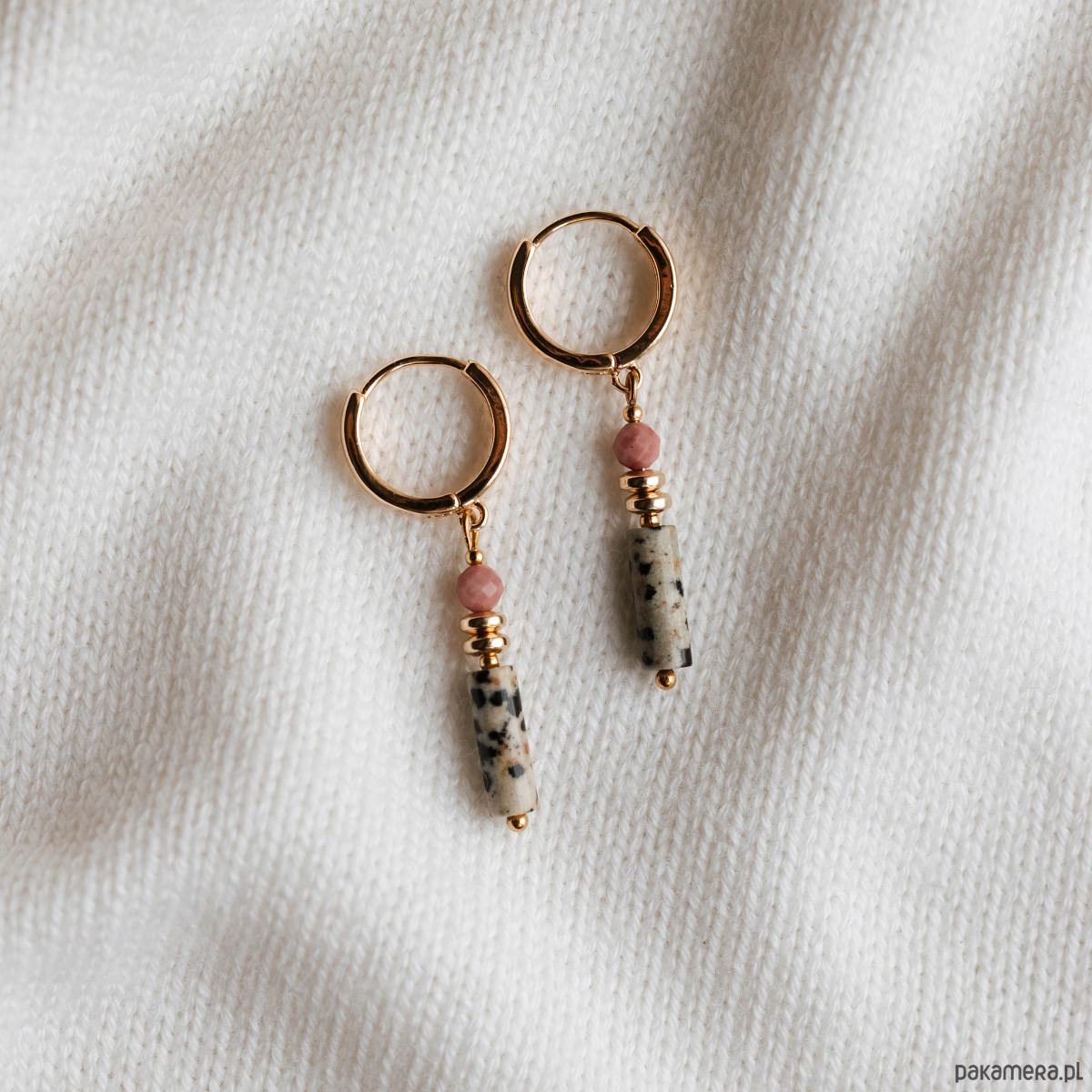 Wyjątkowe, artystyczne kolczyki inspirowane sztuką, wykonane z naturalnych kamieni: jaspis dalmatyński i rodonit. Złote elementy ze stali nierdzewnej zapewniają trwałość i piękny połysk.