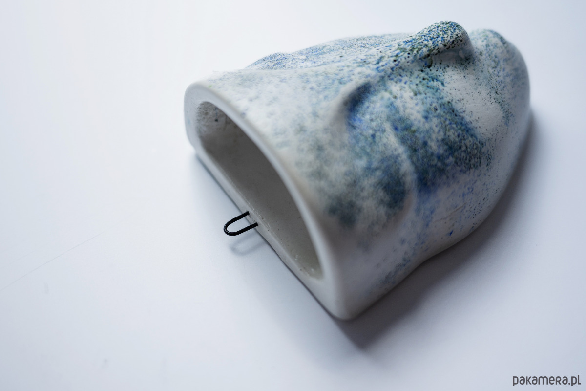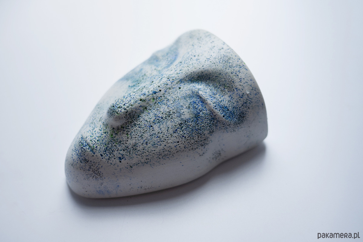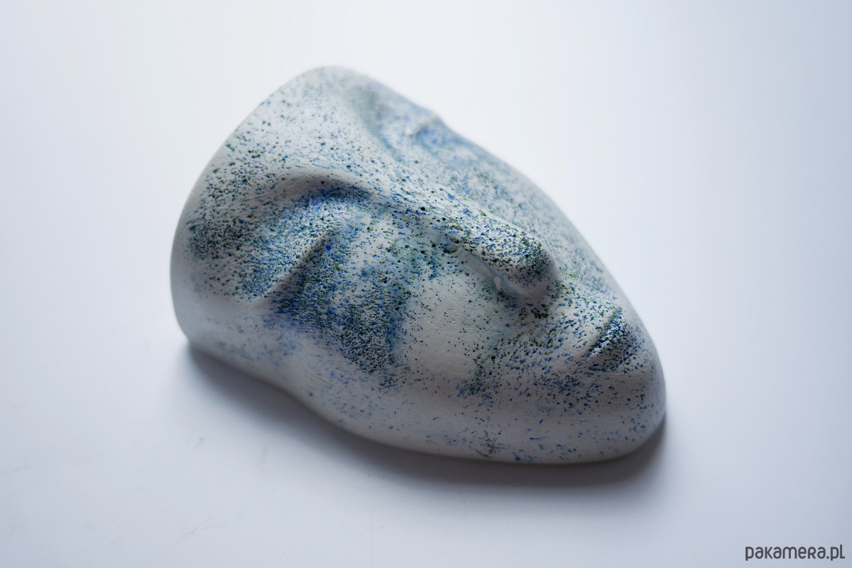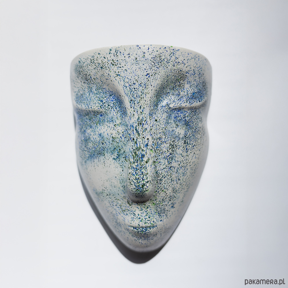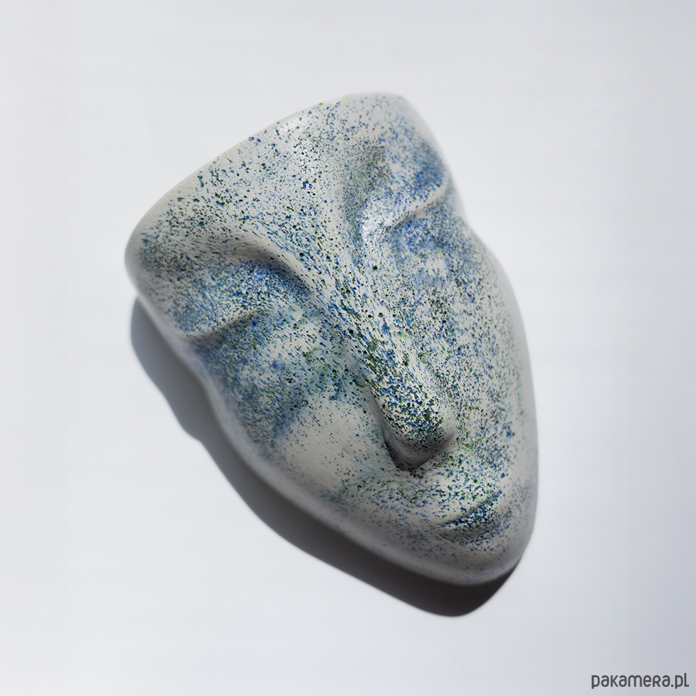 Dekoracyjna głowa w jasnych odcieniach z niebieskimi mazami i kropkami to unikatowy egzemplarz — subtelny, a jednocześnie przyciągający wzrok niczym małe dzieło sztuki.