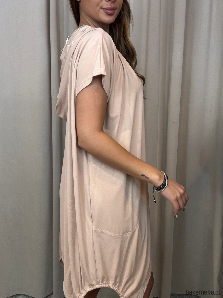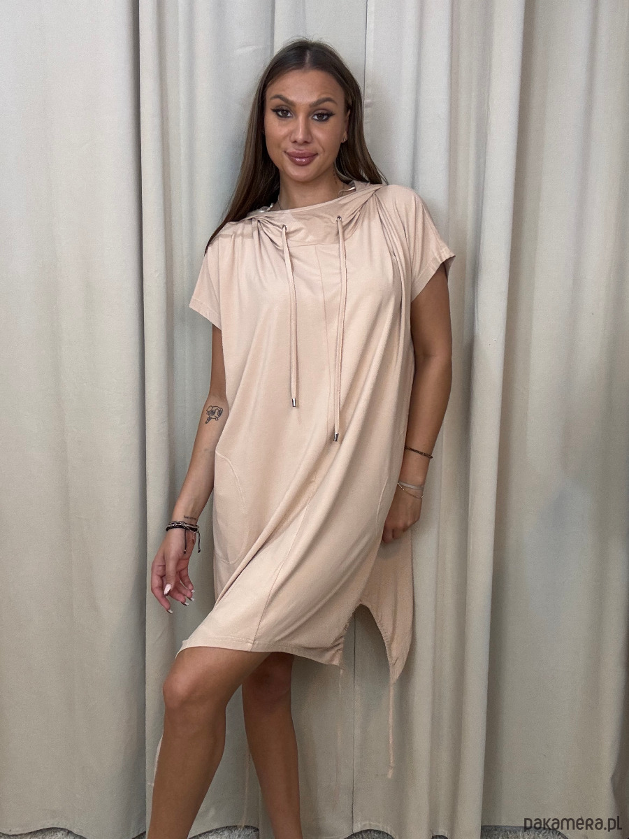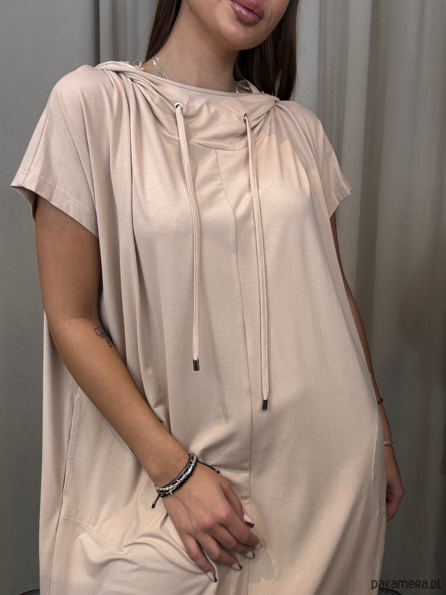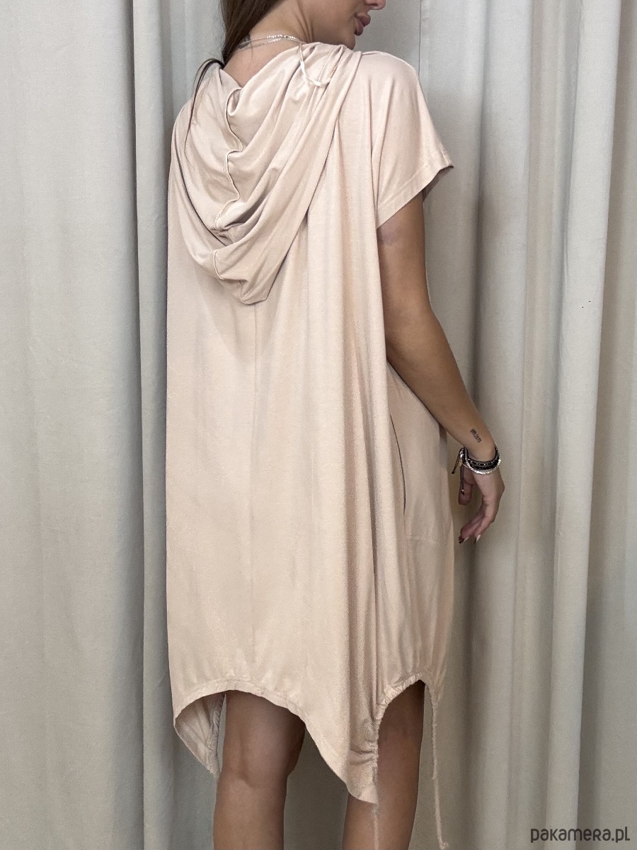 Tunika oversize w beżowym odcieniu cappuccino z kapturem. Wykonana z wysokogatunkowej, przyjemnej w dotyku wiskozy. Opadająca linia ramion i krótki rękaw. Asymetrycznie wykończony dół z ściąganymi na dole trokami. Tunika o swobodnej formie pozwala zaszaleć z jej stylizacją.