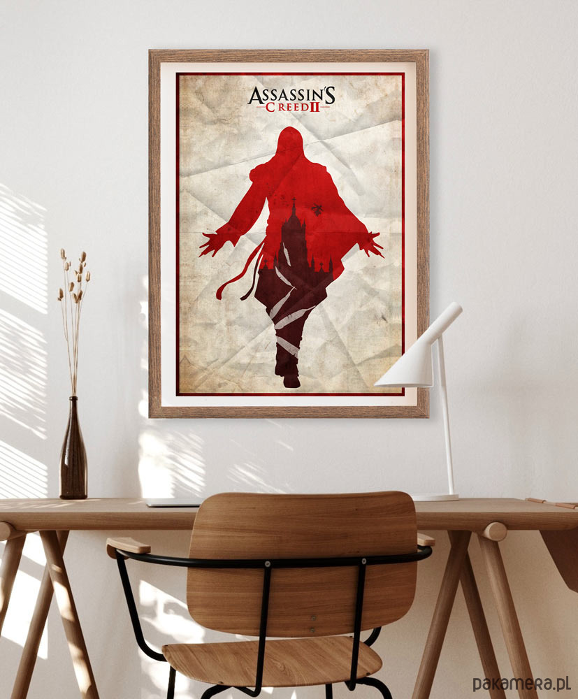 Plakat inspirowany grą Assassin's Creed II wydaną przez Ubisoft. Na grafice znajdziemy zarys głównego bohatera w krwiście czerwonym kolorze. Idealna dekoracja domu dla fanów gry i serialu.