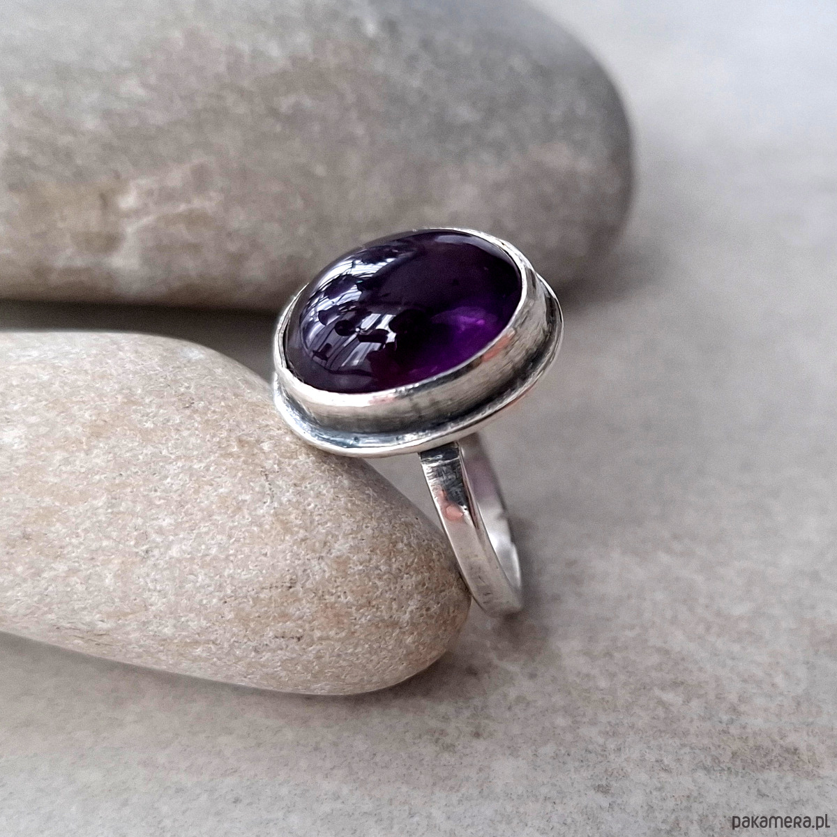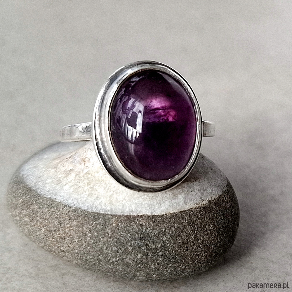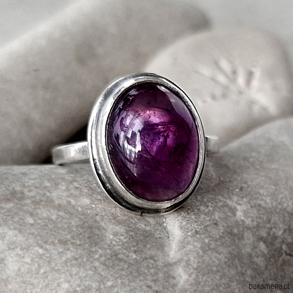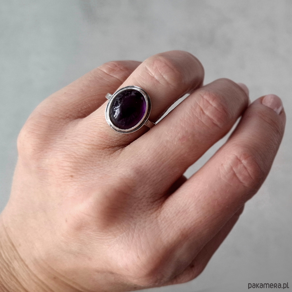 Srebrny pierścień o owalnym klasycznym kształcie z fioletowym kaboszonem ametystu. Kamień o głębokiej fioletowej barwie osadzony jest w klasycznym koszyczku. Wymiary korony pierścionka: ok 13x16mm. Rozmiar obrączki 14. Całość została zoksydowana i wypolerowana. Biżuteria zostanie ozdobnie zapakowana.
