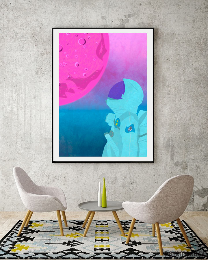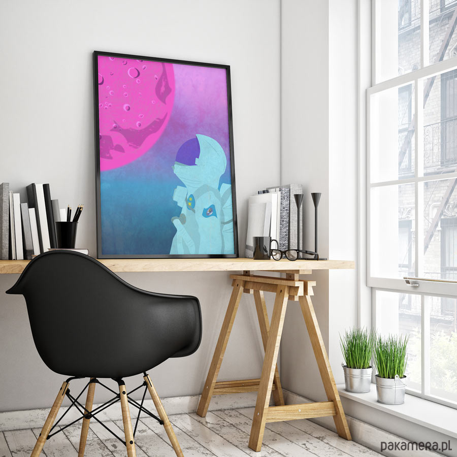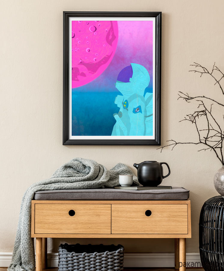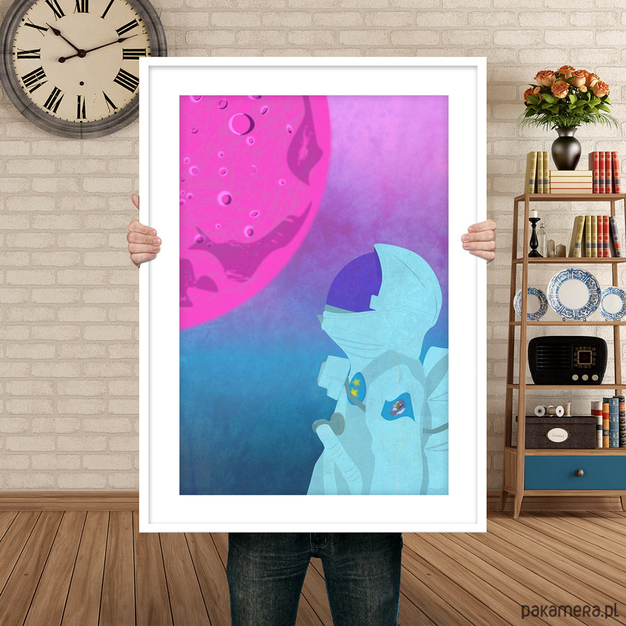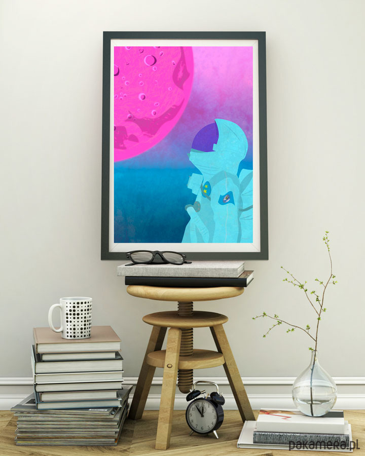 Plakat z autorską grafiką przedstawiający astronautę wpatrującego się w różowy księżyc na obcej planecie.