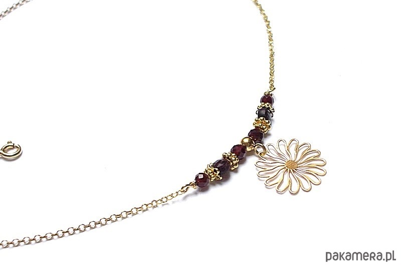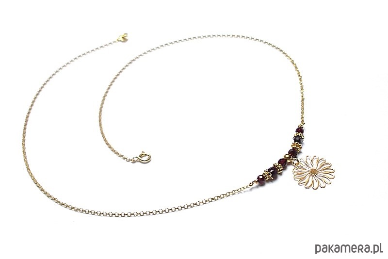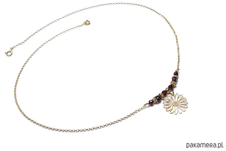 Delikatny naszyjnik wykonany ze srebra pokrytego 24k złotem [pr. 925] w połączeniu z fasetowanymi granatami [3mm, 4mm i 5mm]. Całkowita długość naszyjnika 49,3cm. Biżuteria ozdobnie zapakowana.