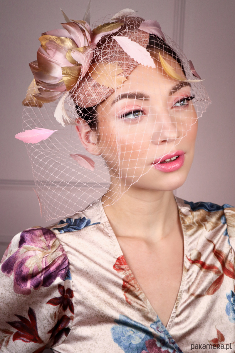 Woalka: Lekka, siateczkowa woalka w kolorze brudnego różu, która dodaje tajemniczości i szyku.