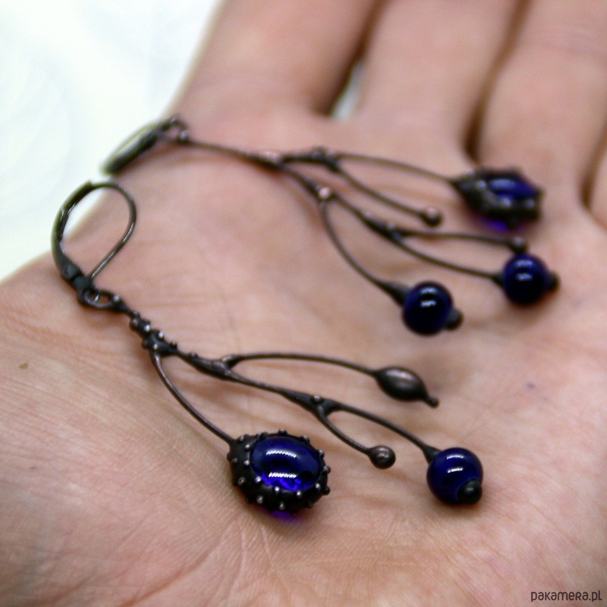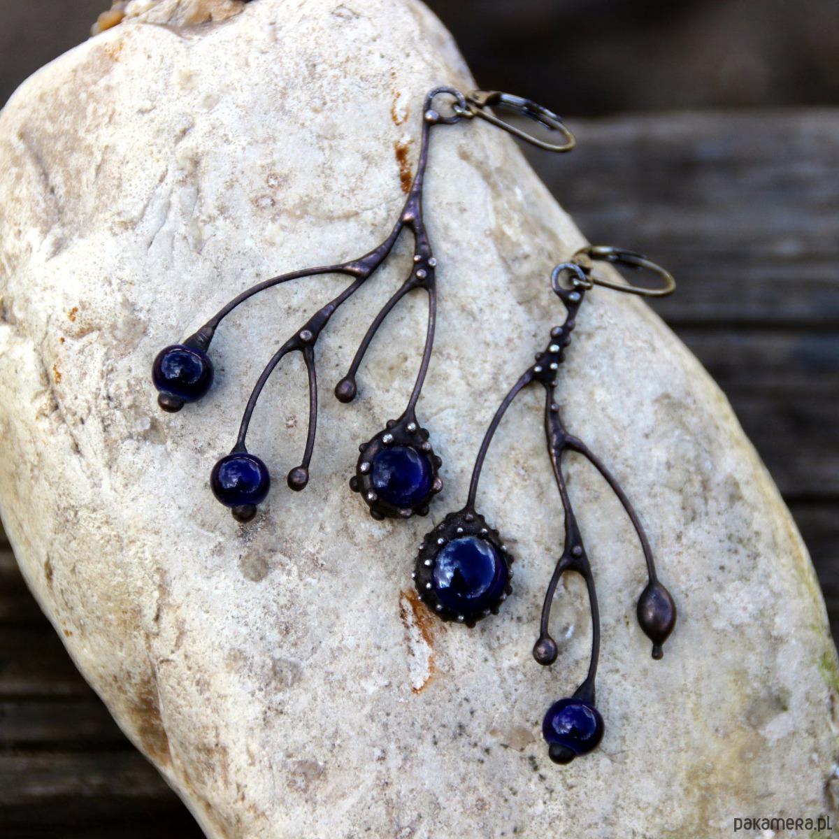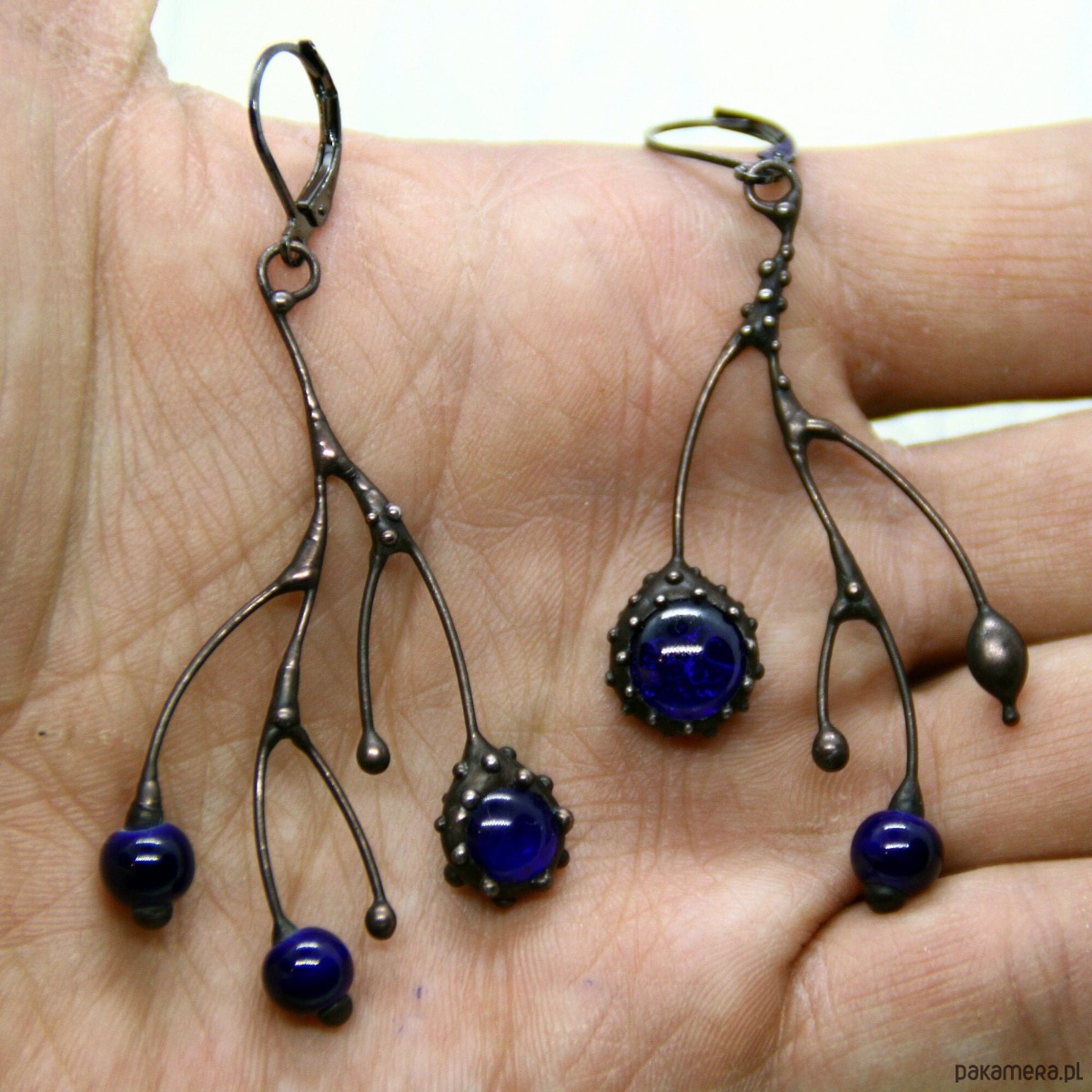 Asymetryczne kolczyki w kształcie gałęzi drzewa leśnego wykonane z miedzi, stopu cyny, stali i niebieskiego szkła. Są lekkie, cienkie i asymetryczne. Wszystkie elementy są wykonane ręcznie, co zapewnia indywidualność każdego produktu wytworzonego w warsztacie Yadovito. Stop cyny i miedzi pokryty jest czarną patyną, która nadaje metalowi czarny kolor, a następnie polerowany roztworem wykończeniowym, aby nadać biżuterii szlachetny wygląd, a jednocześnie zapobiec utlenianiu się metalu. W kolczykach wykorzystano szkło stopione w specjalnym piecu. Po stopieniu szkło nabiera niemal unikalnego kształtu i niesamowitych odcieni kolorów, które mienią się w świetle. Rozmiar około 6/3 cm. Kolor czarny/niebieski.