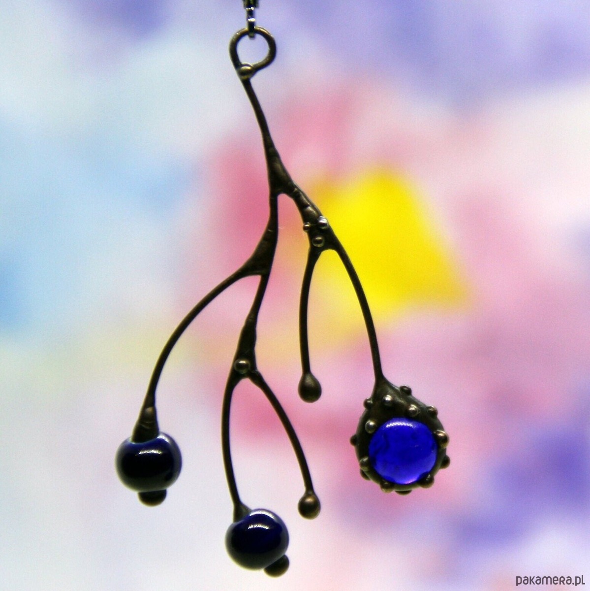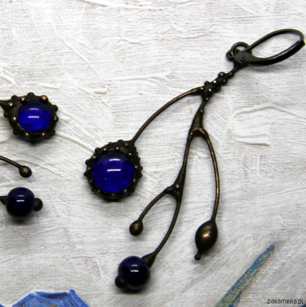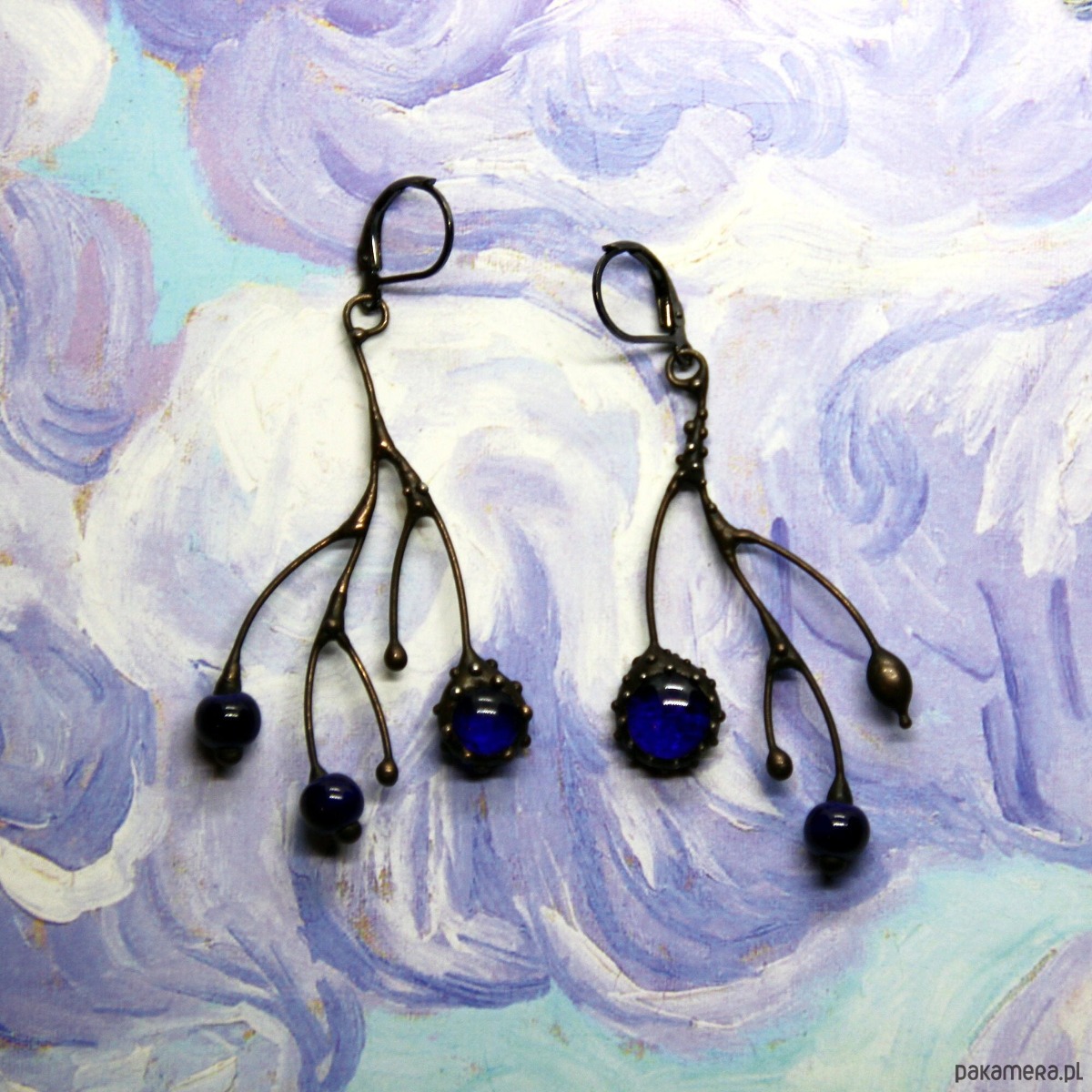 Asymetryczne kolczyki w kształcie gałęzi drzewa leśnego wykonane z miedzi, stopu cyny, stali i niebieskiego szkła. Są lekkie, cienkie i asymetryczne. Wszystkie elementy są wykonane ręcznie, co zapewnia indywidualność każdego produktu wytworzonego w warsztacie Yadovito. Stop cyny i miedzi pokryty jest czarną patyną, która nadaje metalowi czarny kolor, a następnie polerowany roztworem wykończeniowym, aby nadać biżuterii szlachetny wygląd, a jednocześnie zapobiec utlenianiu się metalu. W kolczykach wykorzystano szkło stopione w specjalnym piecu. Po stopieniu szkło nabiera niemal unikalnego kształtu i niesamowitych odcieni kolorów, które mienią się w świetle. Rozmiar około 6/3 cm. Kolor czarny/niebieski.