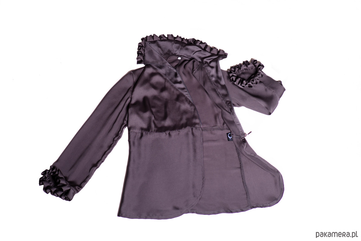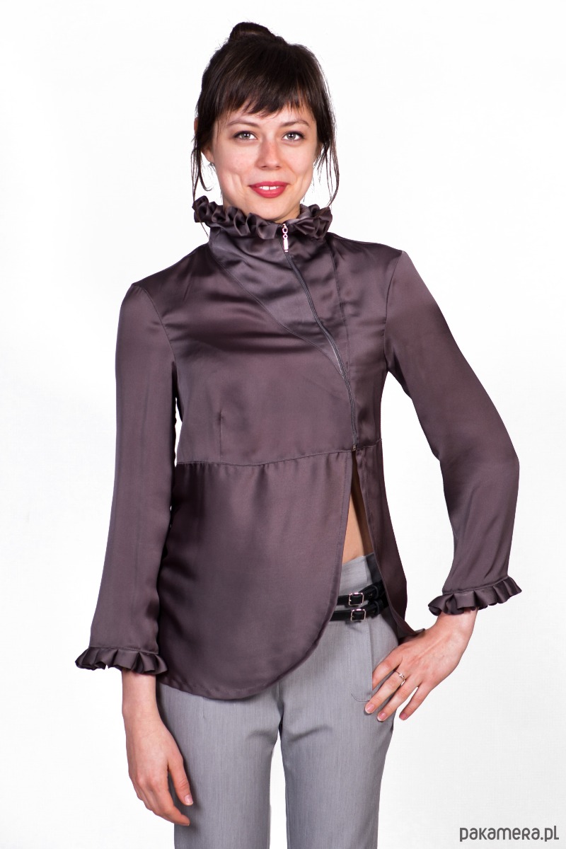 Damska koszula rozpinana z przodu. Zapinana na zamek kryty (od szczytu stójki pod biust ). Zamek przekrzywiony w lewą stronę. Kołnierz koszuli w formie wysokiej, ułożonej w kontrafałdy stójki. Stójka z przodu osadzona jest głęboko, do linii biustu. Rękaw 3/4, wykończony, ułożoną w kontrafałdy falbanką.