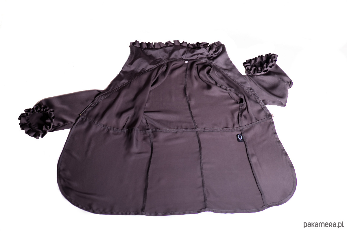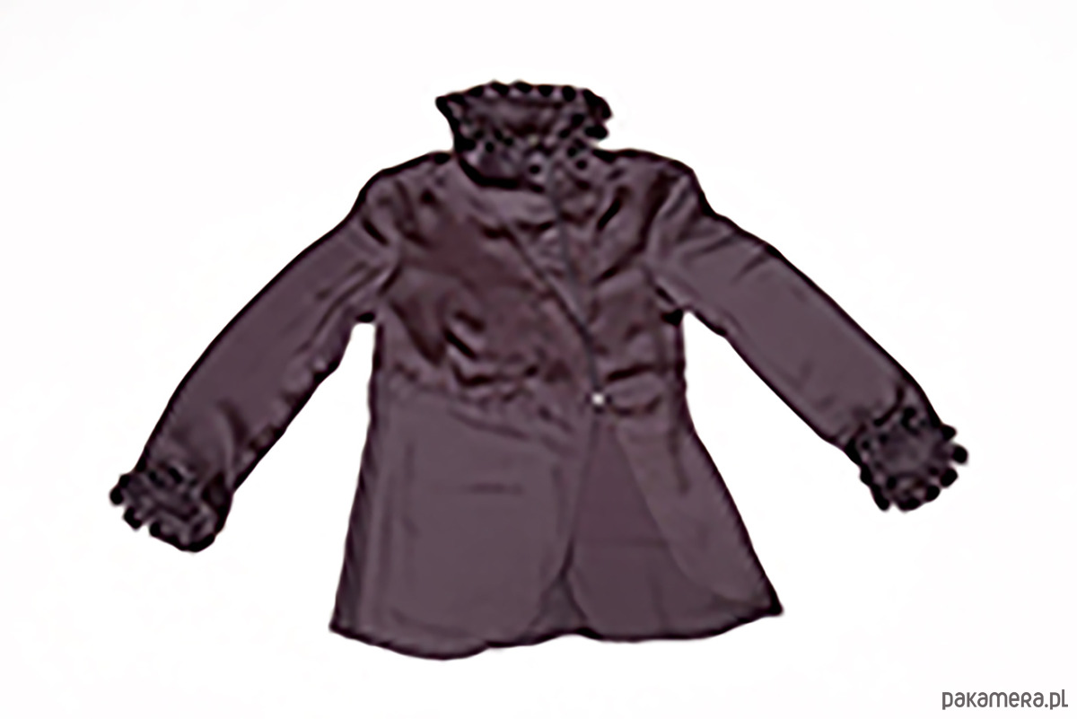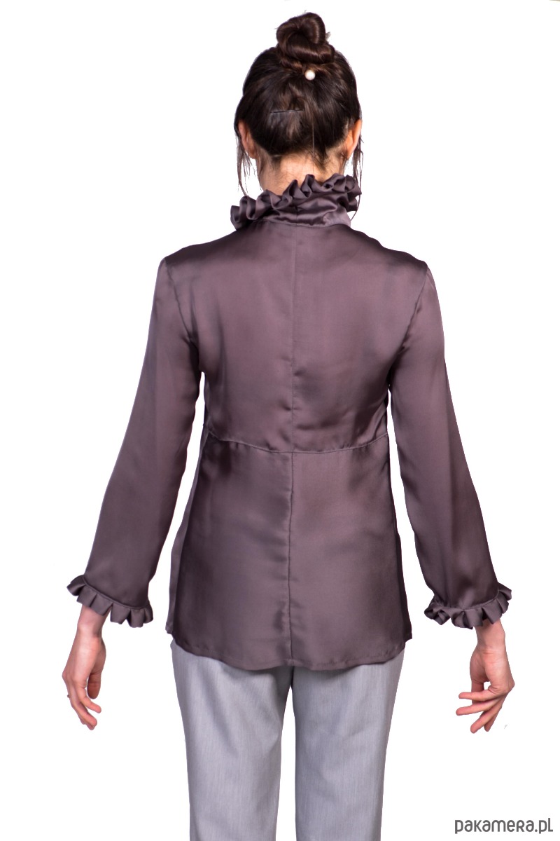 Damska koszula rozpinana z przodu. Zapinana na zamek kryty (od szczytu stójki pod biust ). Zamek przekrzywiony w lewą stronę. Kołnierz koszuli w formie wysokiej, ułożonej w kontrafałdy stójki. Stójka z przodu osadzona jest głęboko, do linii biustu. Rękaw 3/4, wykończony, ułożoną w kontrafałdy falbanką.