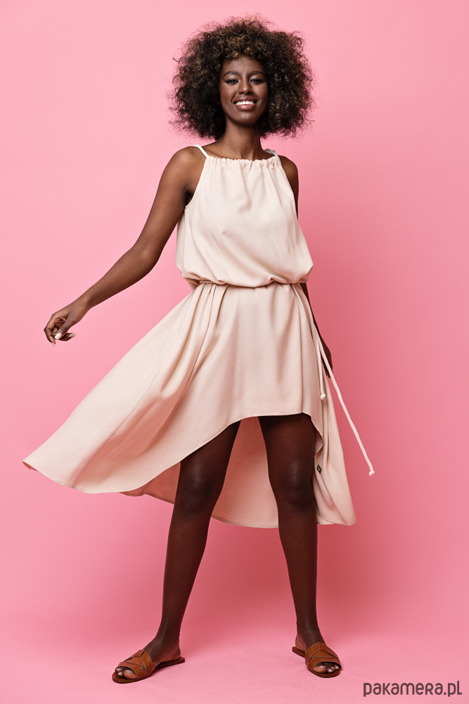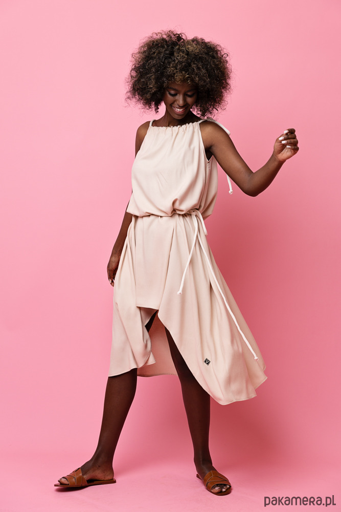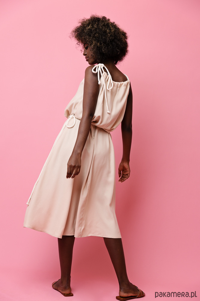 Niezwykle minimalistyczna, ale jednocześnie bardzo kobieca sukienka. Możesz ją nosić na dwa sposoby: przewiązaną i zbluzowaną w pasie dołączonym sznurkiem lub luźno puszczoną.