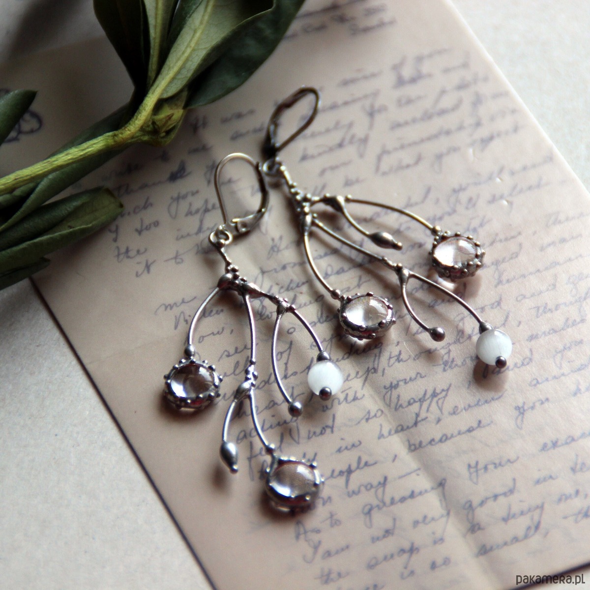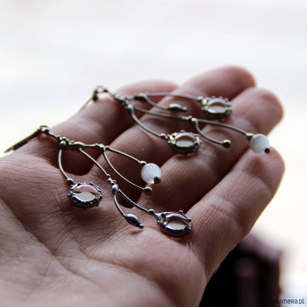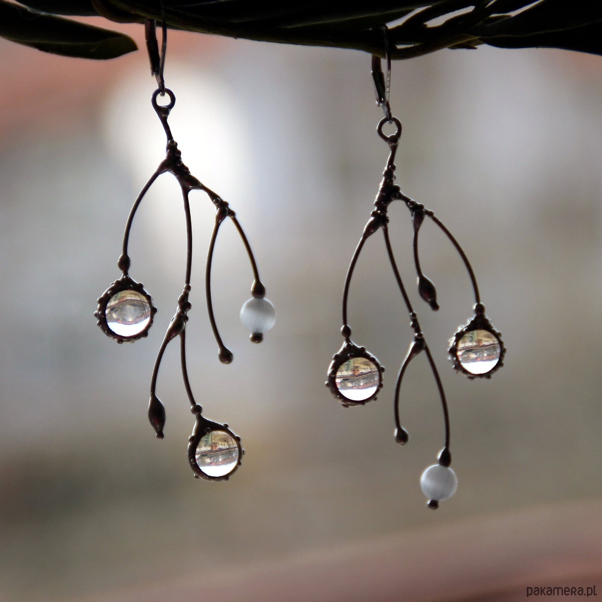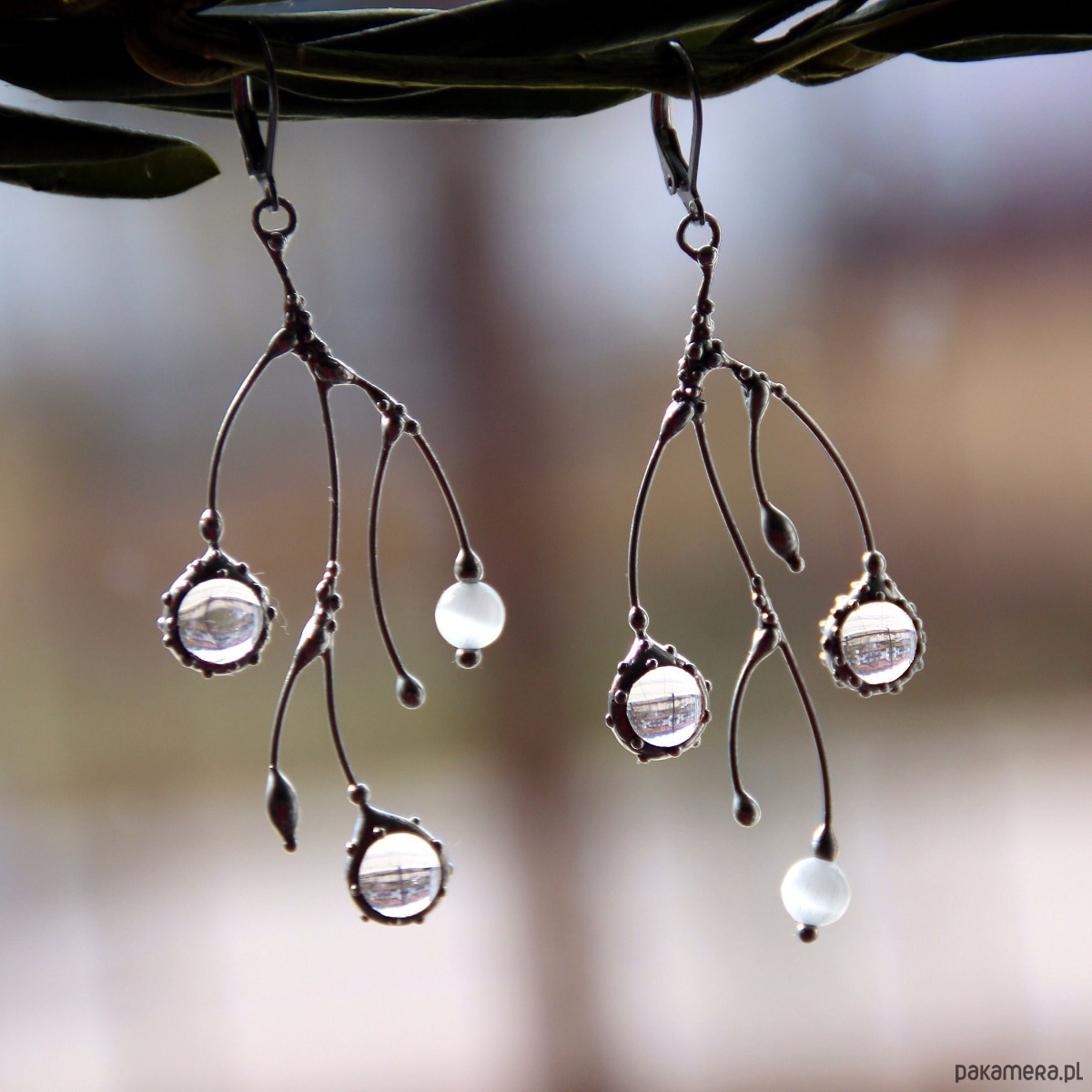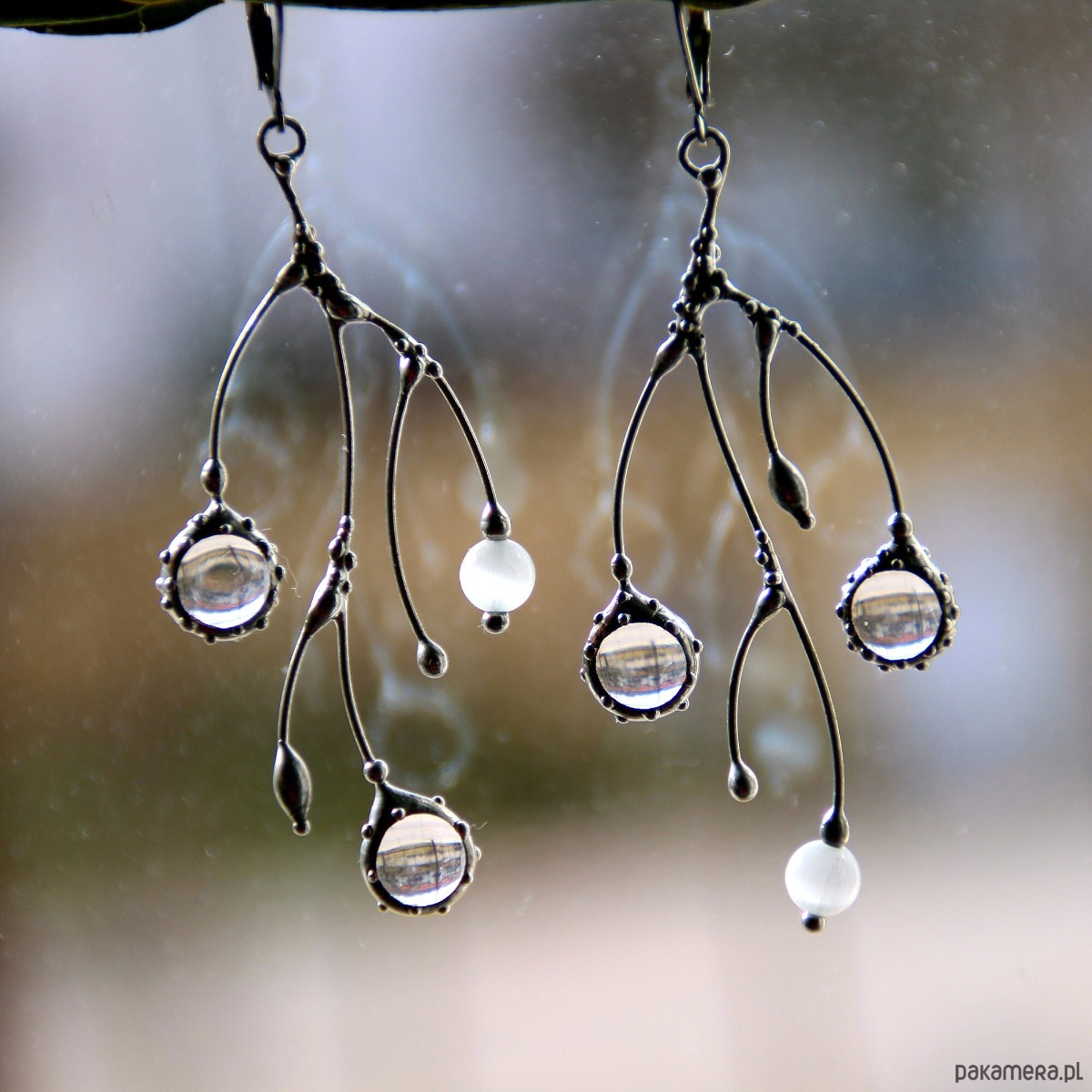 Asymetryczne kolczyki w kształcie gałęzi drzewa wykonane z miedzi, stopu cyny, stali i przezroczystego szkła. Lekkie, solidne i asymetryczne. Wszystkie elementy są wykonane ręcznie, co zapewnia indywidualność każdego produktu wytworzonego w warsztacie Yadovito. Stop cyny i miedzi jest polerowany roztworem wykończeniowym, aby nadać biżuterii szlachetny wygląd, a jednocześnie zapobiec utlenianiu się metalu. W kolczykach wykorzystano szkło stopione w specjalnym piecu. Po stopieniu szkło nabiera niemal unikalnego kształtu i niesamowitych odcieni kolorów, które mienią się w świetle. Rozmiar około 6/3 cm. Kolor srebrny.