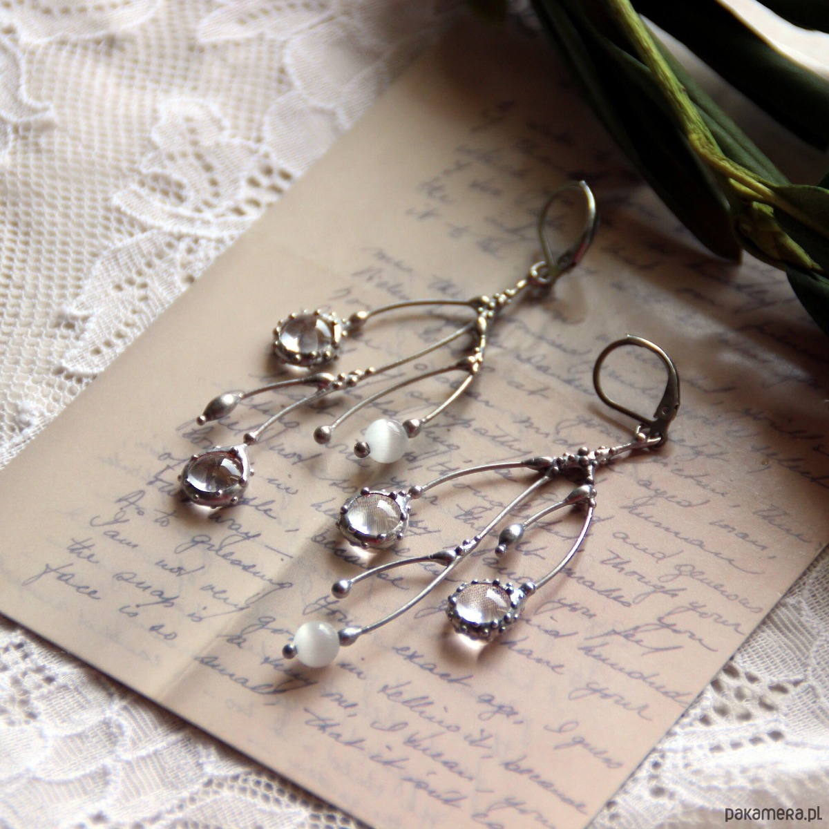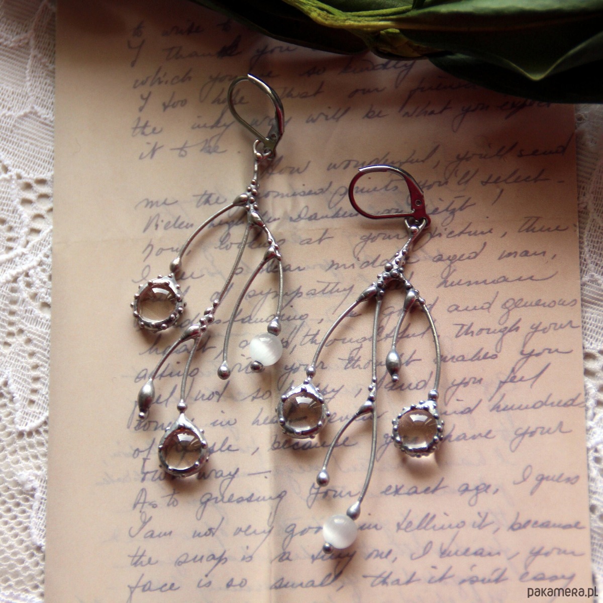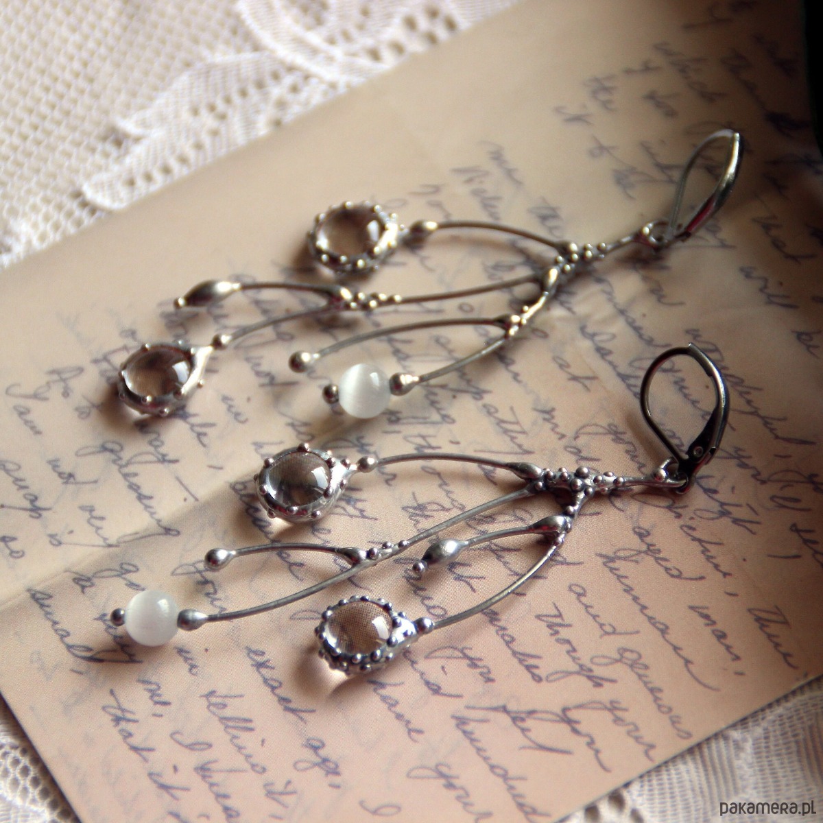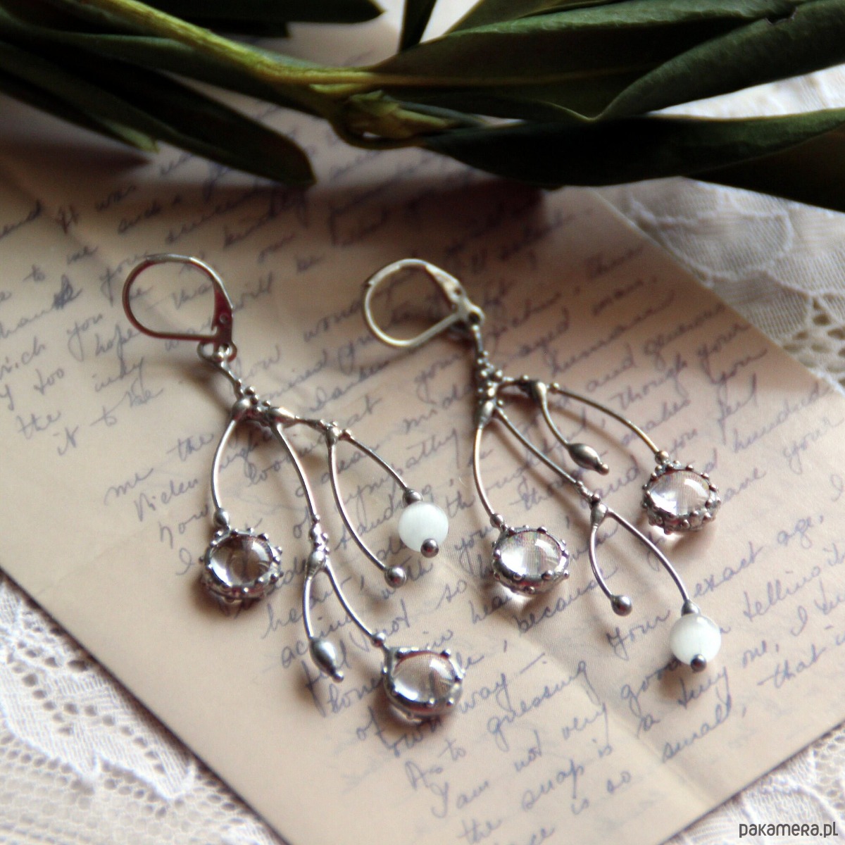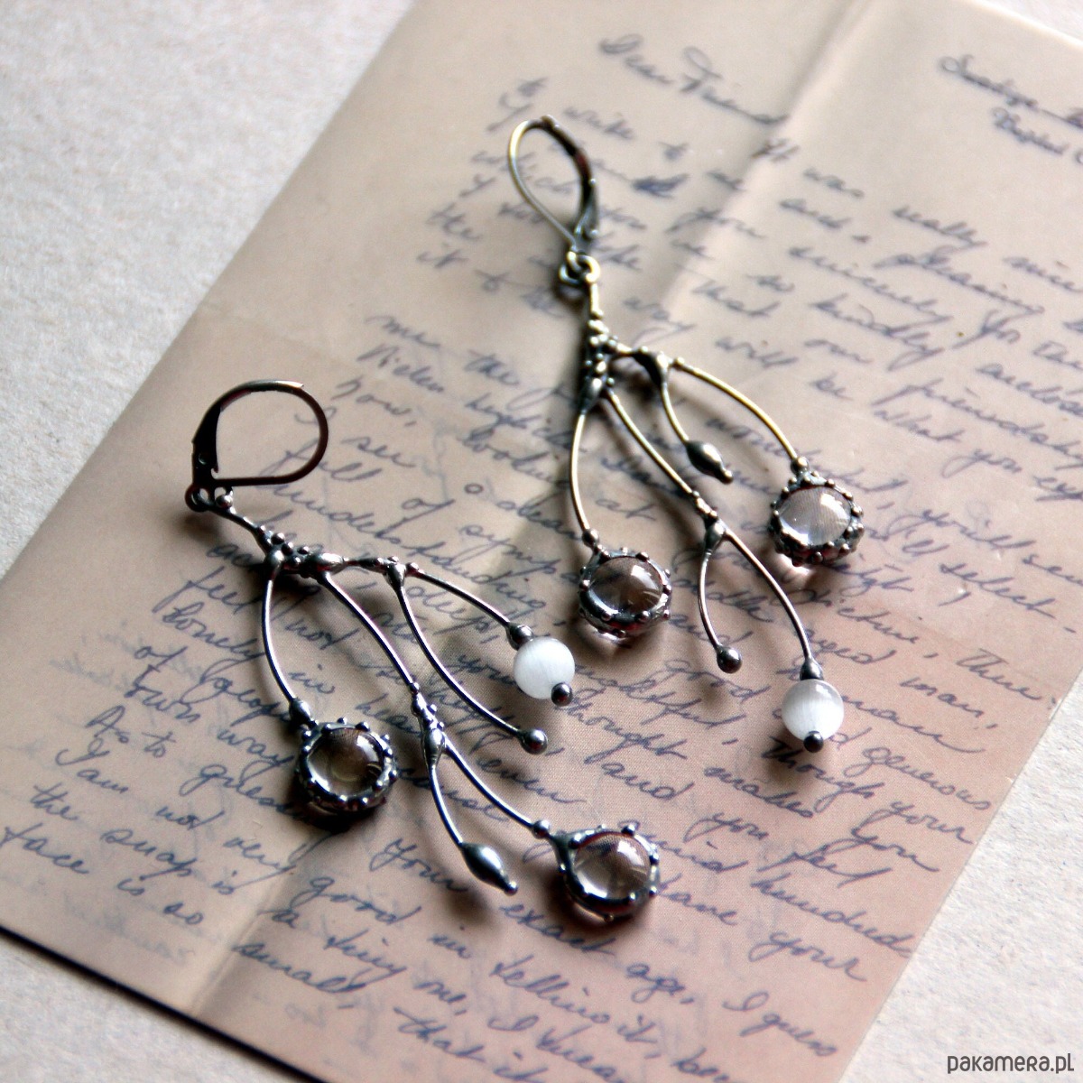 Asymetryczne kolczyki w kształcie gałęzi drzewa wykonane z miedzi, stopu cyny, stali i przezroczystego szkła. Lekkie, solidne i asymetryczne. Wszystkie elementy są wykonane ręcznie, co zapewnia indywidualność każdego produktu wytworzonego w warsztacie Yadovito. Stop cyny i miedzi jest polerowany roztworem wykończeniowym, aby nadać biżuterii szlachetny wygląd, a jednocześnie zapobiec utlenianiu się metalu. W kolczykach wykorzystano szkło stopione w specjalnym piecu. Po stopieniu szkło nabiera niemal unikalnego kształtu i niesamowitych odcieni kolorów, które mienią się w świetle. Rozmiar około 6/3 cm. Kolor srebrny.
