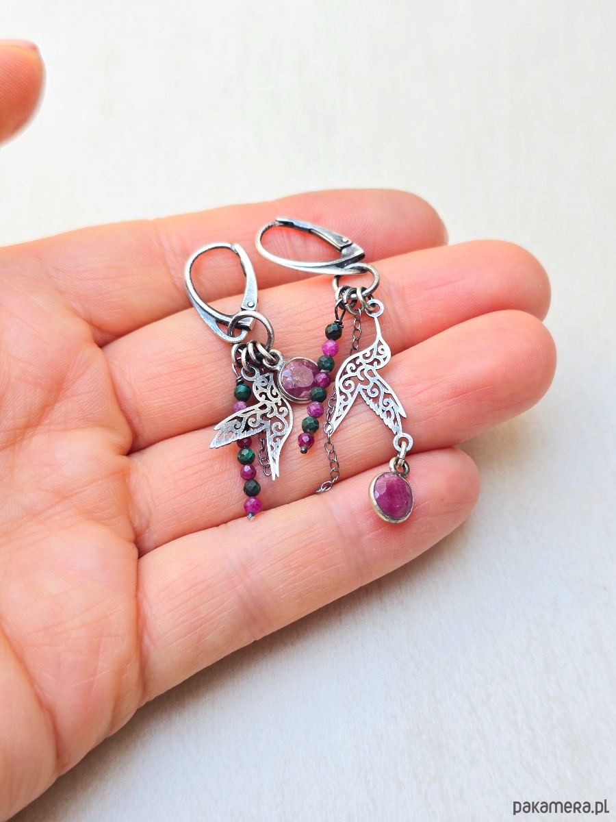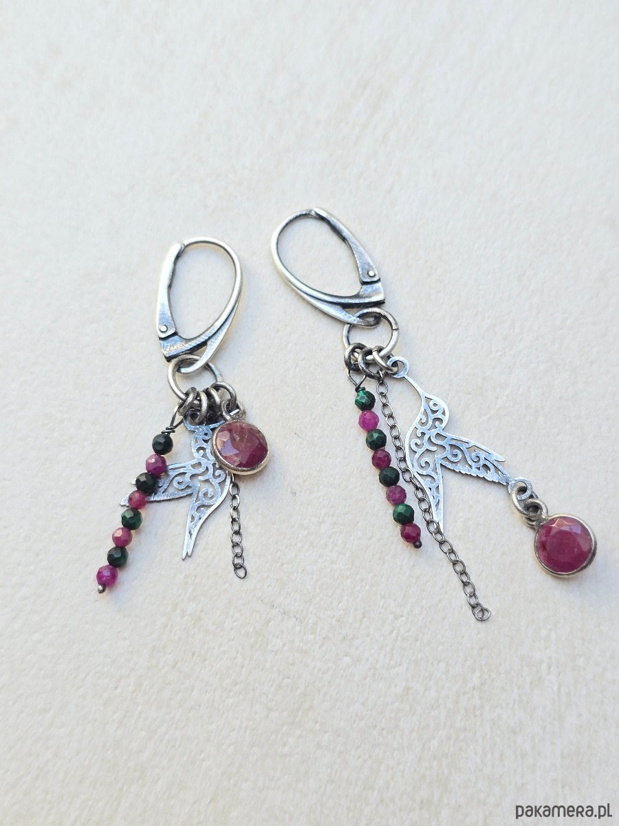 W kolczykach wykorzystane zostały kamienie rubinu i zielonego malachitu.