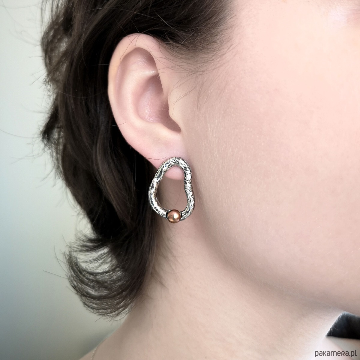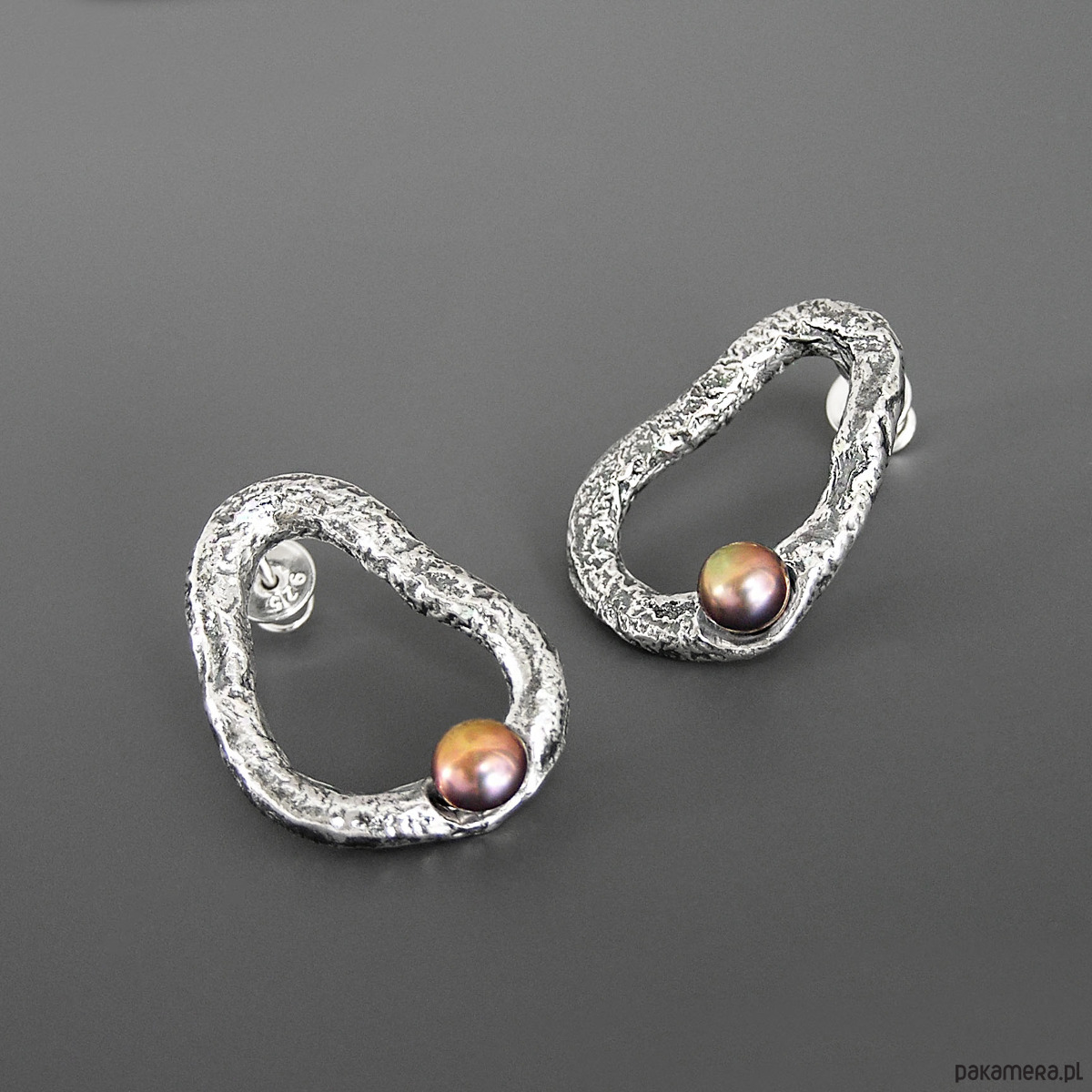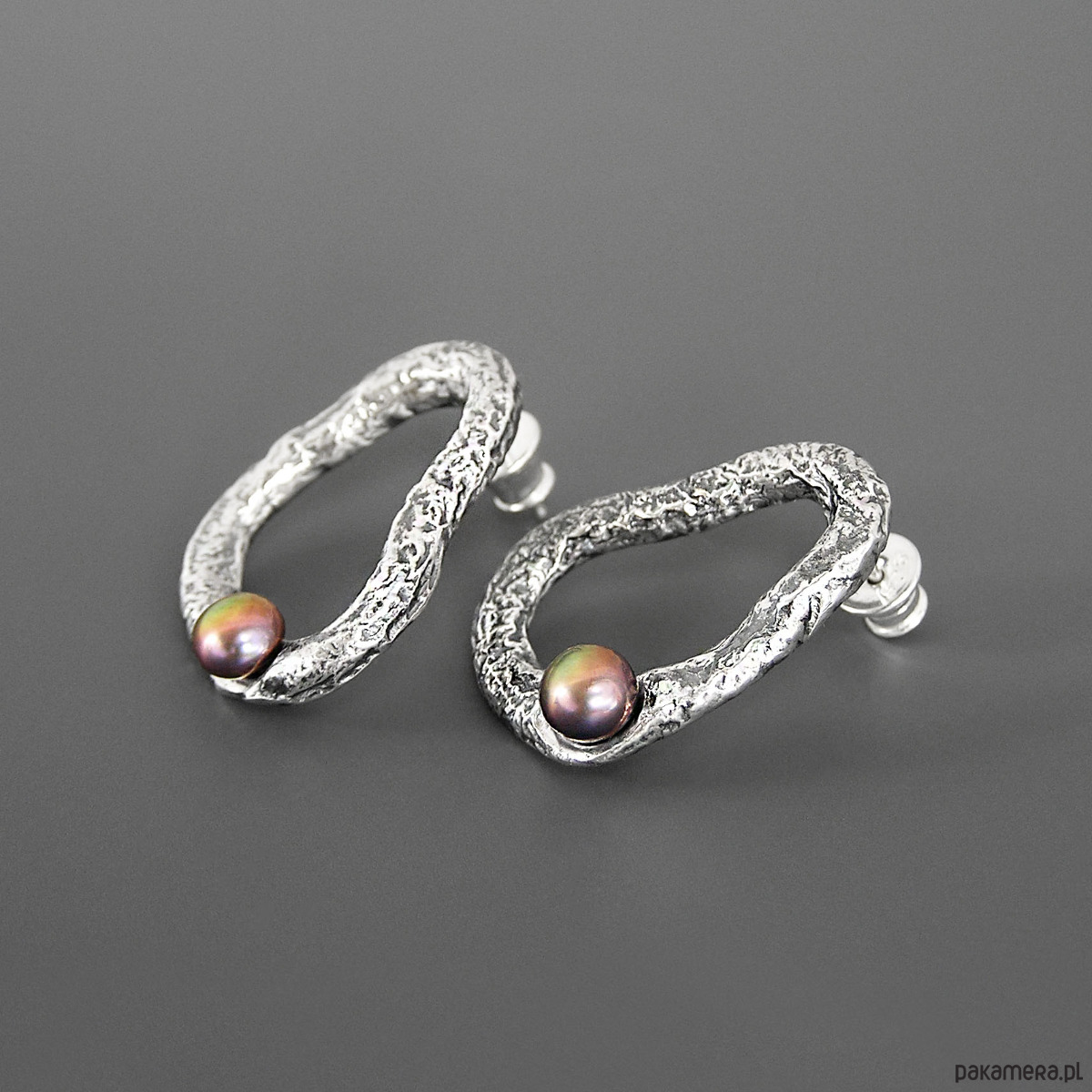 Unikatowe surowe kolczyki wykonane z flamowanego srebra 925 ze złoto-fioletowymi perłami. Patynowane i polerowane.