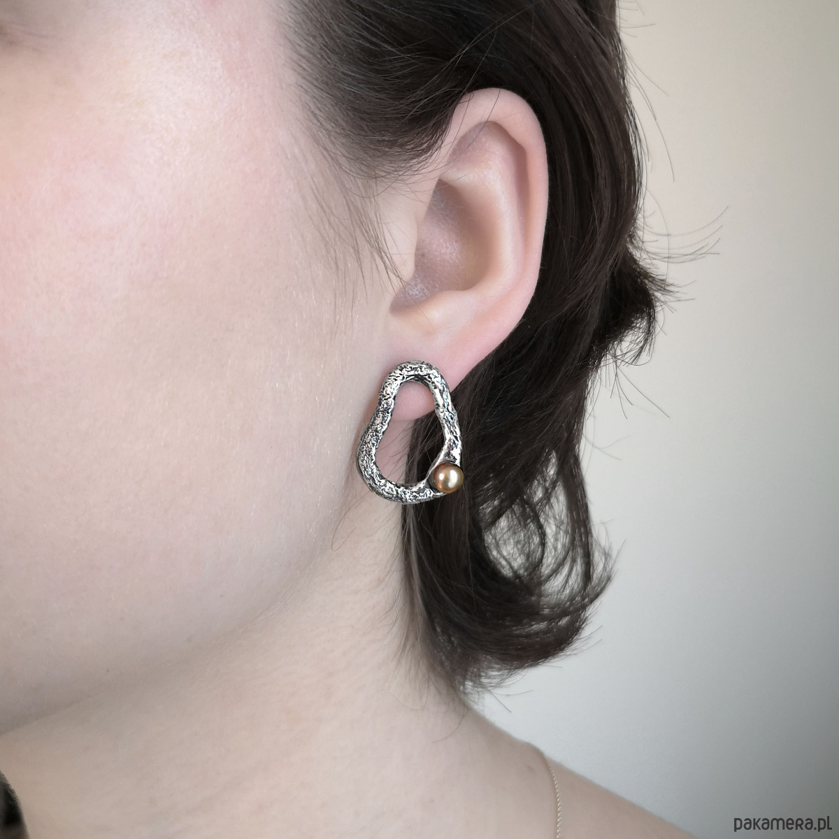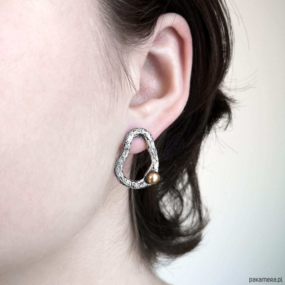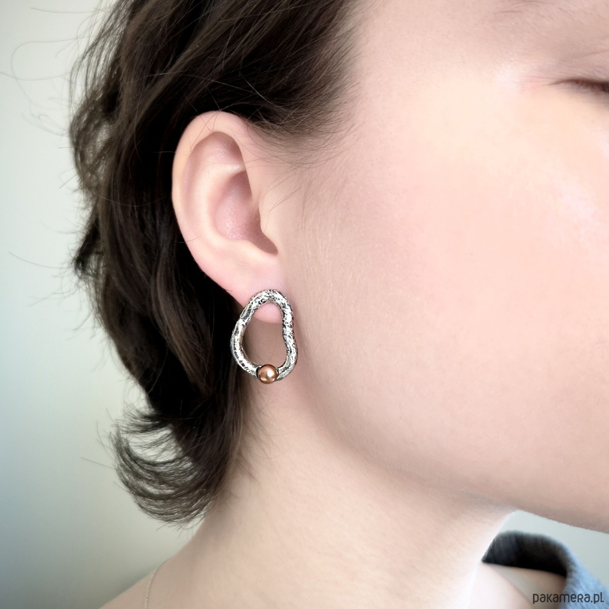 Unikatowe surowe kolczyki wykonane z flamowanego srebra 925 ze złoto-fioletowymi perłami. Patynowane i polerowane.