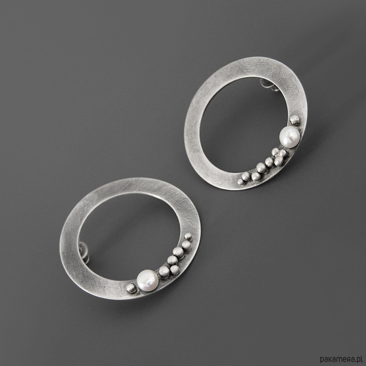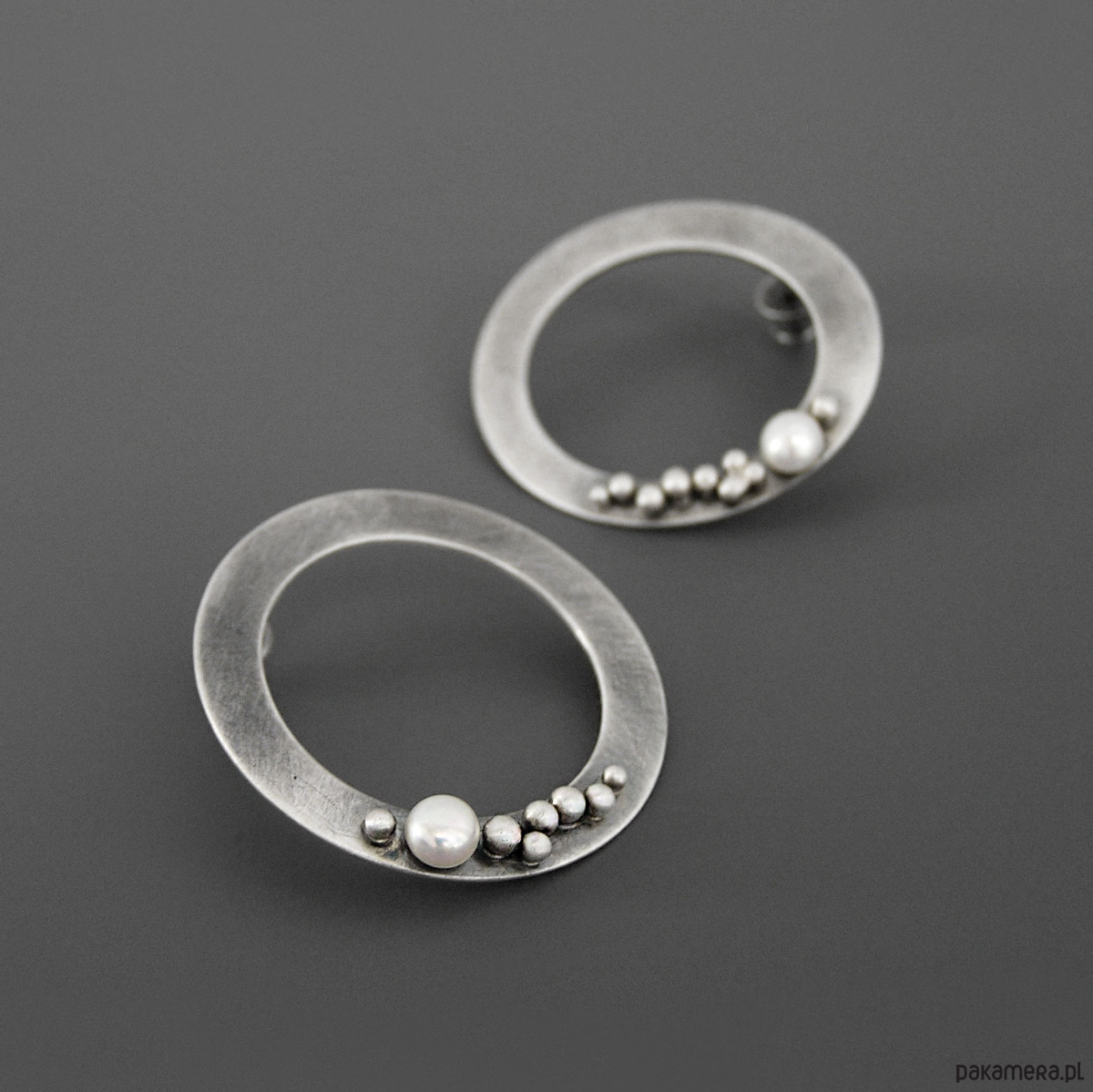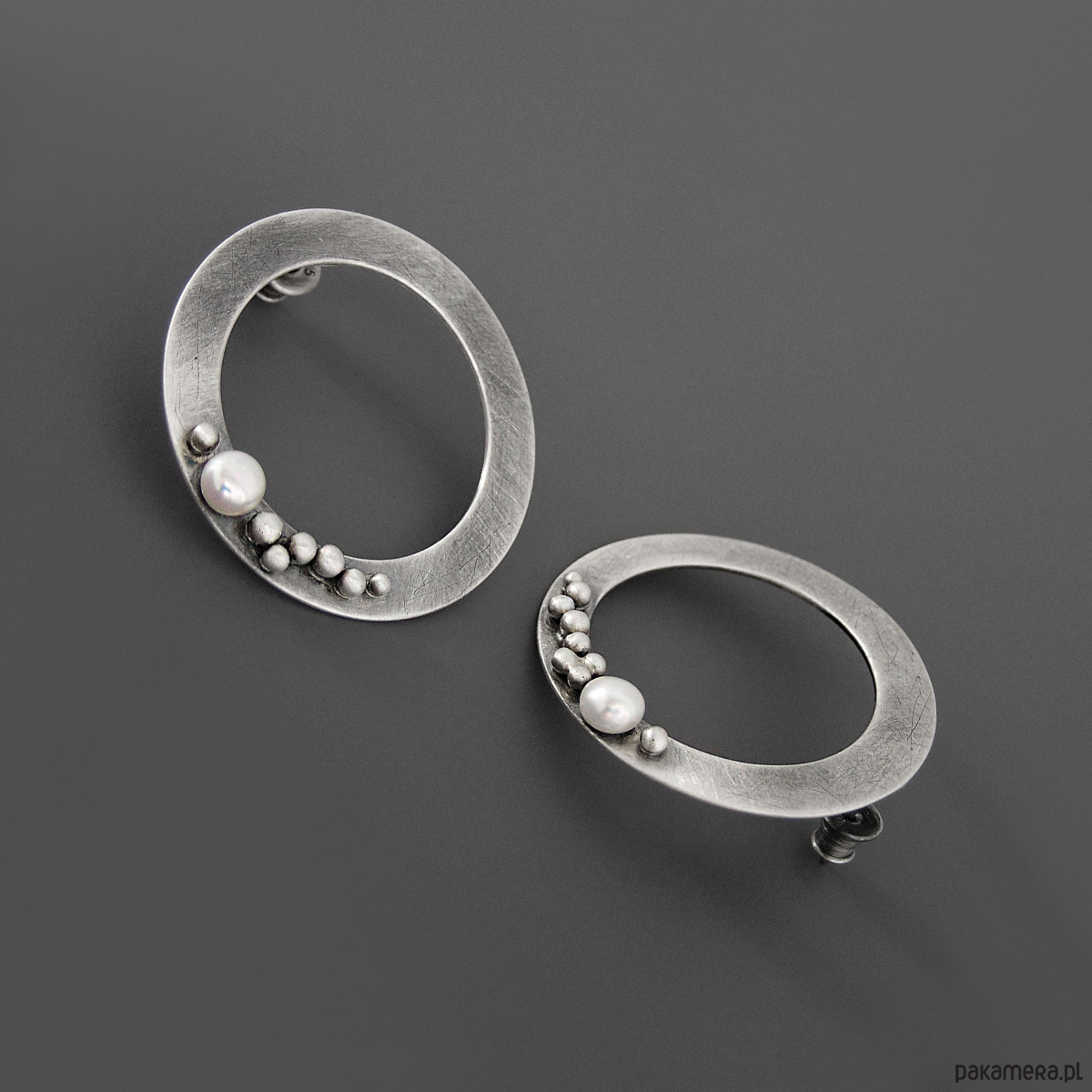 Unikatowe asymetryczne kolczyki wykonane ze srebra 925 z białymi perłami. Patynowane i szczotkowane.