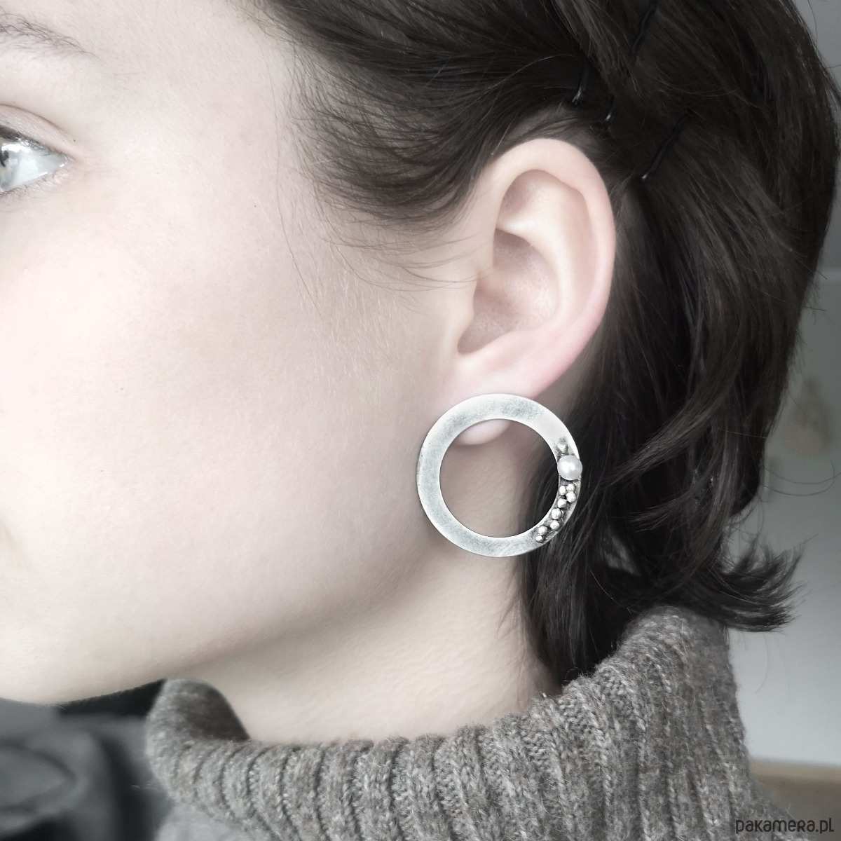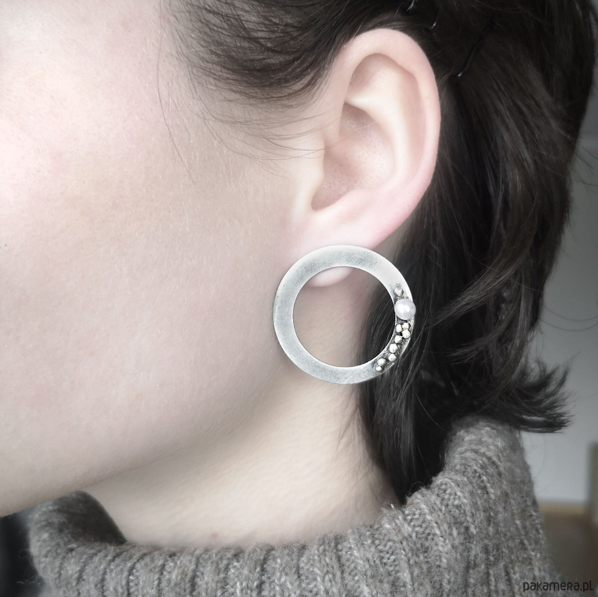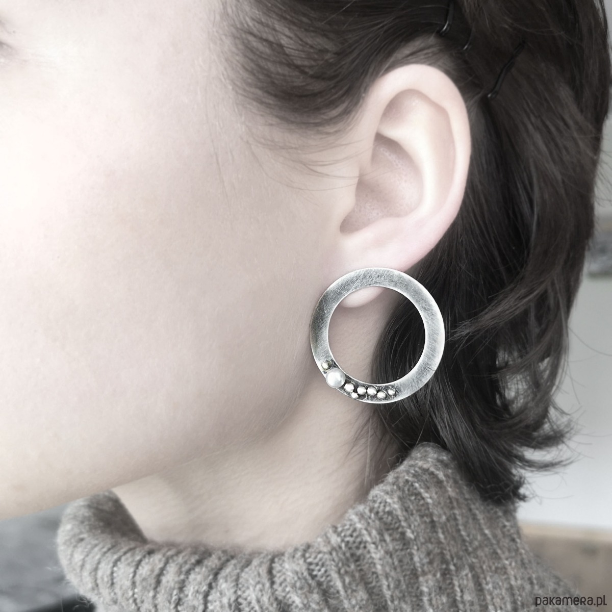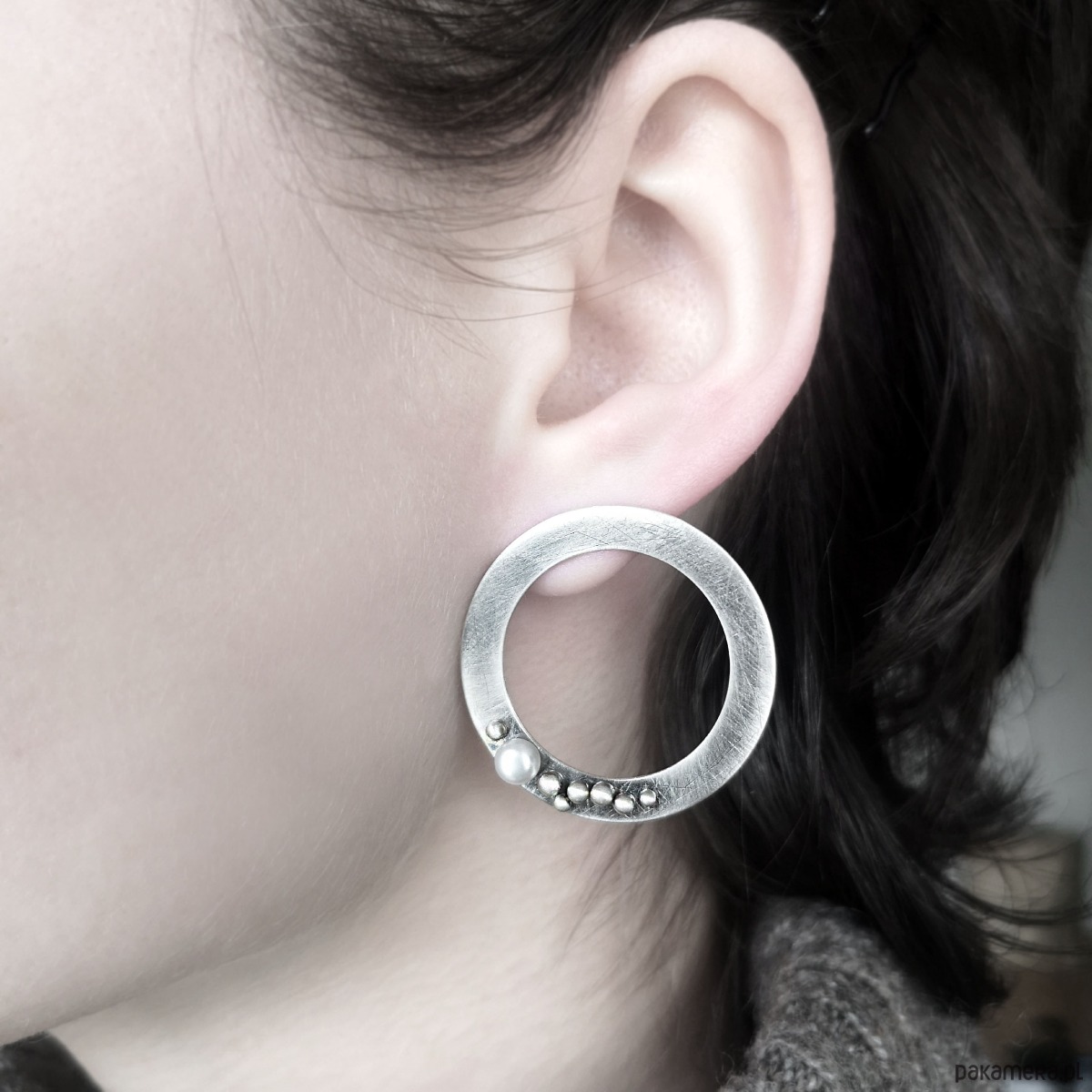 Unikatowe asymetryczne kolczyki wykonane ze srebra 925 z białymi perłami. Patynowane i szczotkowane.