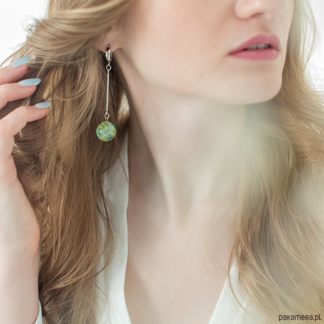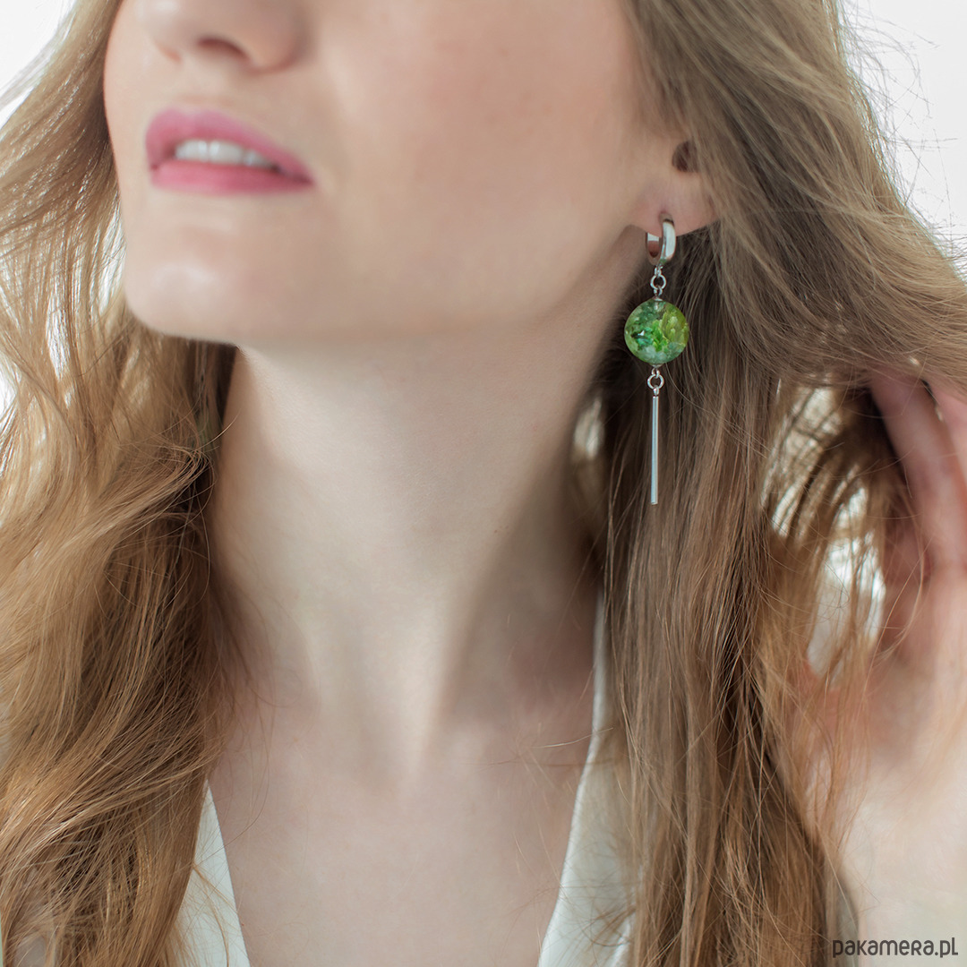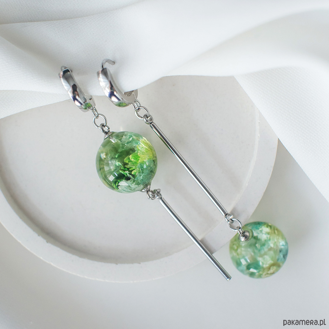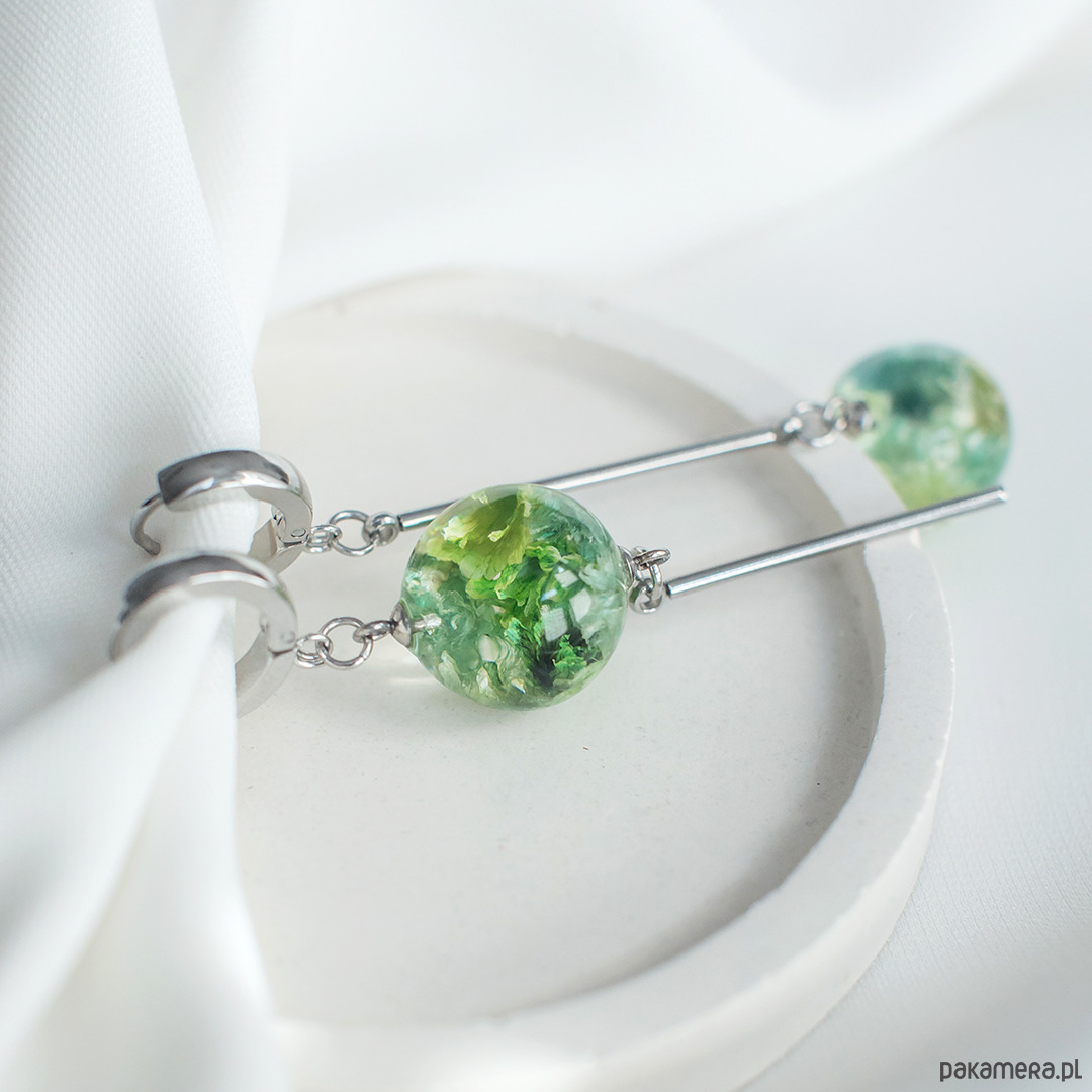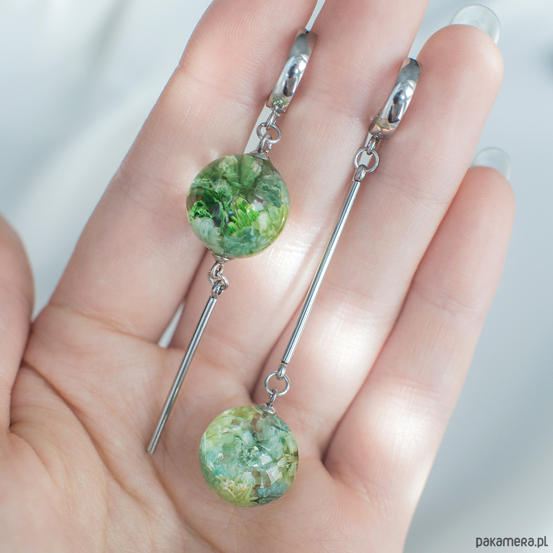Kolczyki wykonany jest z żywicy epoksydowej z wykorzystaniem suszonych kwiatów. Metalowe elementy to stal nierdzewna szlachetna chirurgiczna.