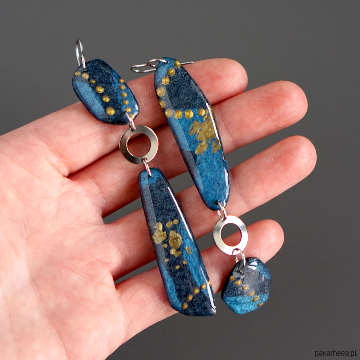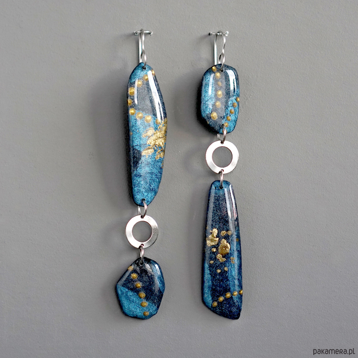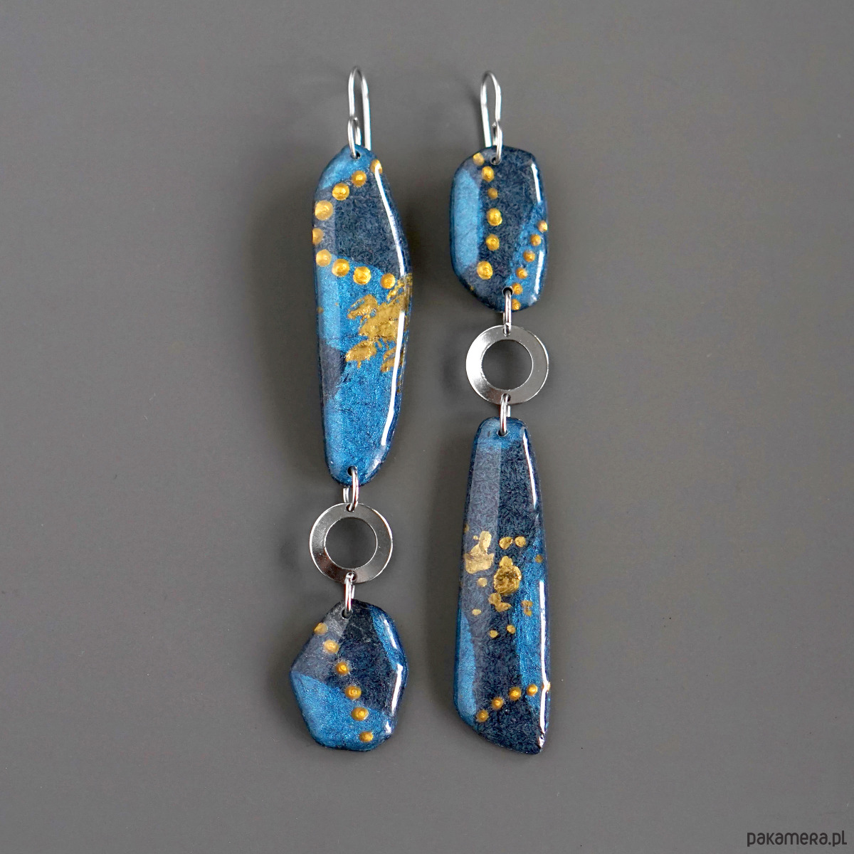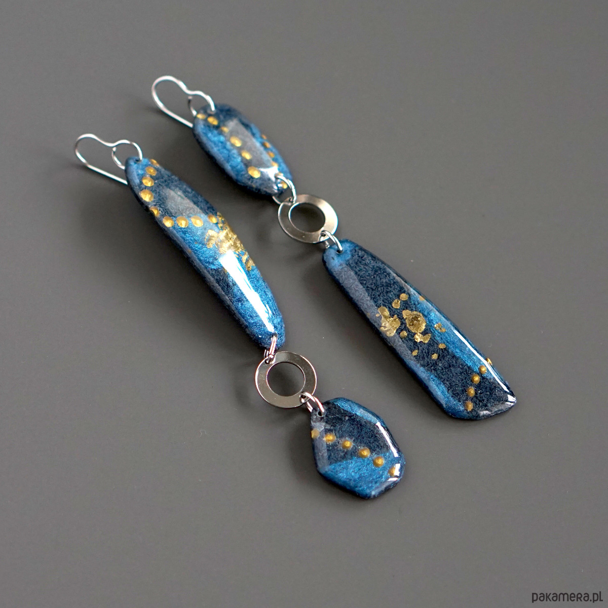 Długie, niebieskie kolczyki, zaprojektowane tak, aby przyciągać spojrzenia.