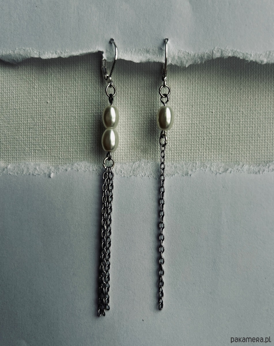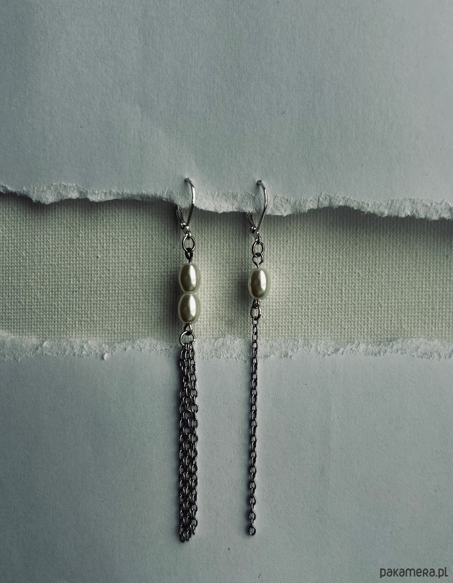 Asymetryczne kolczyki z perełkami i łańcuszkami BALANS. Agrafka STUDIO